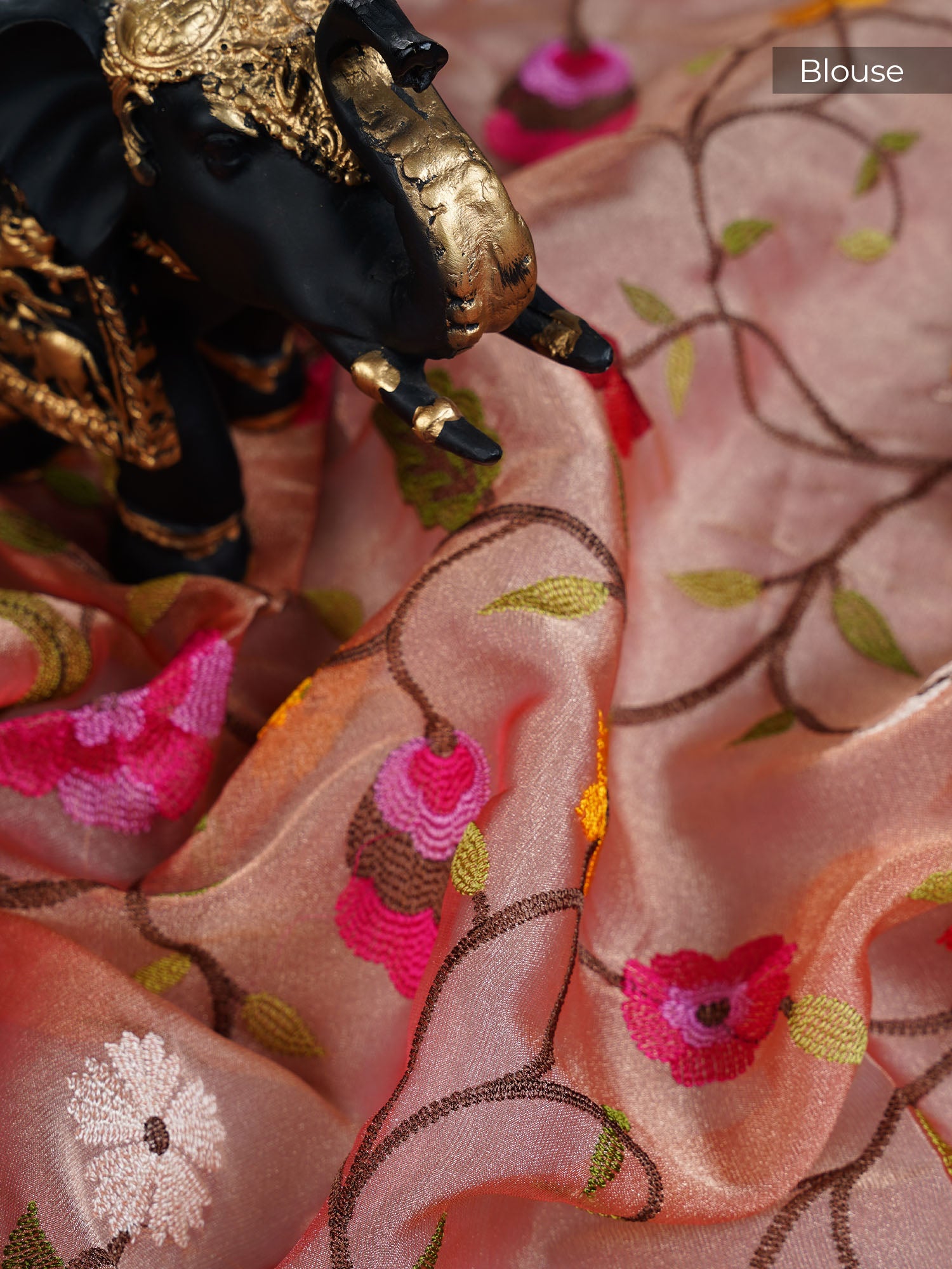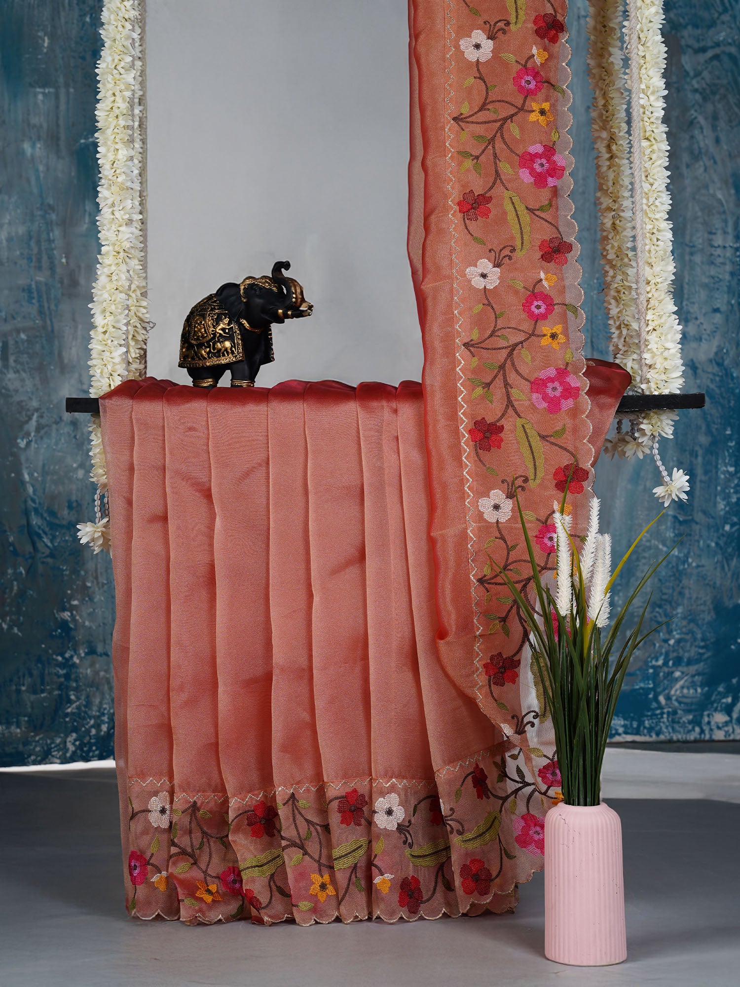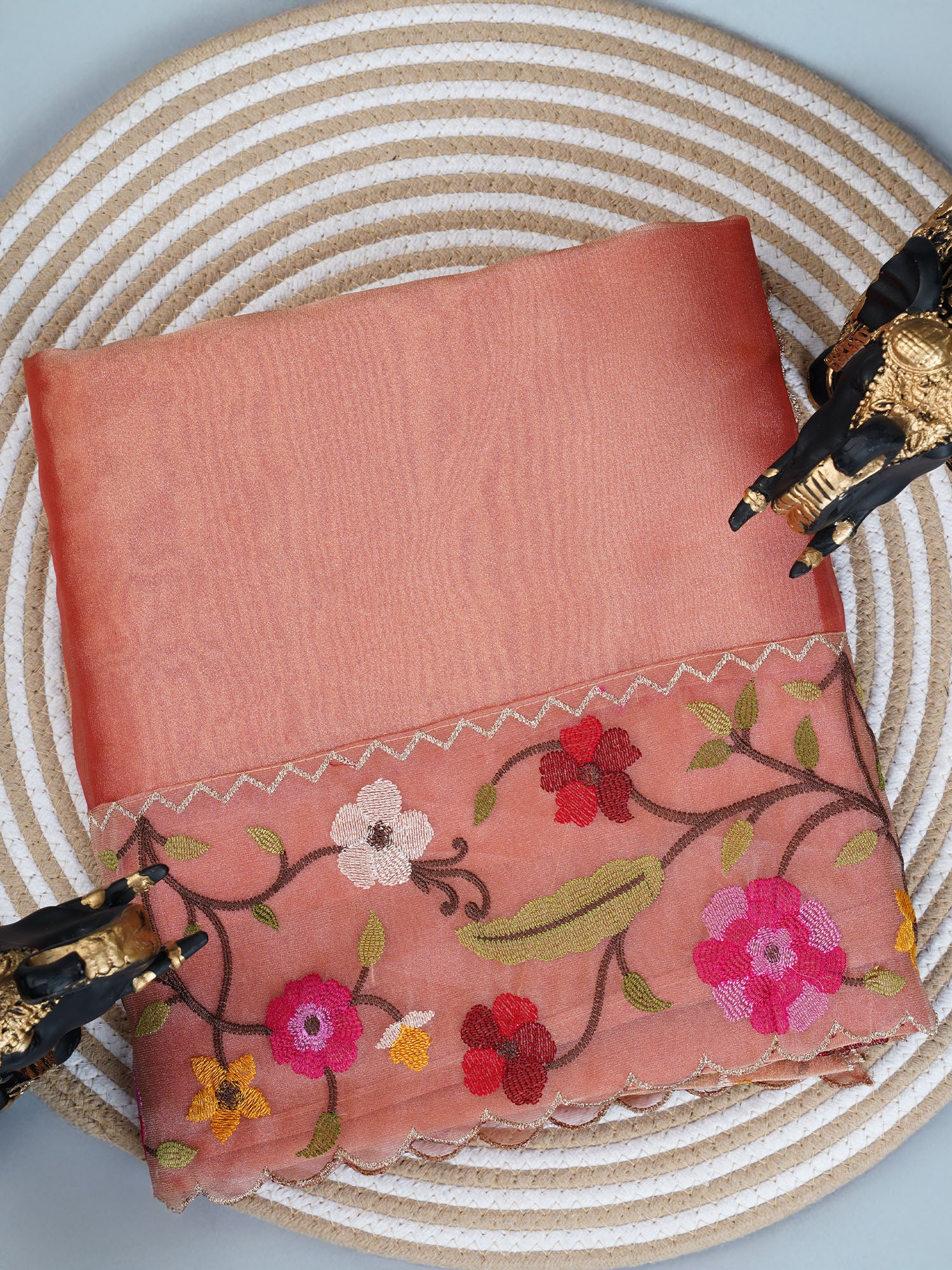 Soft tissue Organza saree with Thread work and scallop border - Peach