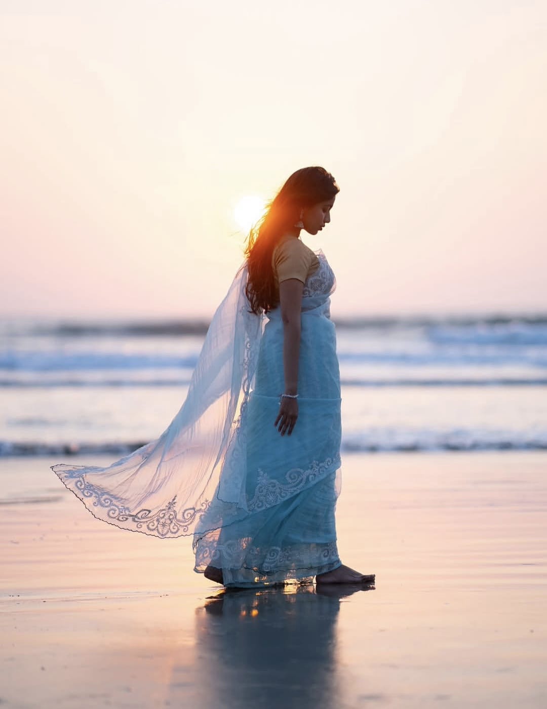 Dive into elegance with this stunning sea blue saree that's as breezy as a coastal breeze. Crafted from soft tissue organza, it drapes like a dream while maintaining that perfect lightweight feel for all-day comfort. The intricate thread work scallop border adds a playful touch of sophistication—think delicate waves dancing along the edges. Whether you're attending a festive gathering or making a graceful entrance at a special occasion, this saree effortlessly blends traditional charm with contemporary flair. A versatile wardrobe essential that celebrates your love for refined, textured fabrics.