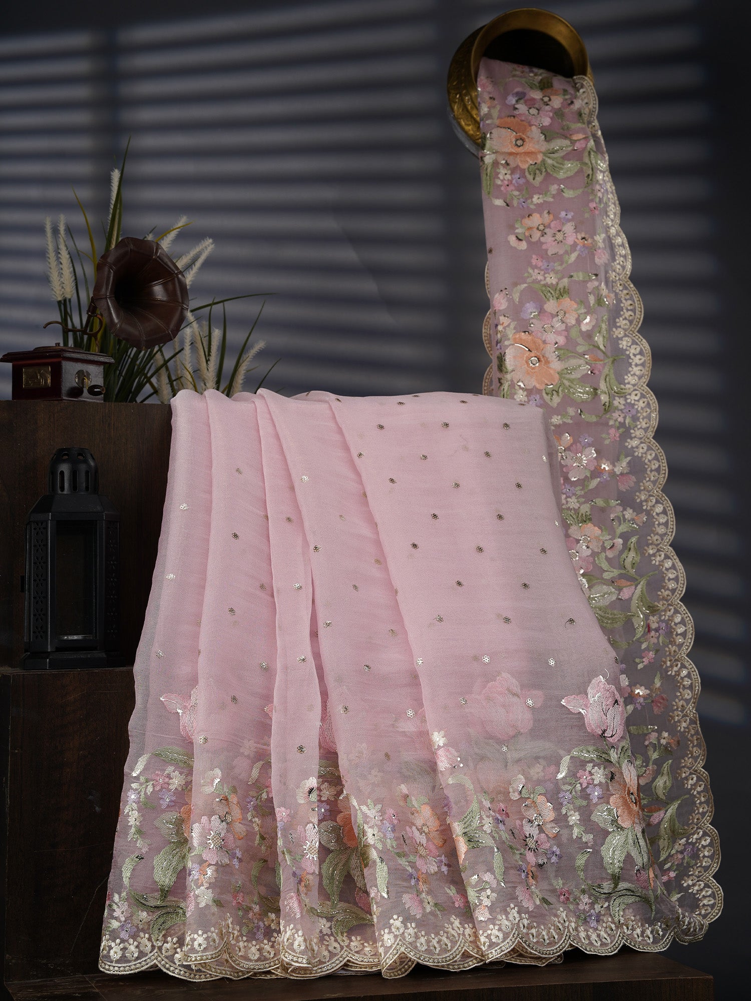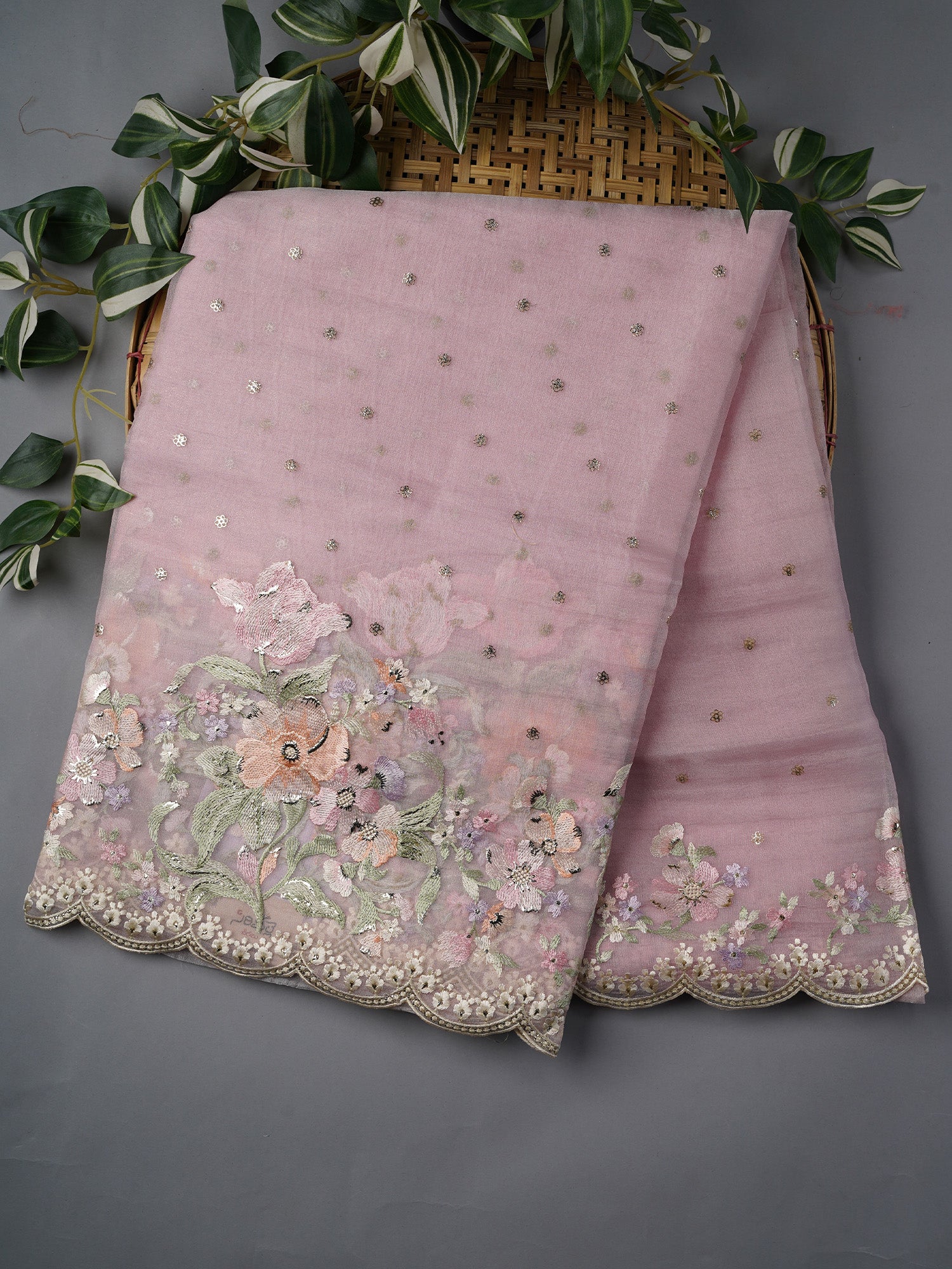 Soft Tissue Organza Silk With Thread Embroidery Scallop Border With Sequence Butties - Pink