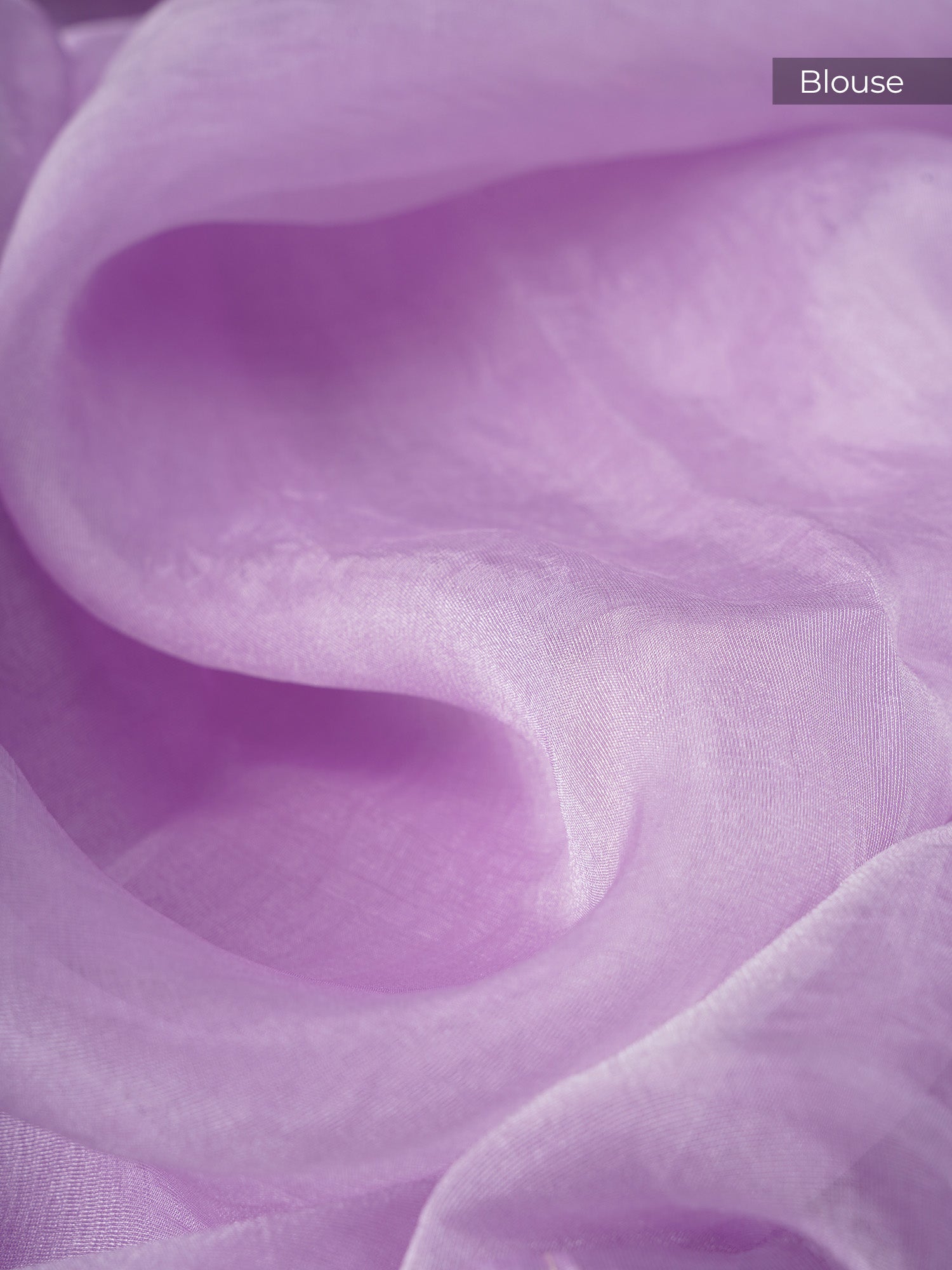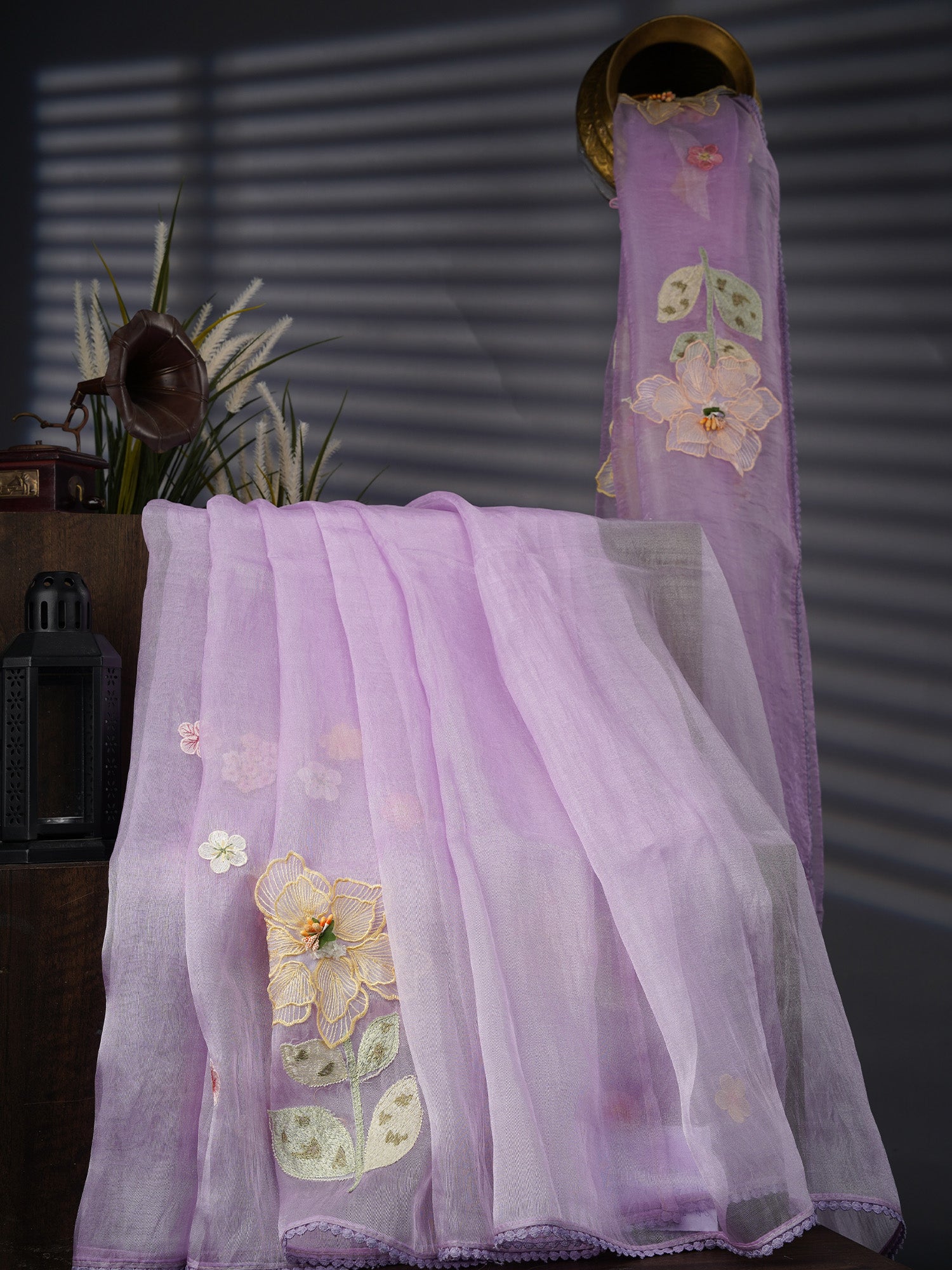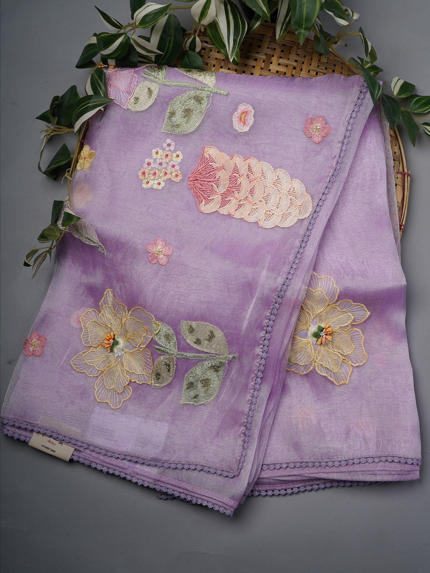 Soft Tissue Organza Silk With Thread Embroidery Work And Lace Border - Lavender