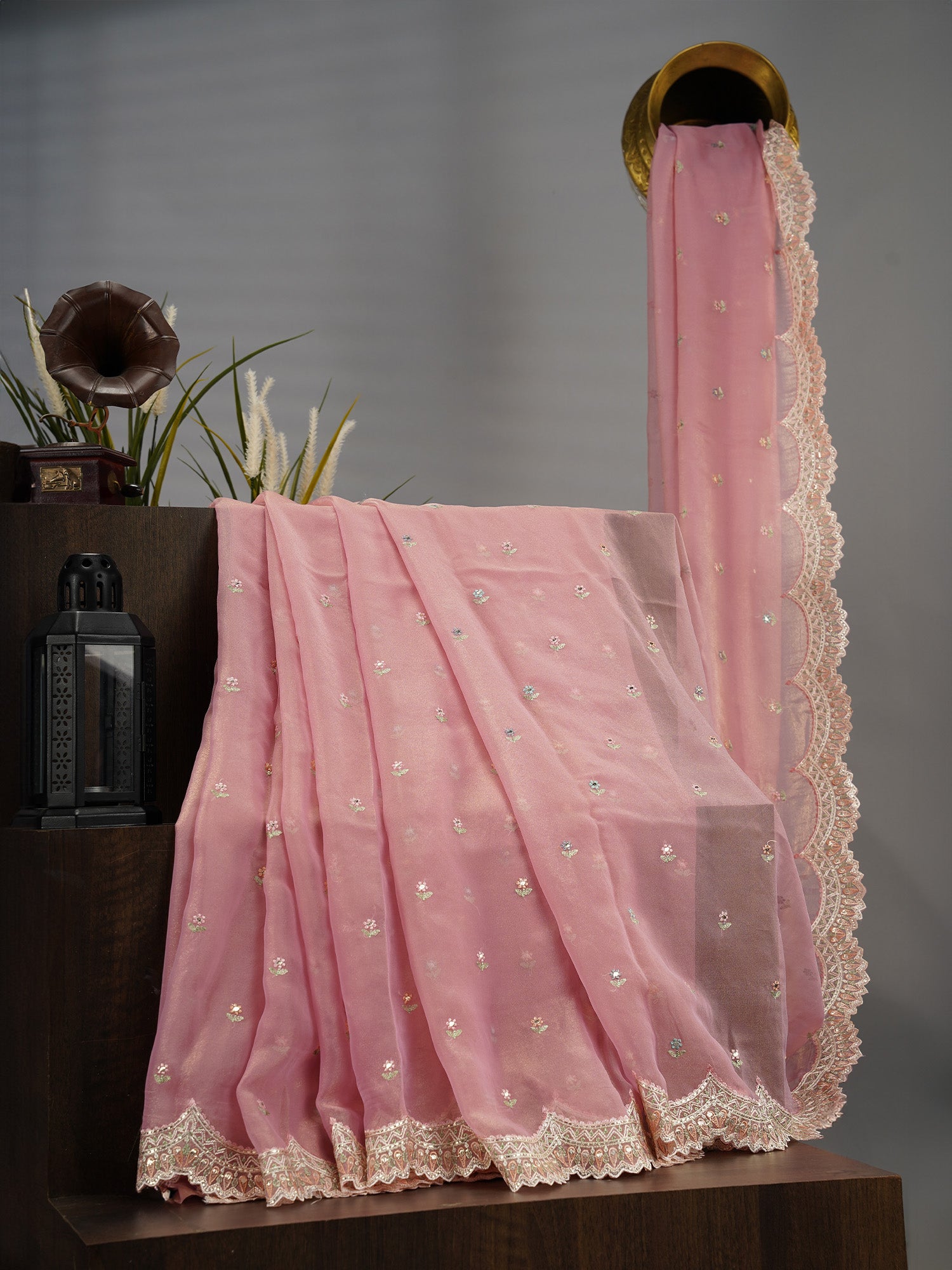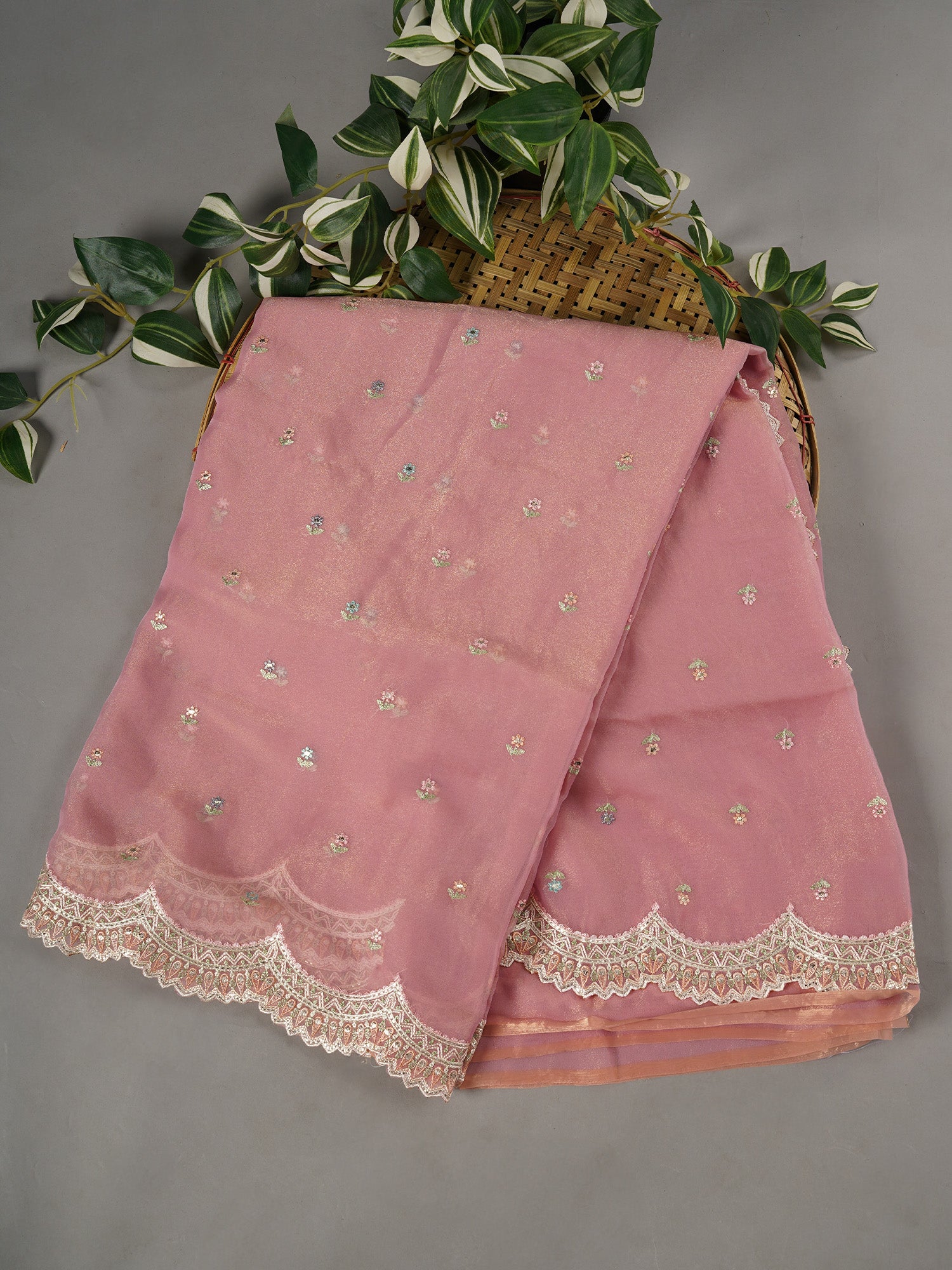 This delicate soft tissue organza fabric features intricate thread embroidery butties, enhanced by a graceful scallop border in a vibrant...