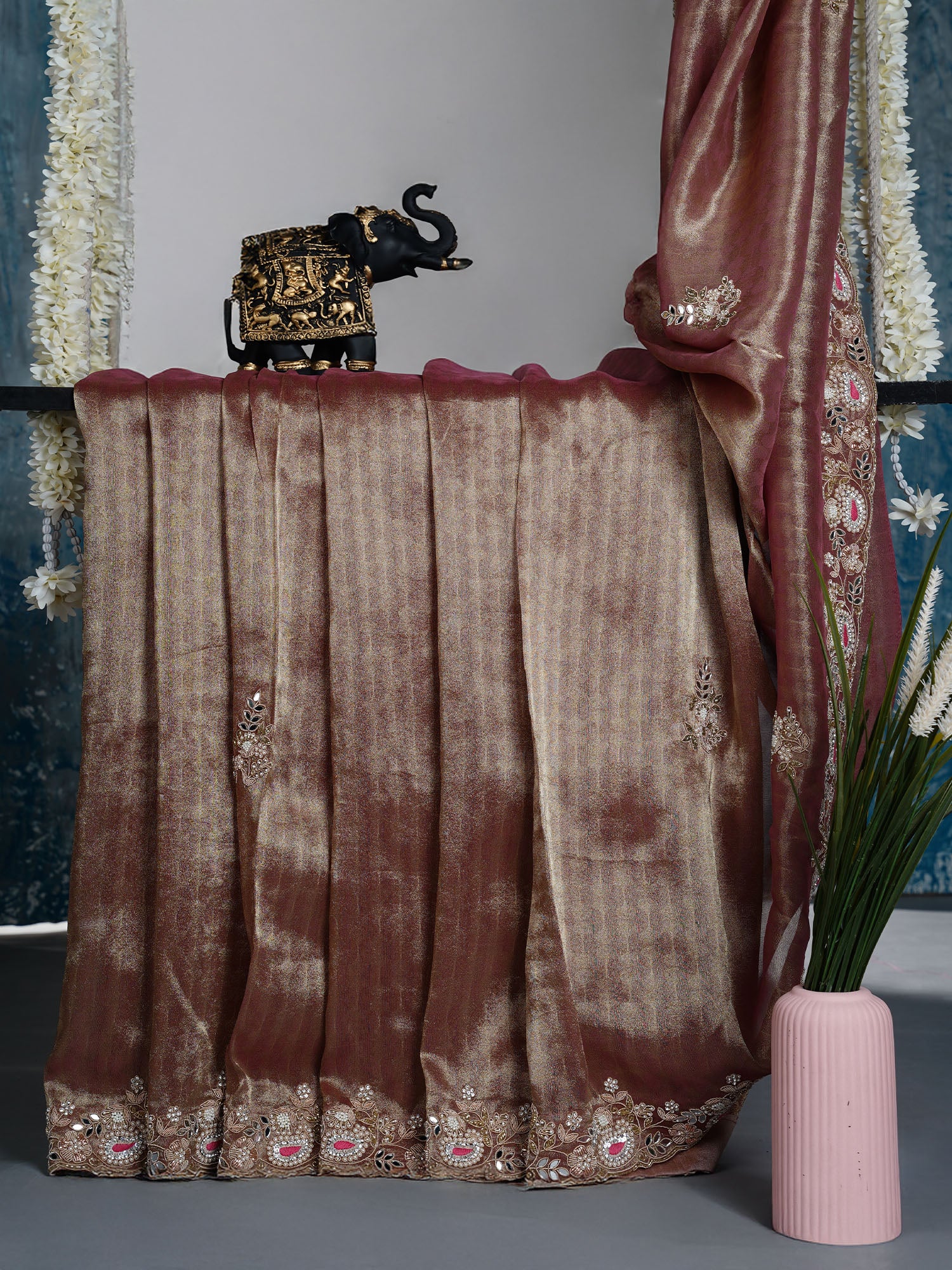 Drape yourself in elegance with this stunning soft tissue saree, where delicate embroidery dances across the fabric in intricate butties...