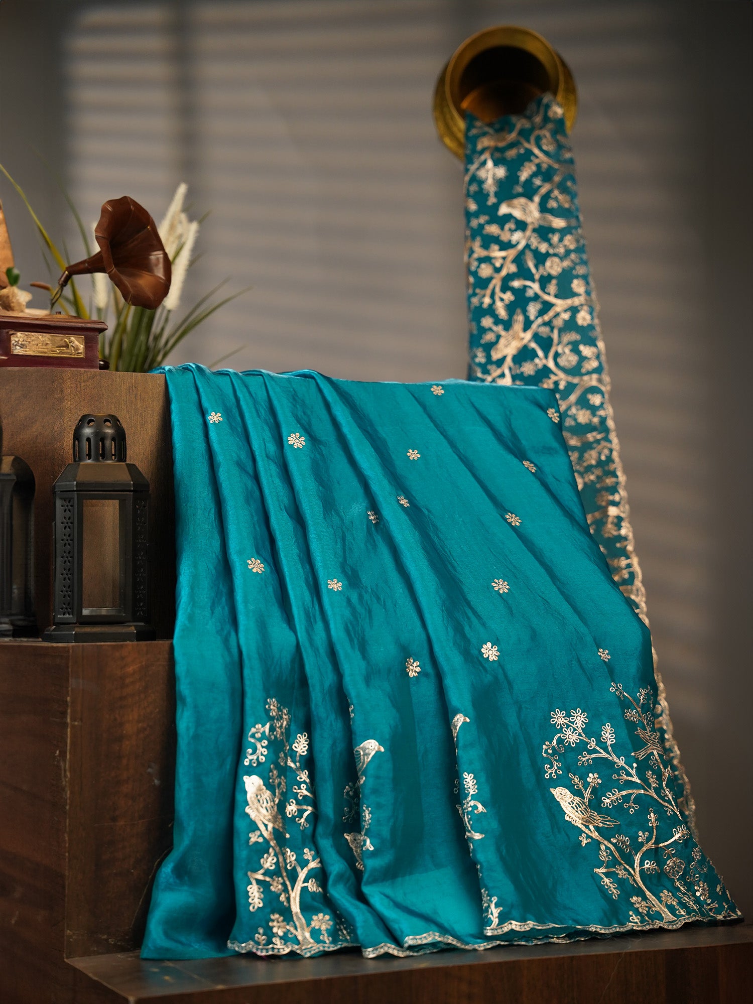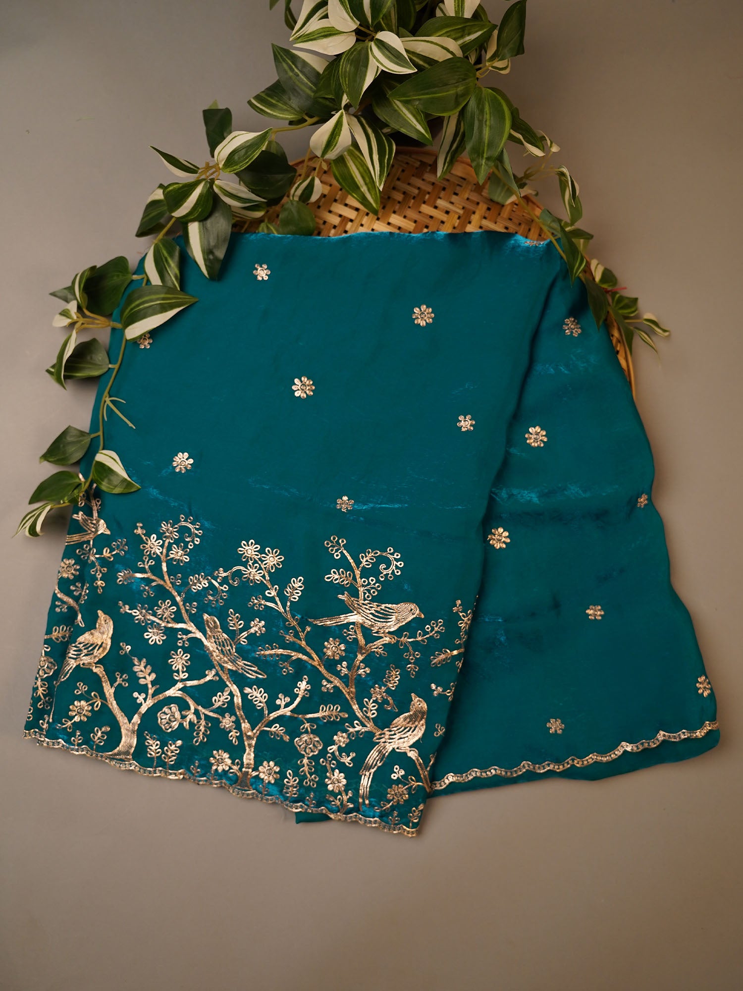 Drape yourself in pure elegance with this stunning Rama Green velvet saree that feels as luxurious as it looks. The soft, plush velvet fabric glides beautifully against your skin, while intricate gold Laharia pattern work adds a touch of traditional charm. The delicate scallop border frames the saree perfectly, creating a sophisticated silhouette that's ideal for festive celebrations, weddings, or special occasions. This timeless piece effortlessly blends comfort with glamour, making you feel absolutely radiant. Perfect for those who appreciate fine craftsmanship and want to make a graceful statement.