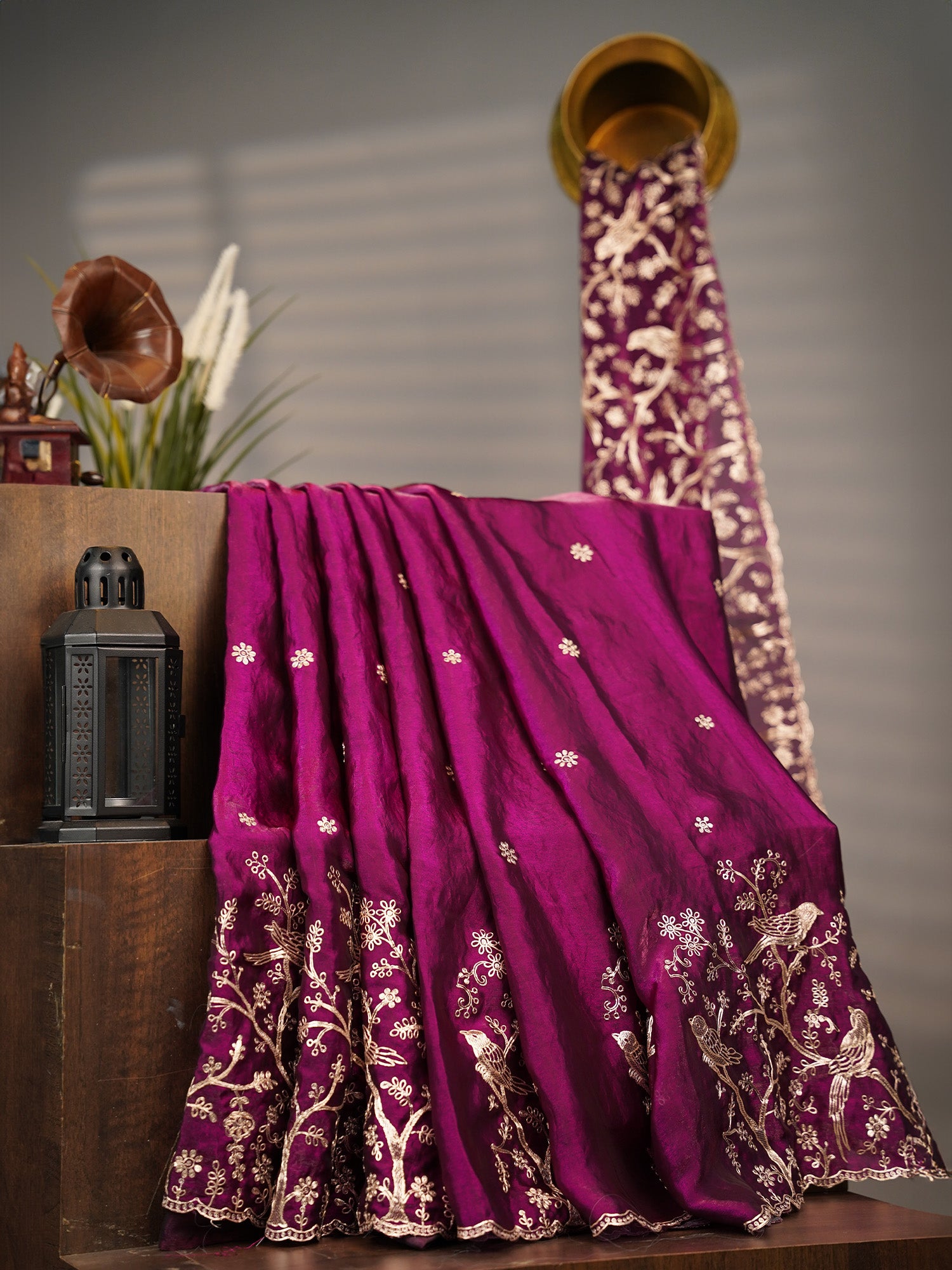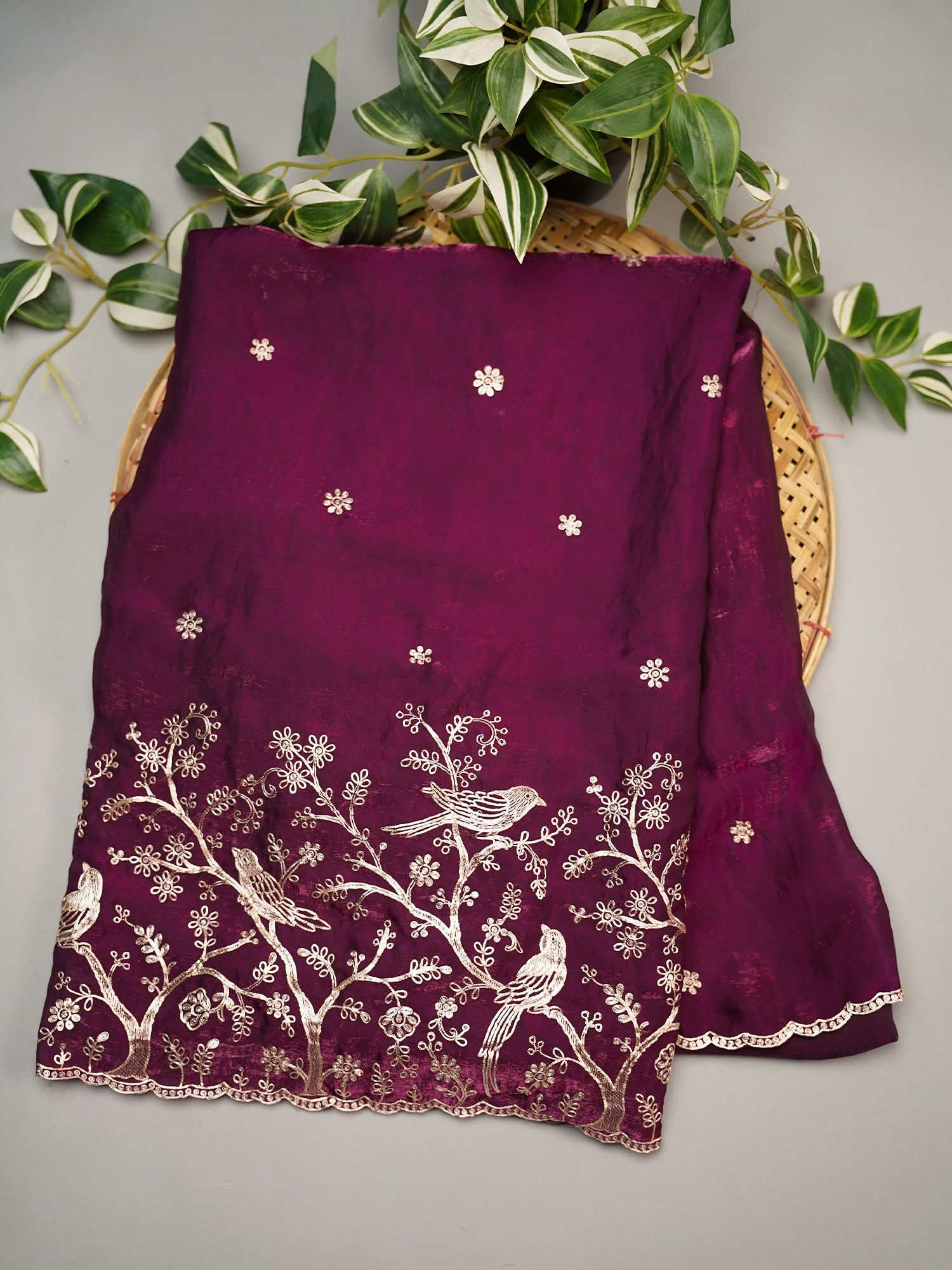 Drape yourself in pure elegance with this stunning purple velvet saree that feels as luxurious as it looks. The soft, plush velvet fabric glides beautifully against your skin, while intricate gold zari peta work adds a touch of regal sophistication. Delicate scallop detailing along the borders creates a charming, feminine finish that catches every eye. Perfect for weddings, celebrations, or whenever you want to feel absolutely fabulous. This saree effortlessly transforms you into the showstopper of any gathering, blending traditional craftsmanship with modern comfort.