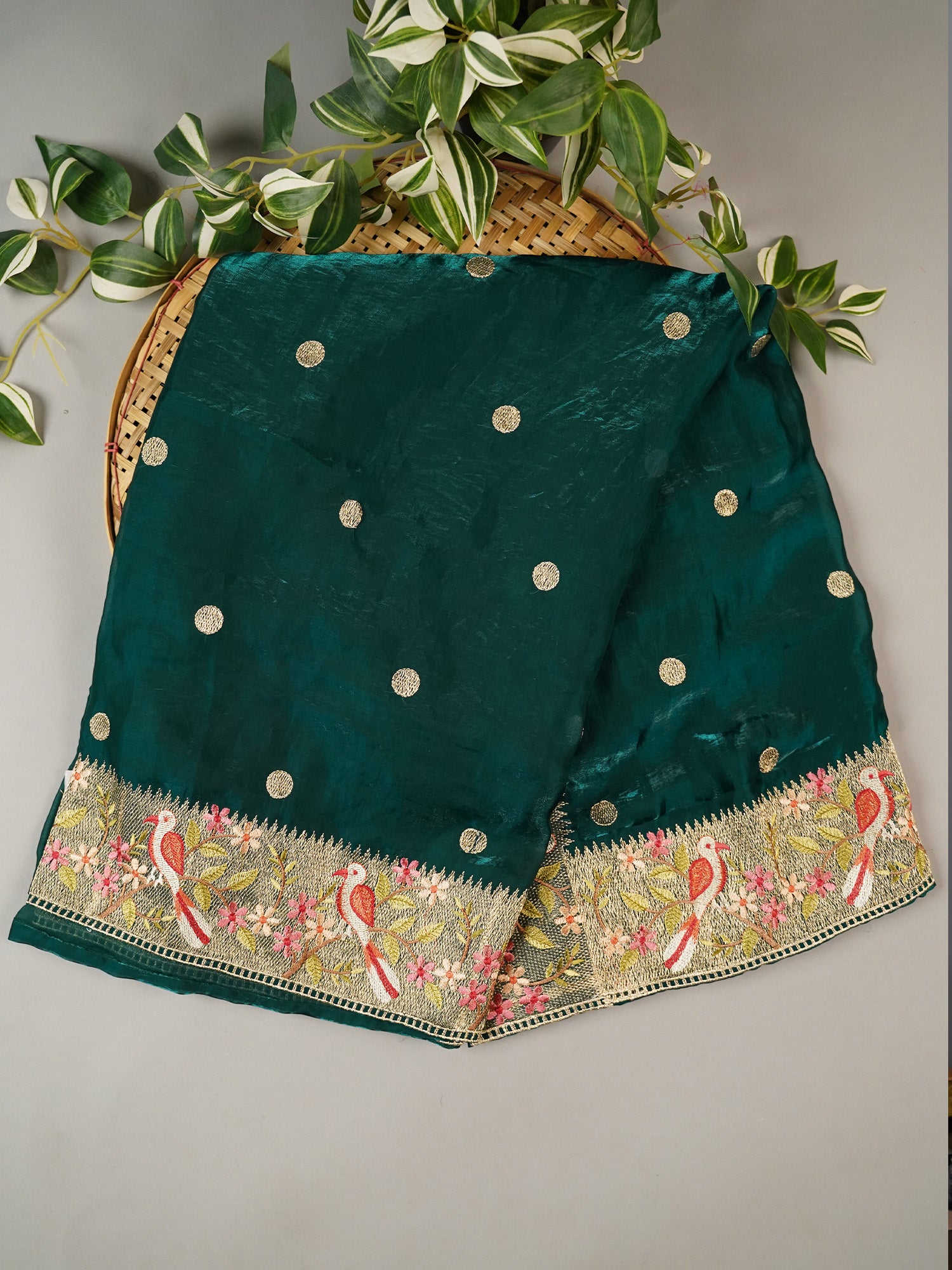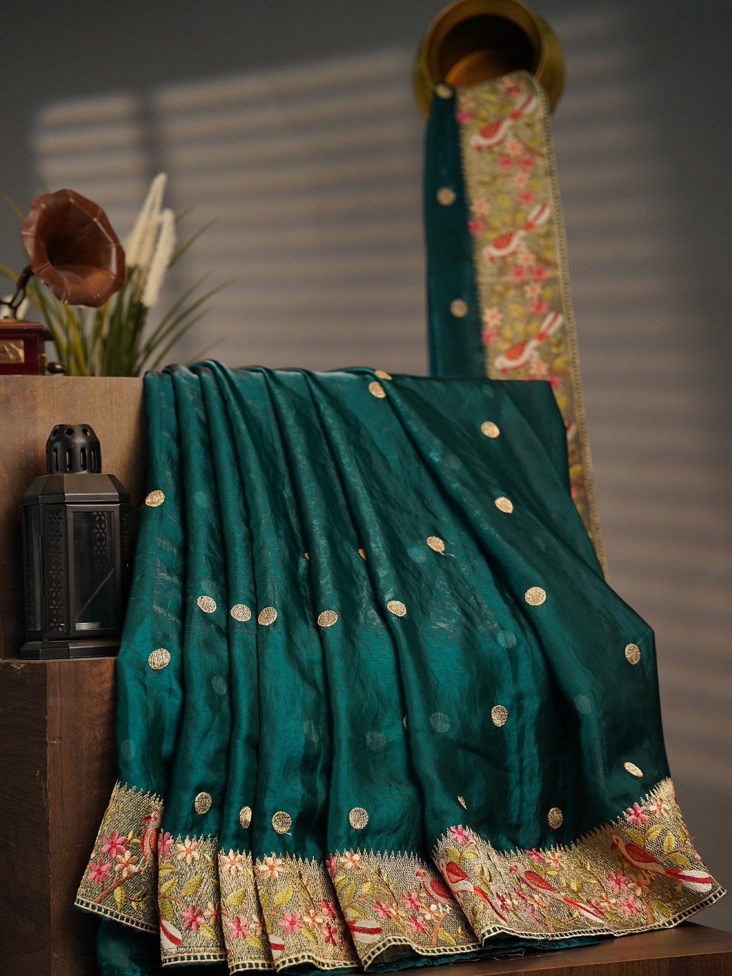 Wrap yourself in luxurious softness with this stunning bottle green velvet saree! The plush velvet fabric feels like a gentle caress against your skin, while the intricately embroidered thread border adds a touch of timeless elegance. Perfect for festive occasions, celebrations, or whenever you want to feel absolutely fabulous. The rich, deep green hue flatters all skin tones and pairs beautifully with traditional jewelry. Drape it with confidence and let the exquisite craftsmanship do the talking. A wardrobe essential that brings together comfort and sophistication in one gorgeous package.