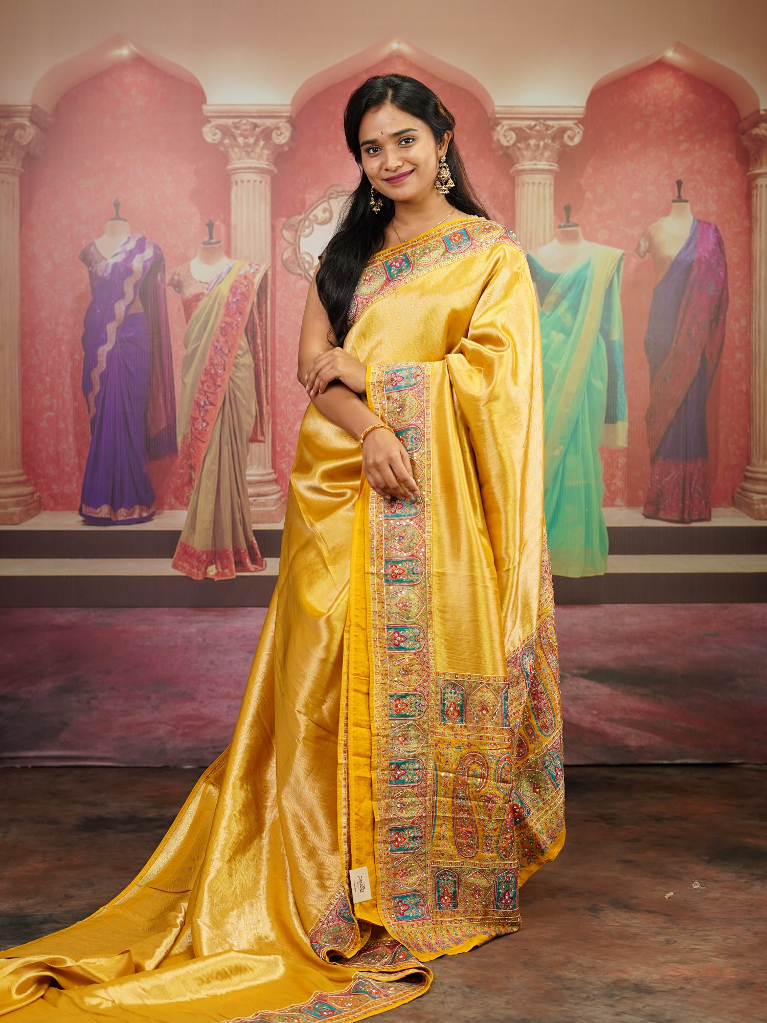 Drape yourself in sunshine with this stunning Tissue Banaras saree! The rich mustard yellow hue radiates warmth and elegance, while the delicate tissue fabric offers a feather-light drape that moves beautifully. Adorned with an intricate Pashmina border featuring traditional Banaras weaving, this saree blends timeless craftsmanship with contemporary charm. Perfect for festive occasions, celebrations, or when you want to turn heads with understated sophistication. A wardrobe essential that proves luxury doesn't have to be heavy!