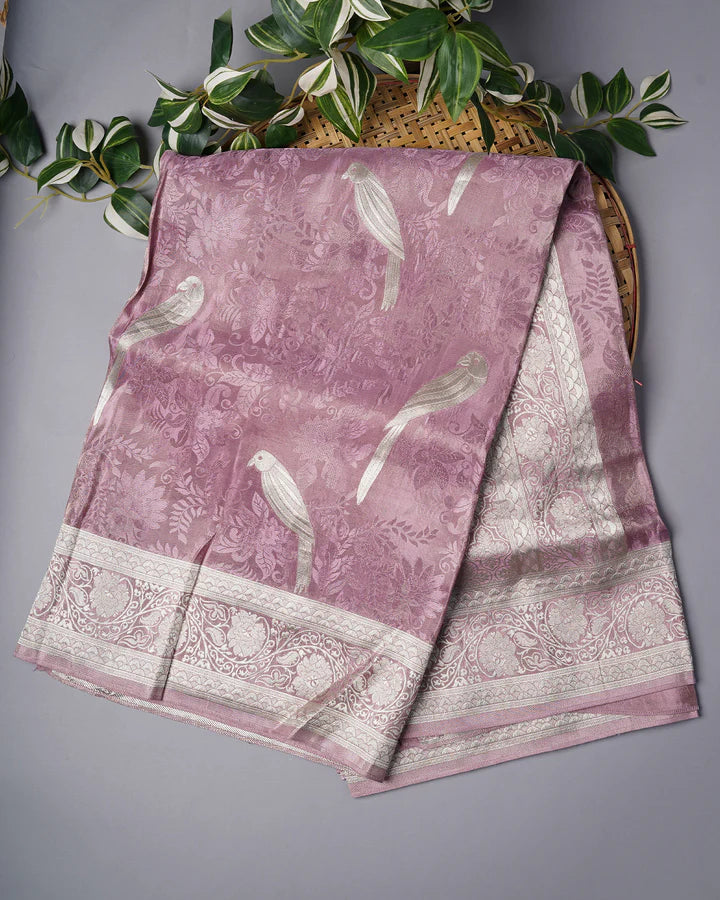 Elevate your ethnic wardrobe with this exquisite Tissue Banaras silk saree in serene lavender. The allover self-weaving creates an intricate, dimensional texture that catches light beautifully, while the delicate light gold zari border adds refined sophistication. Crafted from premium tissue silk, this saree drapes gracefully with a luxurious sheen, making it ideal for weddings, festivals, and special occasions. The subtle interplay of lavender and gold creates a timeless aesthetic that complements various skin tones. Perfect for the discerning wearer who appreciates traditional craftsmanship with contemporary elegance.