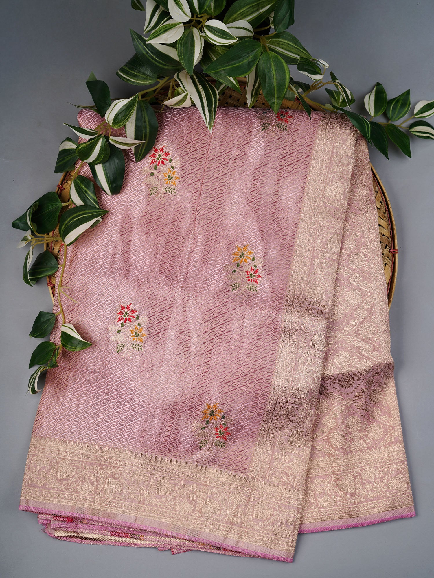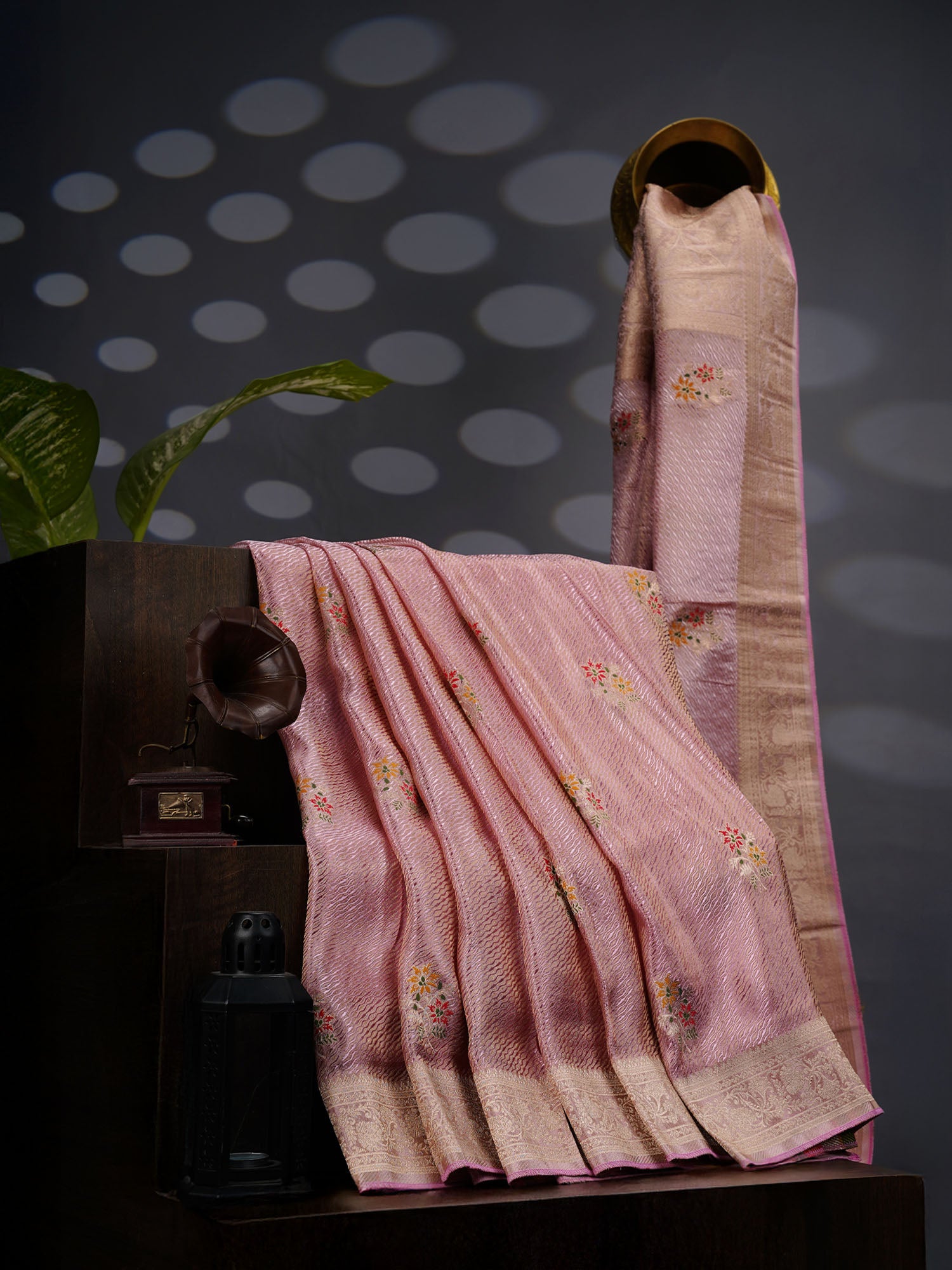 Tissue Banarasi Silk Saree With Meenakari Butties & Gold Zari Border - Baby Pink