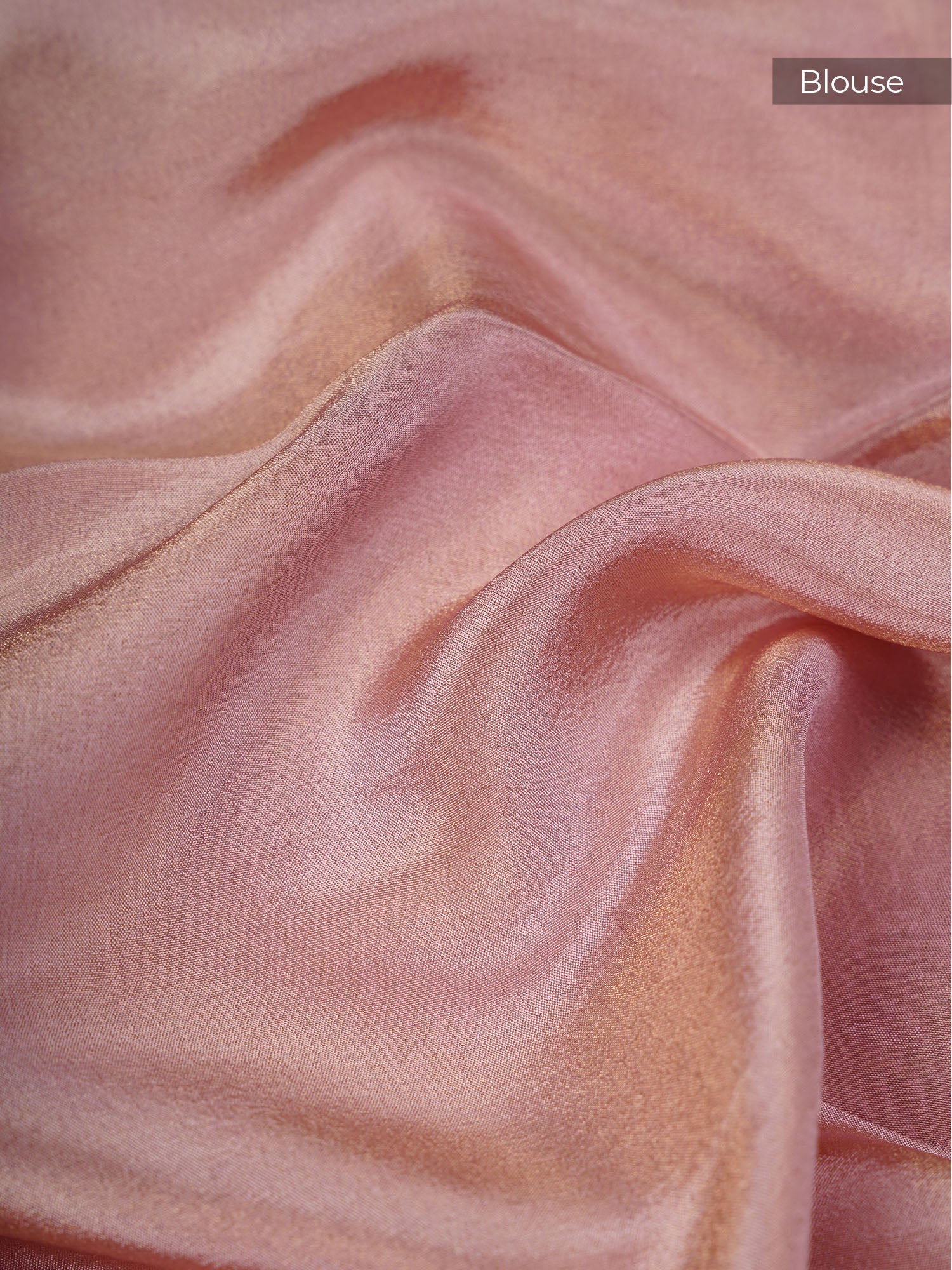Drape yourself in delicate elegance with this stunning Tissue Banarasi silk saree in soft baby pink. Adorned with intricate meenakari...