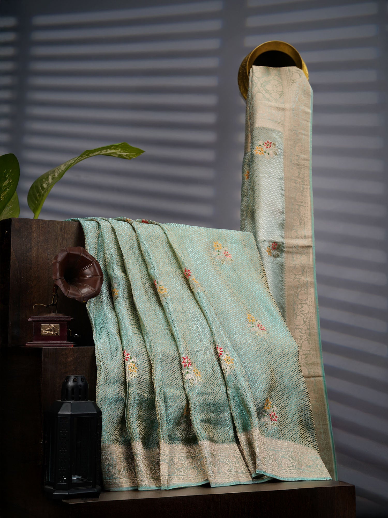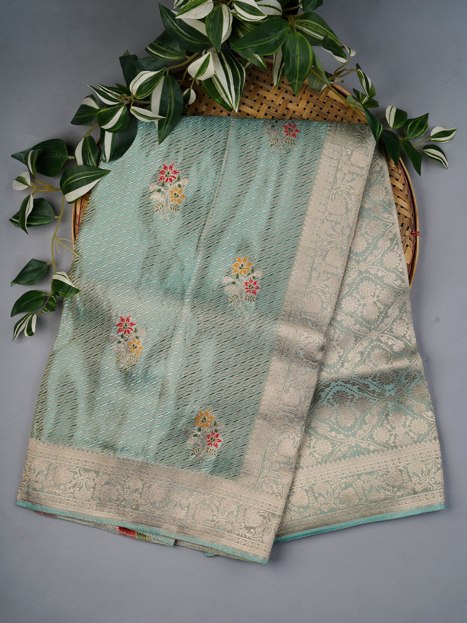 Drape yourself in timeless elegance with this stunning Tissue Banarasi Silk Saree, where traditional craftsmanship meets pure luxury. Adorned with intricate Meenakari butties that dance across the fabric in vibrant hues, this saree celebrates the artistry of Banaras weavers. The gleaming gold zari border adds a regal finish that catches light with every movement, making it perfect for weddings, festivals, and special celebrations. Lightweight yet luxurious, the tissue silk drapes beautifully while maintaining its structure. A masterpiece that transforms you into the showstopper of any occasion.