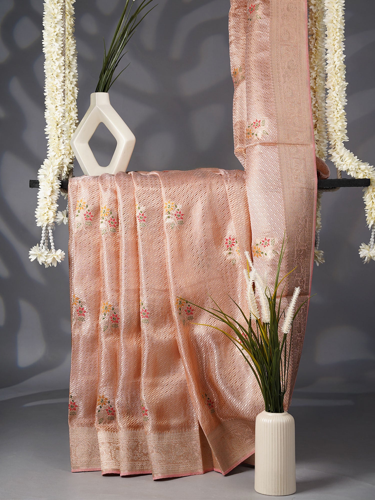 Tissue Banarasi Silk Saree with Meenakashi Butties and Golden Zari Border- Peach