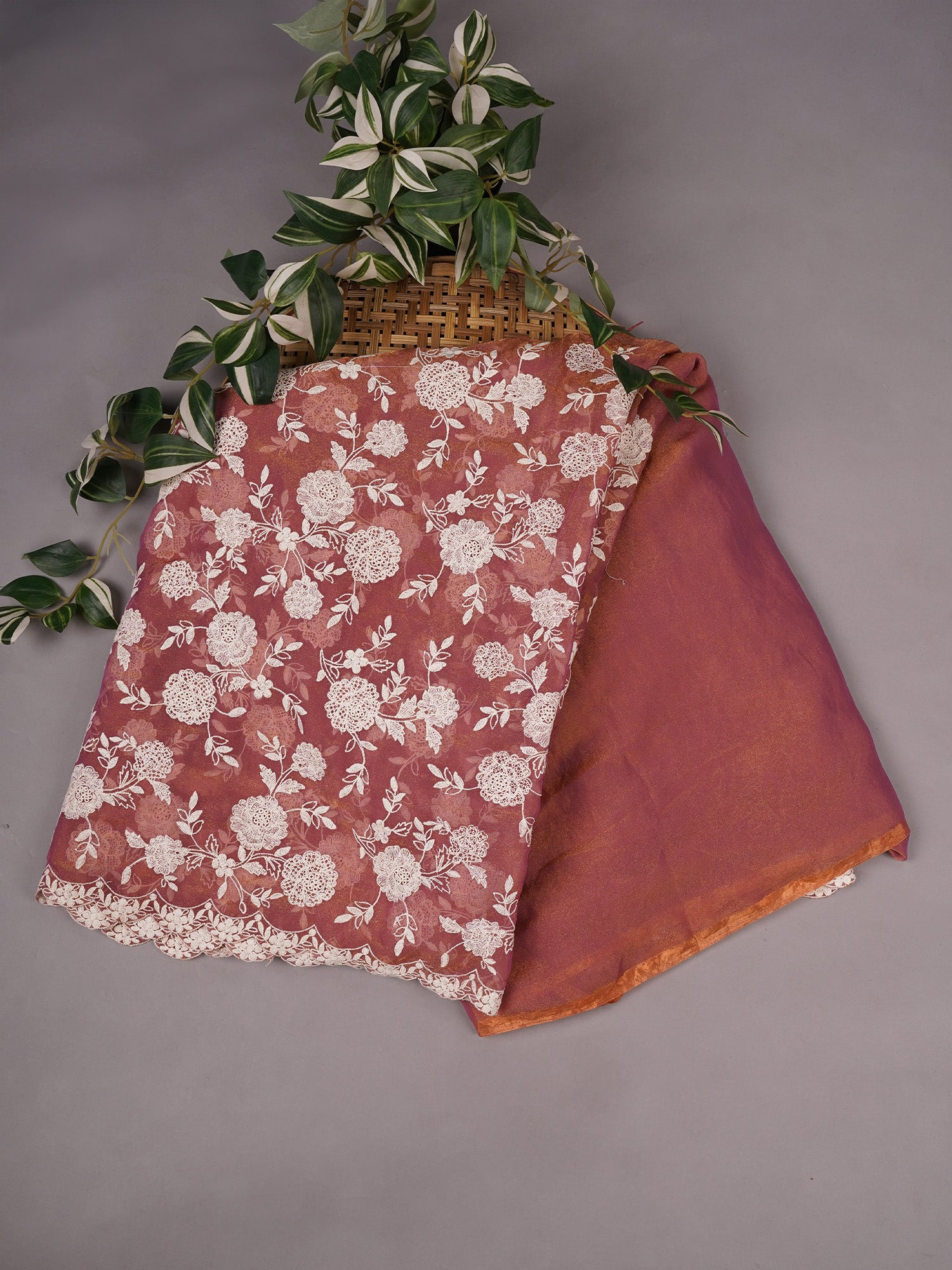 This light maroon tissue georgette fabric features intricate all-over chicken kari embroidery, adding refined texture and elegance to your ensemble....