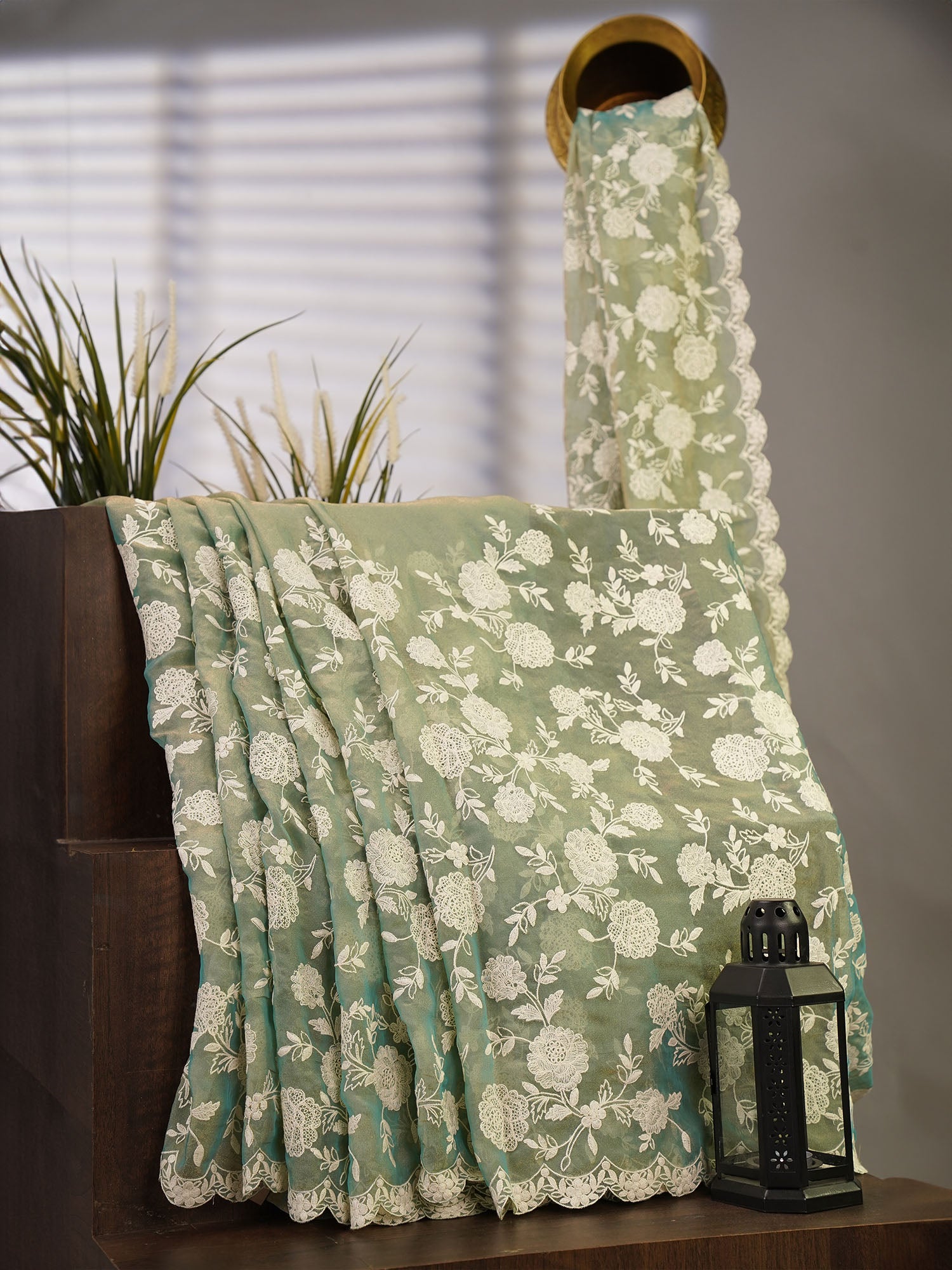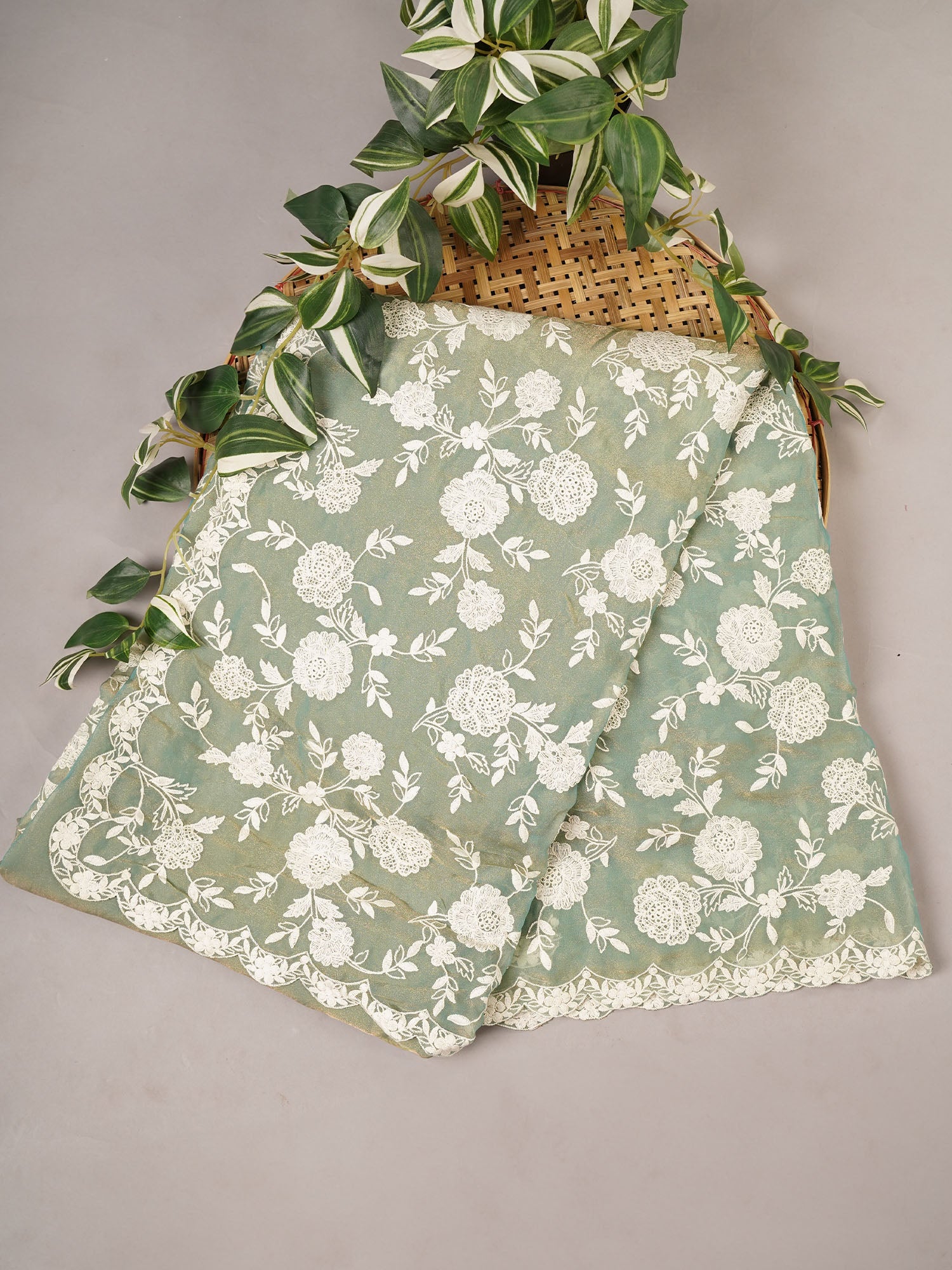 Tissue Georgette all Over Chicken Kari Work with Scallop Border - Sea Green
