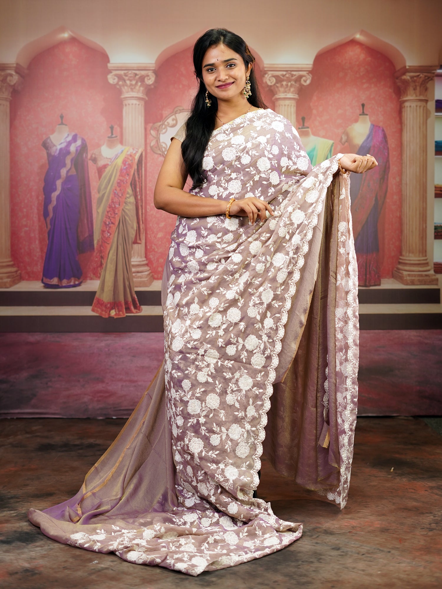 Elevate your ethnic wardrobe with this stunning tissue georgette saree that's pure magic! Adorned with intricate all-over chicken kari embroidery, every inch tells a story of traditional craftsmanship. The delicate scallop border adds a graceful finishing touch that frames your silhouette beautifully. Crafted in rich brown tones, this saree strikes the perfect balance between timeless elegance and contemporary flair. Whether you're attending a festive celebration or making a statement at a special occasion, this piece promises comfort, style, and that coveted wow factor. Drape it, own it, love it!