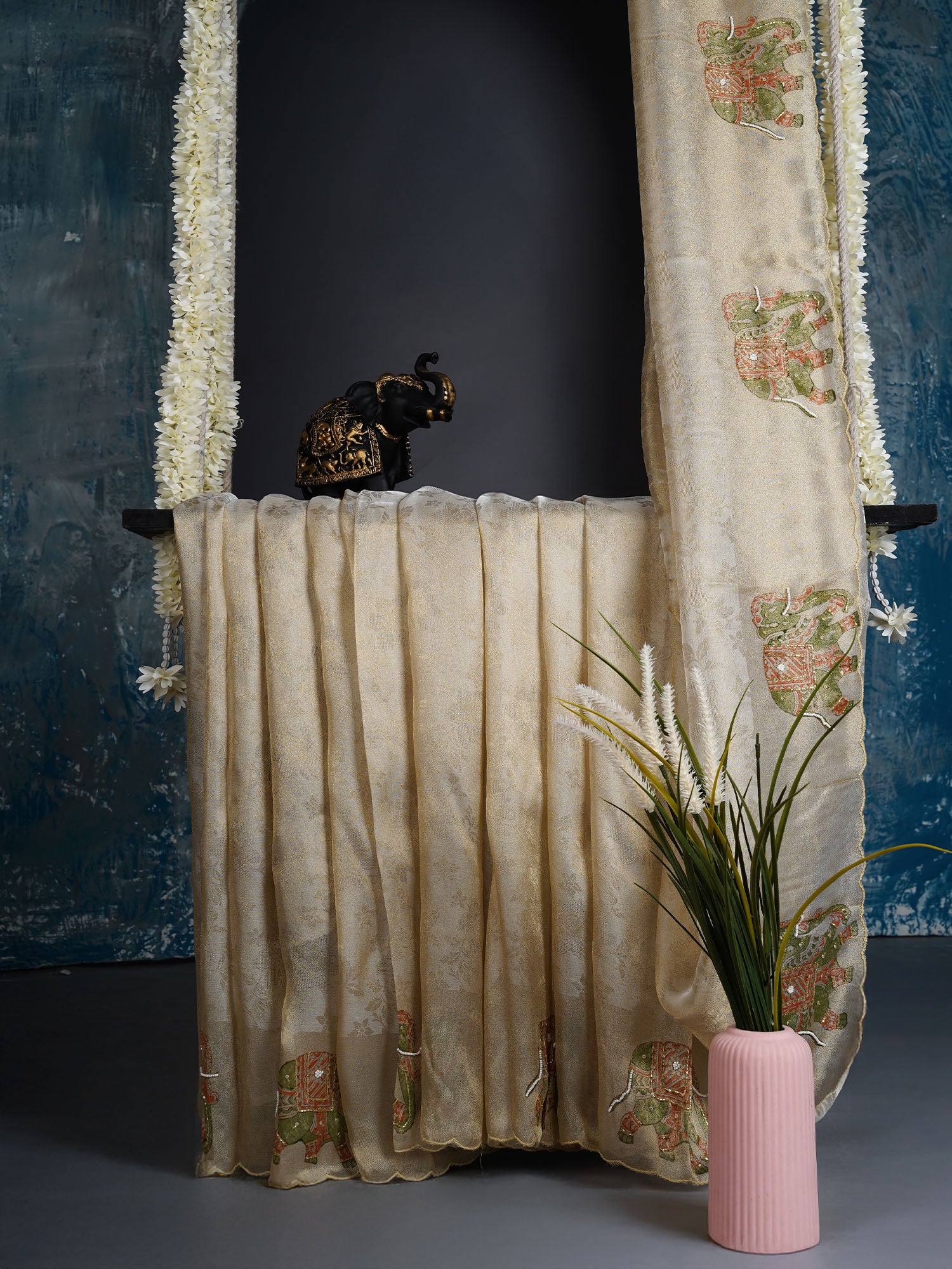 Drape yourself in effortless elegance with this stunning tissue georgette saree. The delicate fabric flows beautifully, while charming print butties...