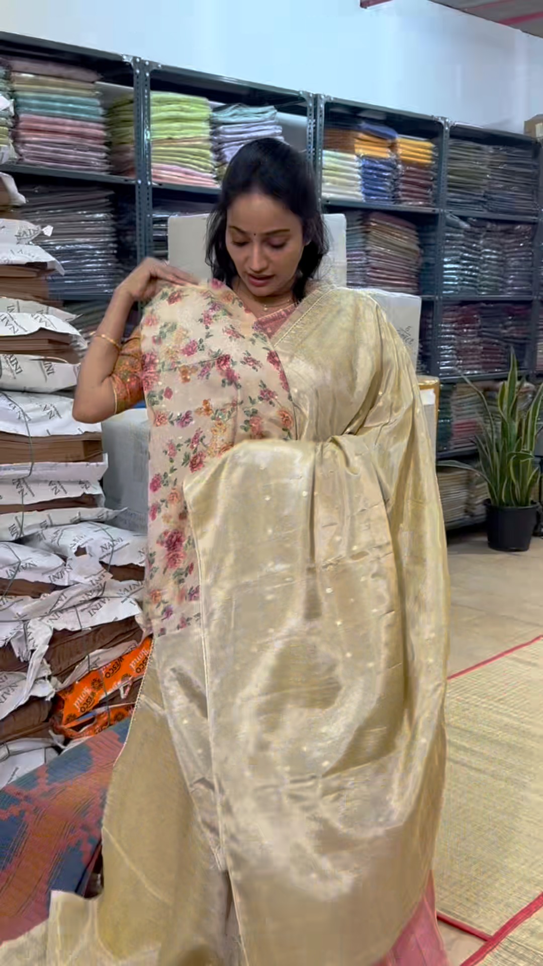 Drape yourself in elegance with this stunning tissue georgette saree that whispers sophistication with every fold. The delicate beige base creates a canvas of understated charm, while intricate small golden butties dance along the border, adding just the right sparkle without stealing the show. Perfect for those moments when you want to look effortlessly graceful—whether it's a festive gathering or a special occasion. The lightweight georgette fabric ensures comfort all day long, letting you move with confidence and style. A timeless piece that proves sometimes the most beautiful things come in the softest packages.