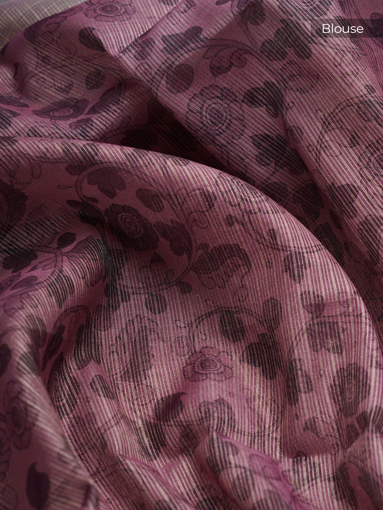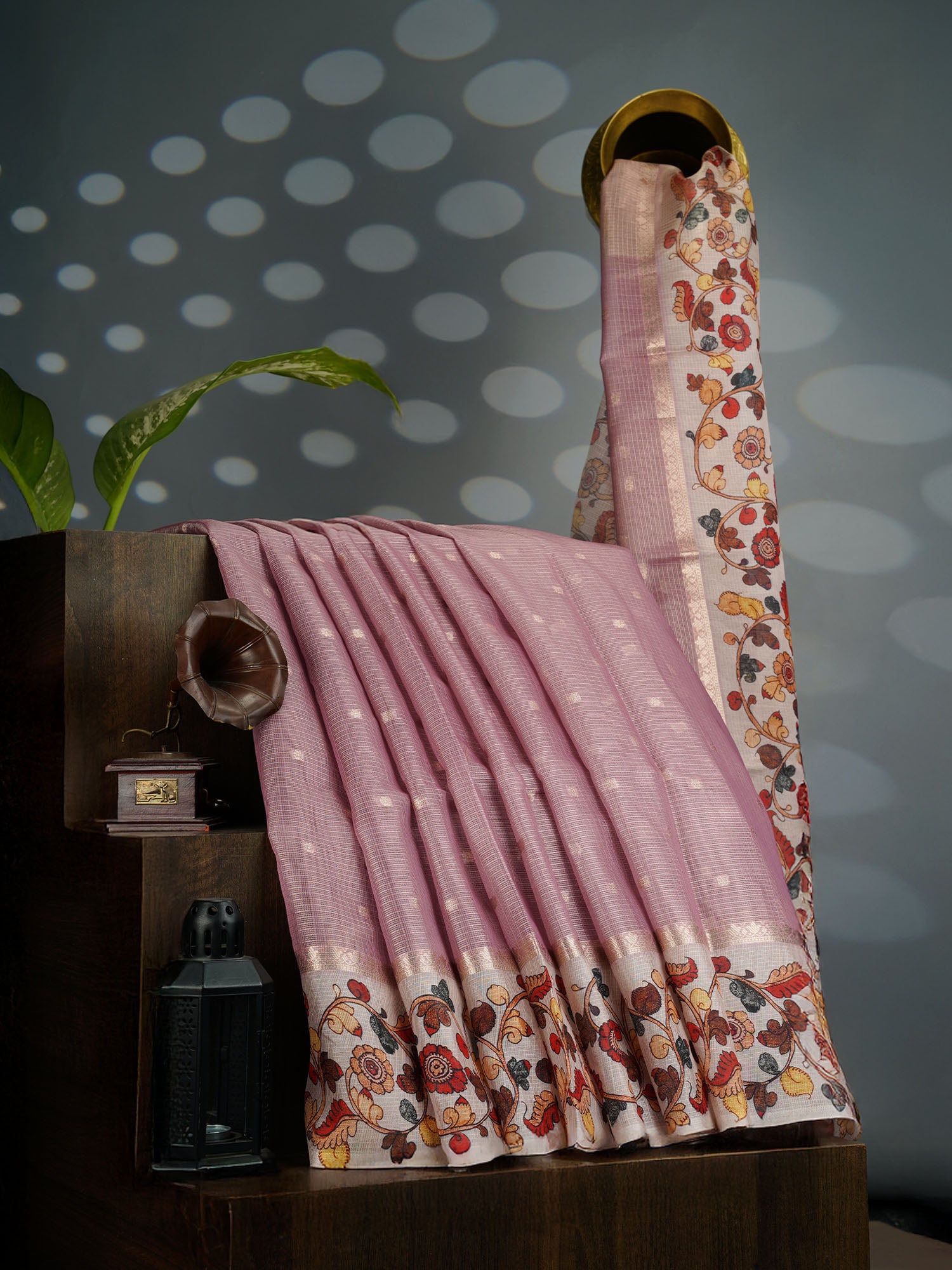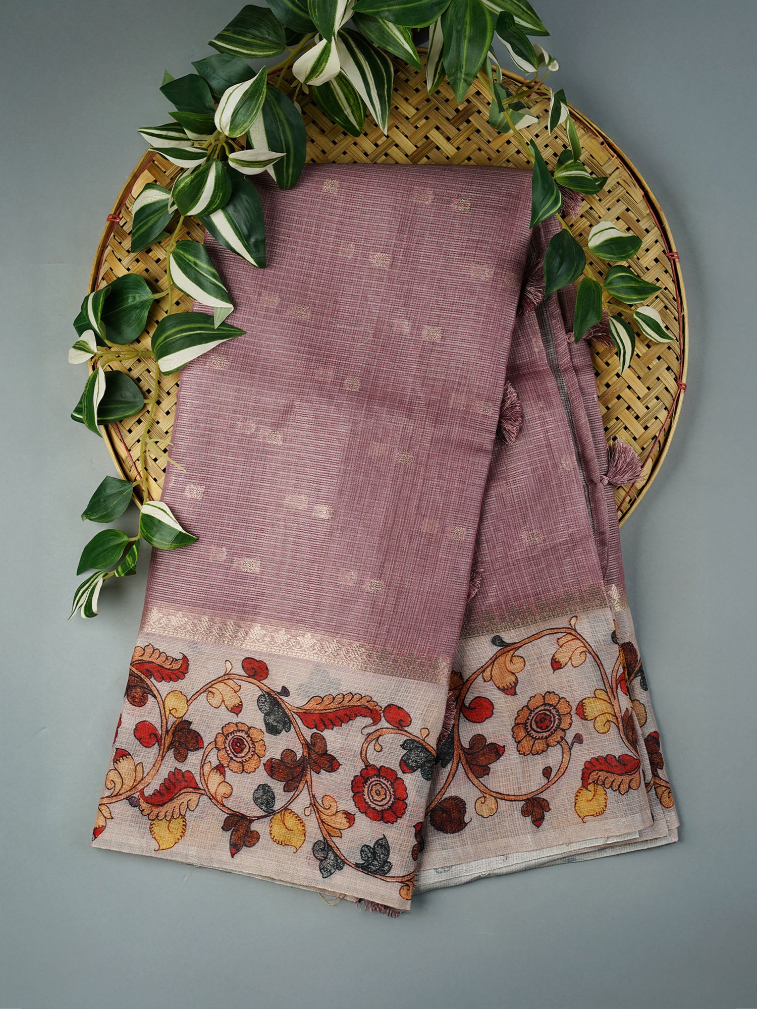 Tissue Kota Saree with Gold Butties and Contrast Floral Print Border- Onion Pink