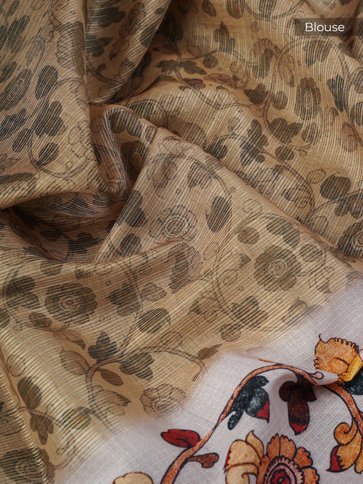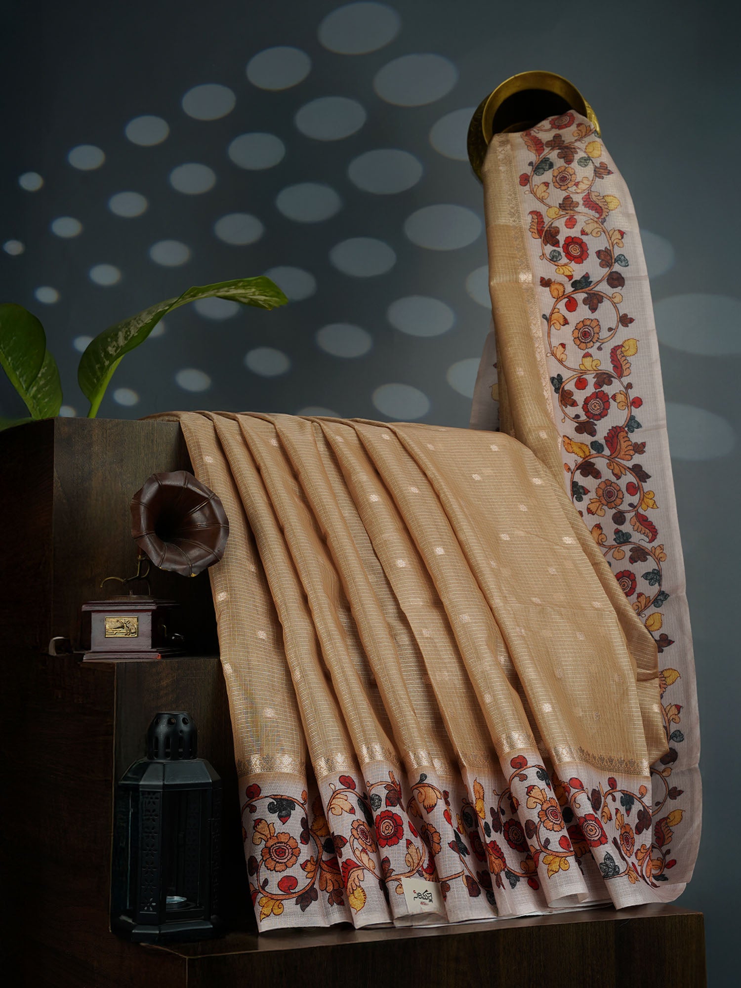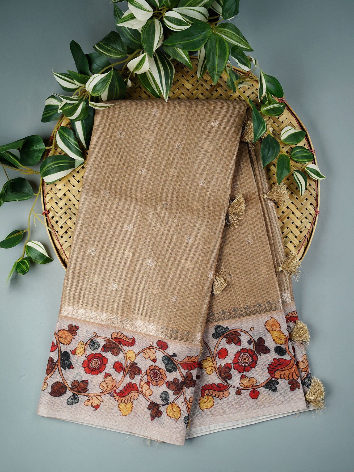 Drape yourself in timeless elegance with this stunning Tissue Kota saree that's equal parts sophisticated and fun. The delicate tan base features shimmering gold butties scattered throughout, creating a mesmerizing sparkle with every movement. A vibrant contrast floral print border adds a playful pop of personality, making this saree perfect for celebrations where you want to stand out. The lightweight tissue fabric ensures comfort all day long, while the intricate detailing keeps things interesting. Whether it's a festive gathering or a special occasion, this saree effortlessly blends grace with a touch of whimsy.