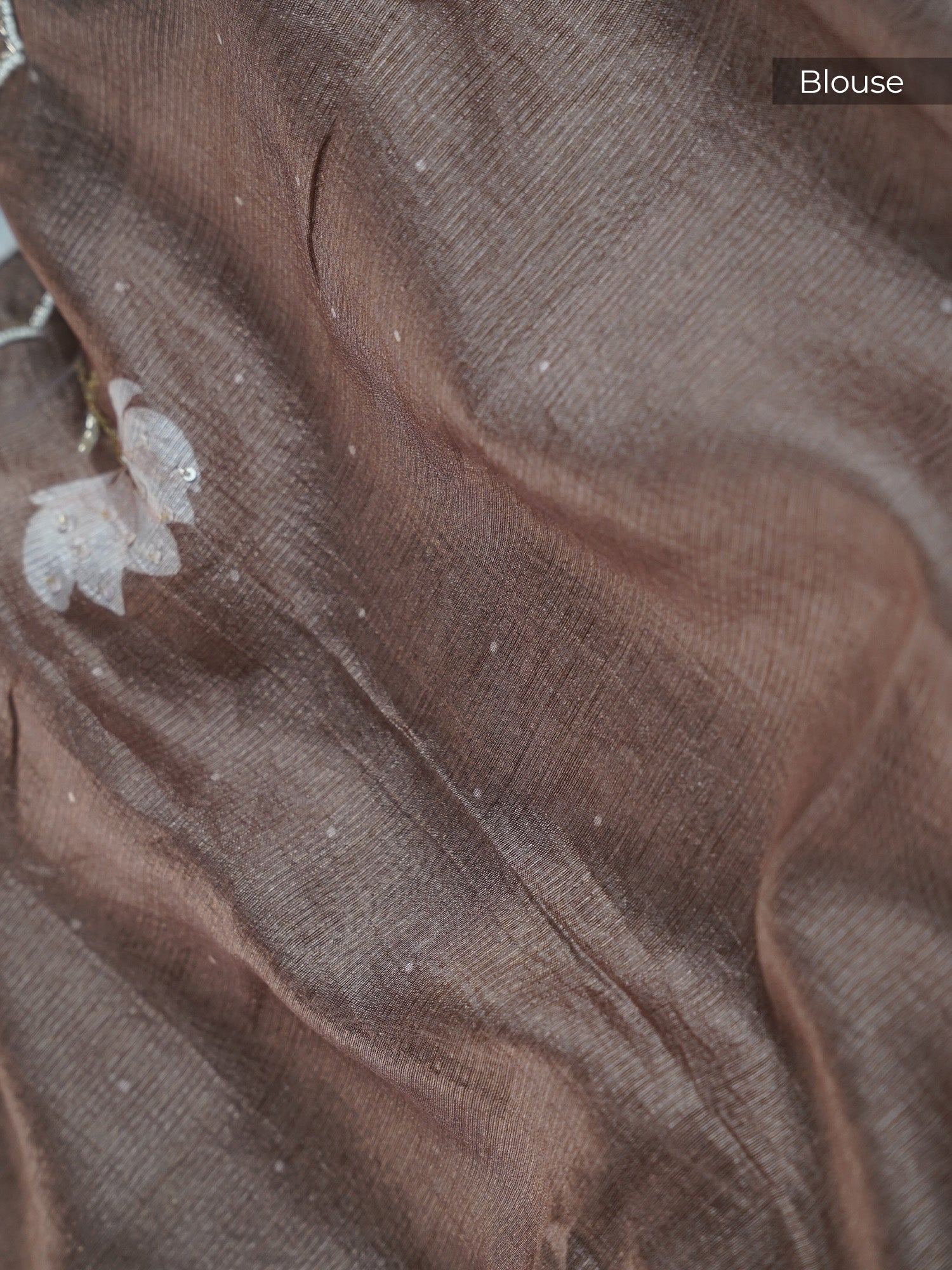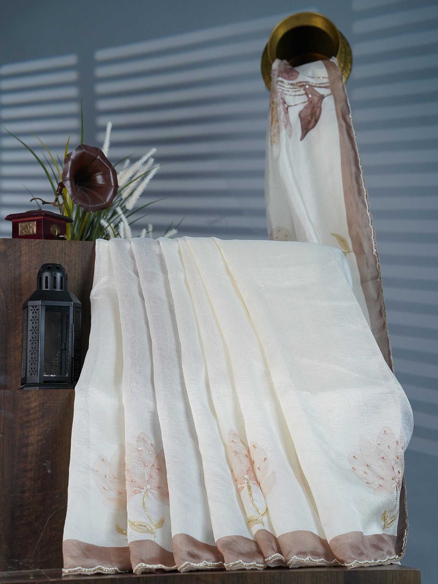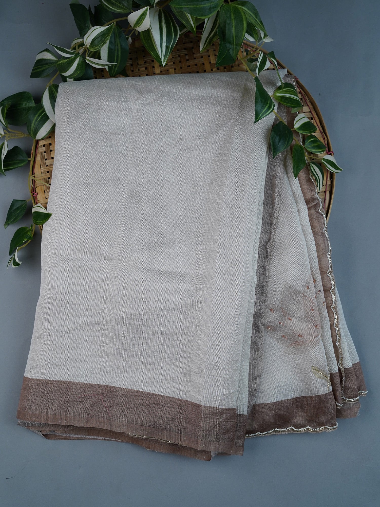 Tissue Lenin Floral Digital Print with Scallop Border Kardhana and Pearl Work- Brown