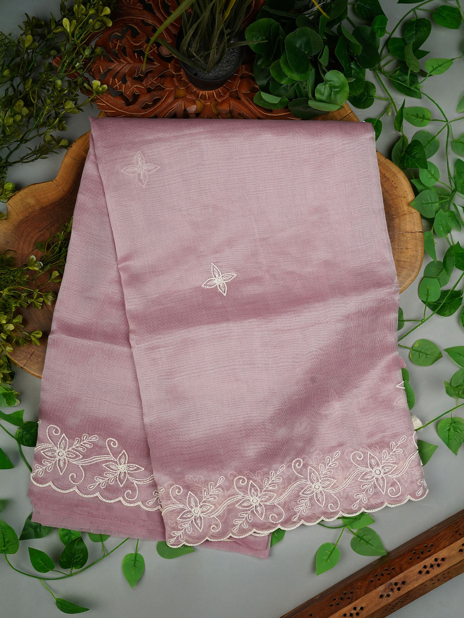 Tissue Lenin Saree and Scallop Border and Pearl Work- Lavender
