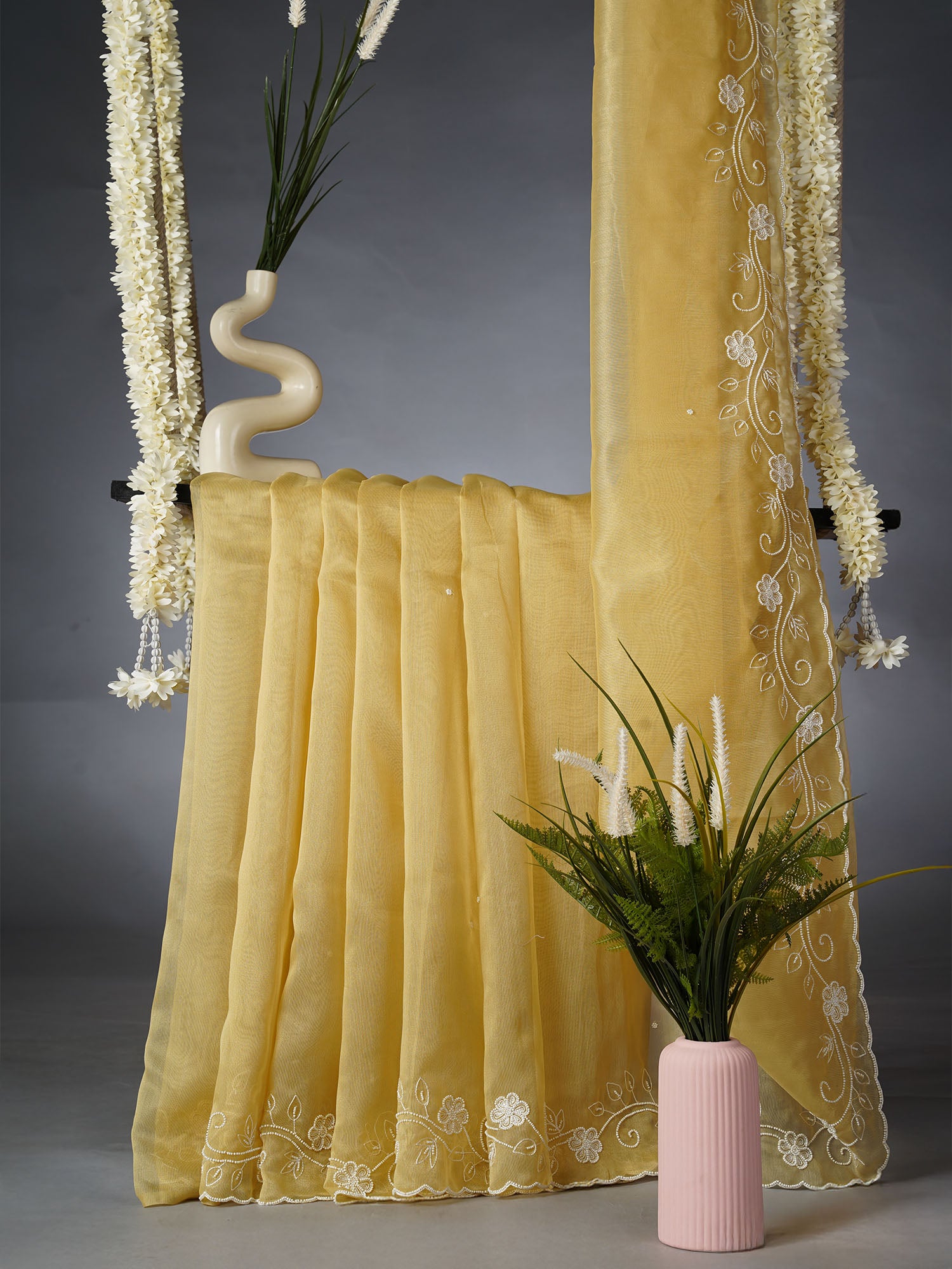 Tissue Lenin Saree and Scallop Border and Pearl work- Tan