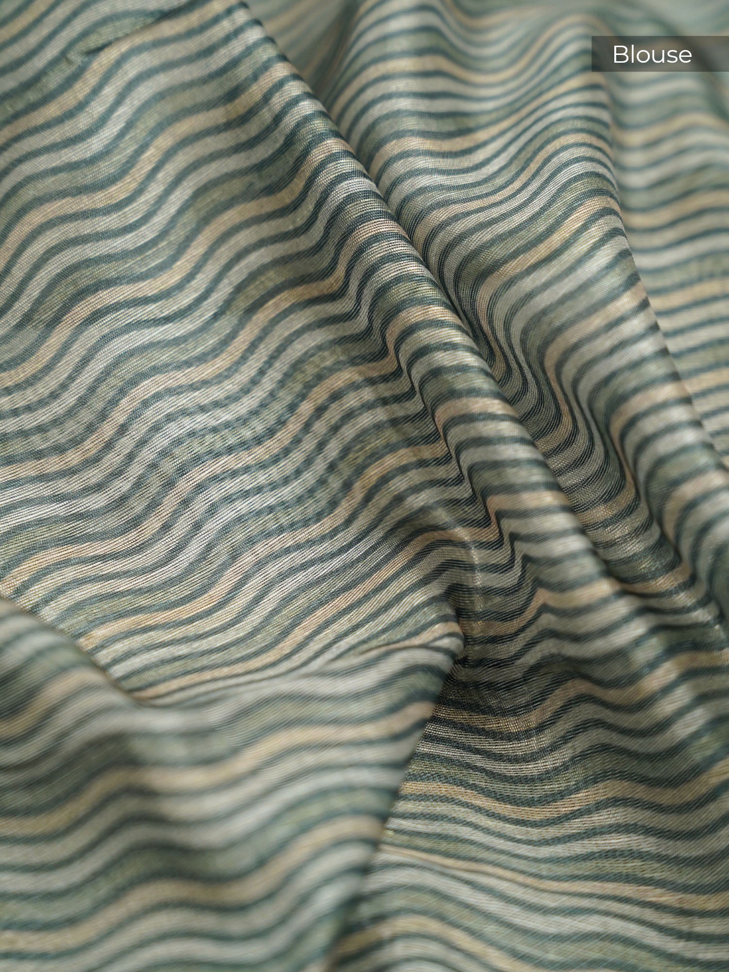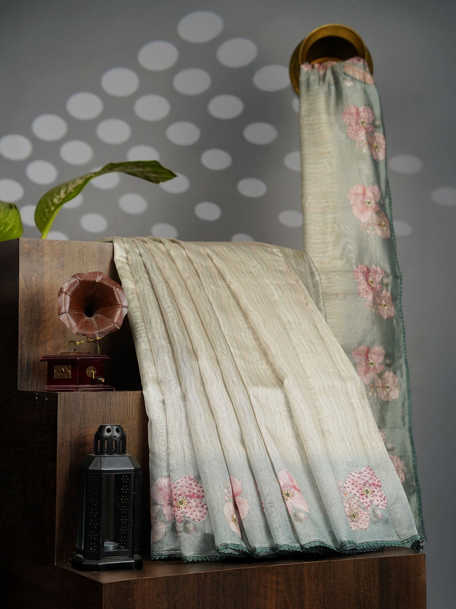 Tissue Lenin Saree with Floral Print and Kardhana Work and Lace Border- Pista Green