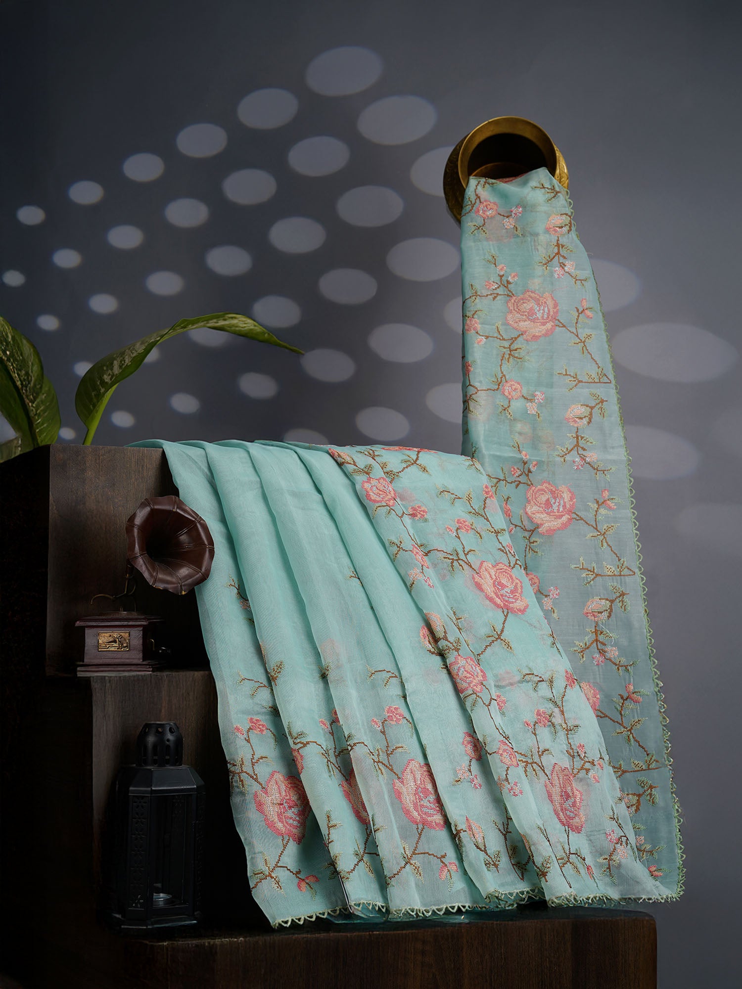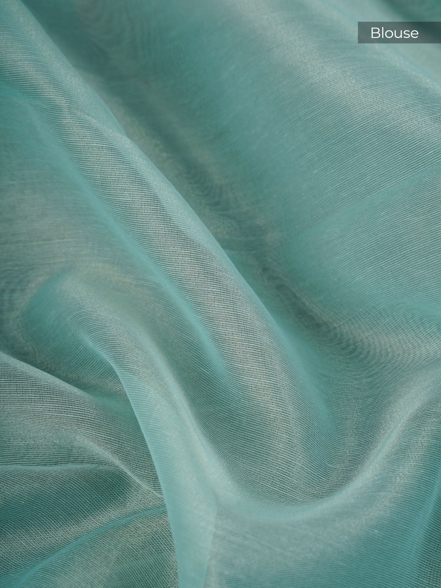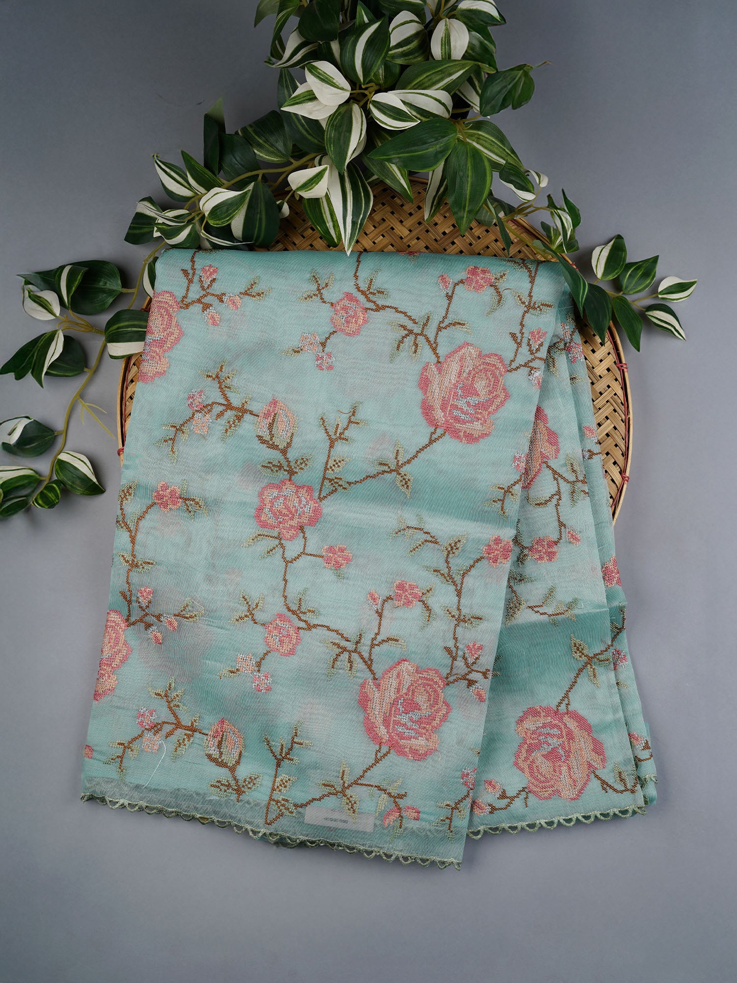 Tissue Lenin Saree with Thread Embroidery Work and Lace Border- Mint Blue