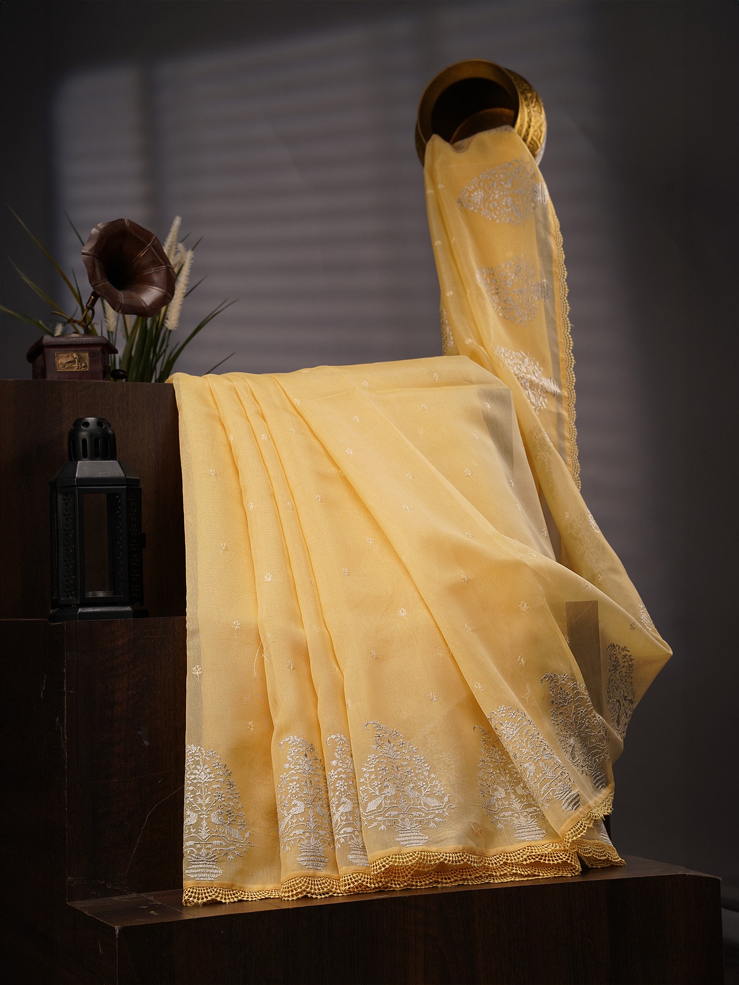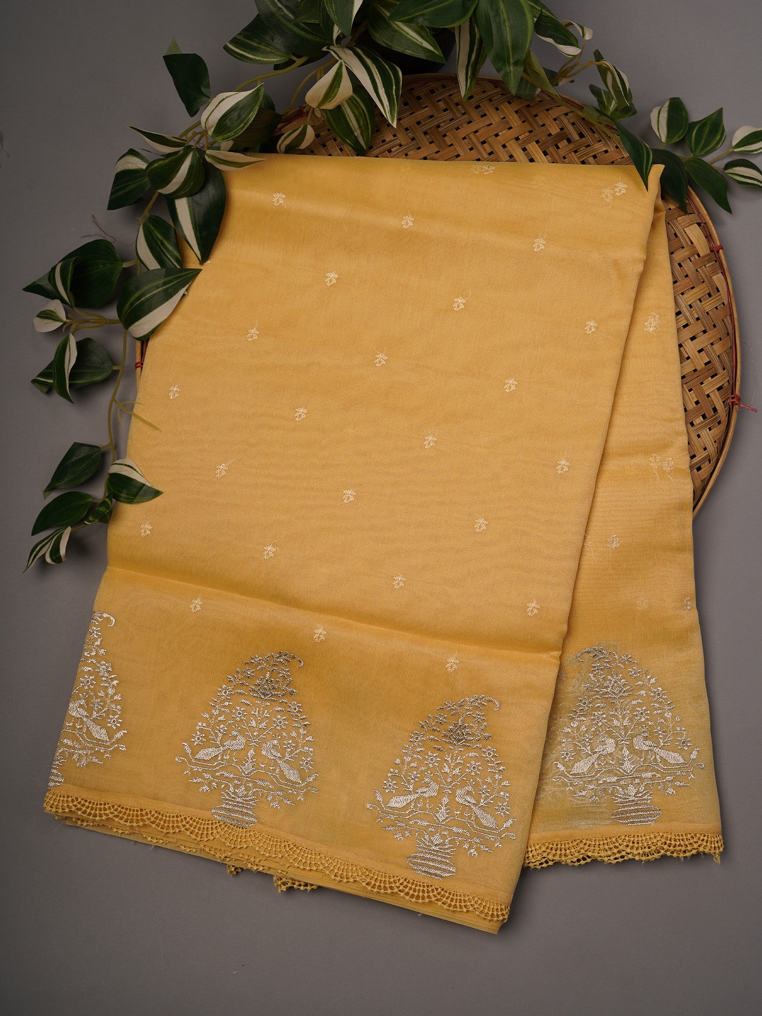 Tissue Linen Lace Border Embroidery Buttis - Cream This elegant saree combines the lightweight comfort of tissue linen with intricate craftsmanship. The cream base provides a versatile canvas, while delicate lace borders frame the pallu and neckline with refined detailing. Scattered butti embroidery adds dimension and traditional charm throughout the drape. The natural breathability of linen makes it ideal for warm weather wear, while the embellished design ensures you remain effortlessly sophisticated. Perfect for festive occasions, celebrations, or elevated everyday styling.