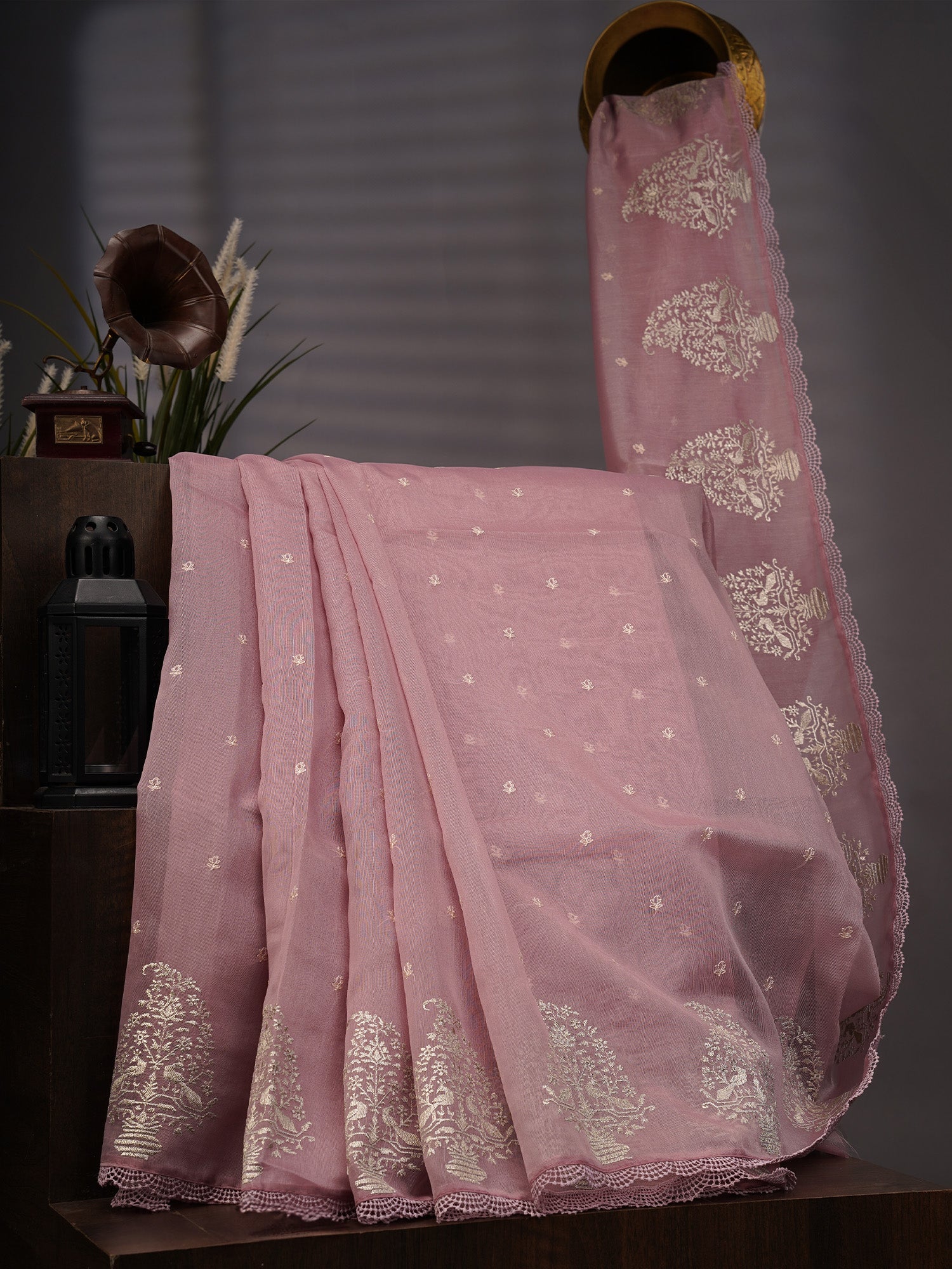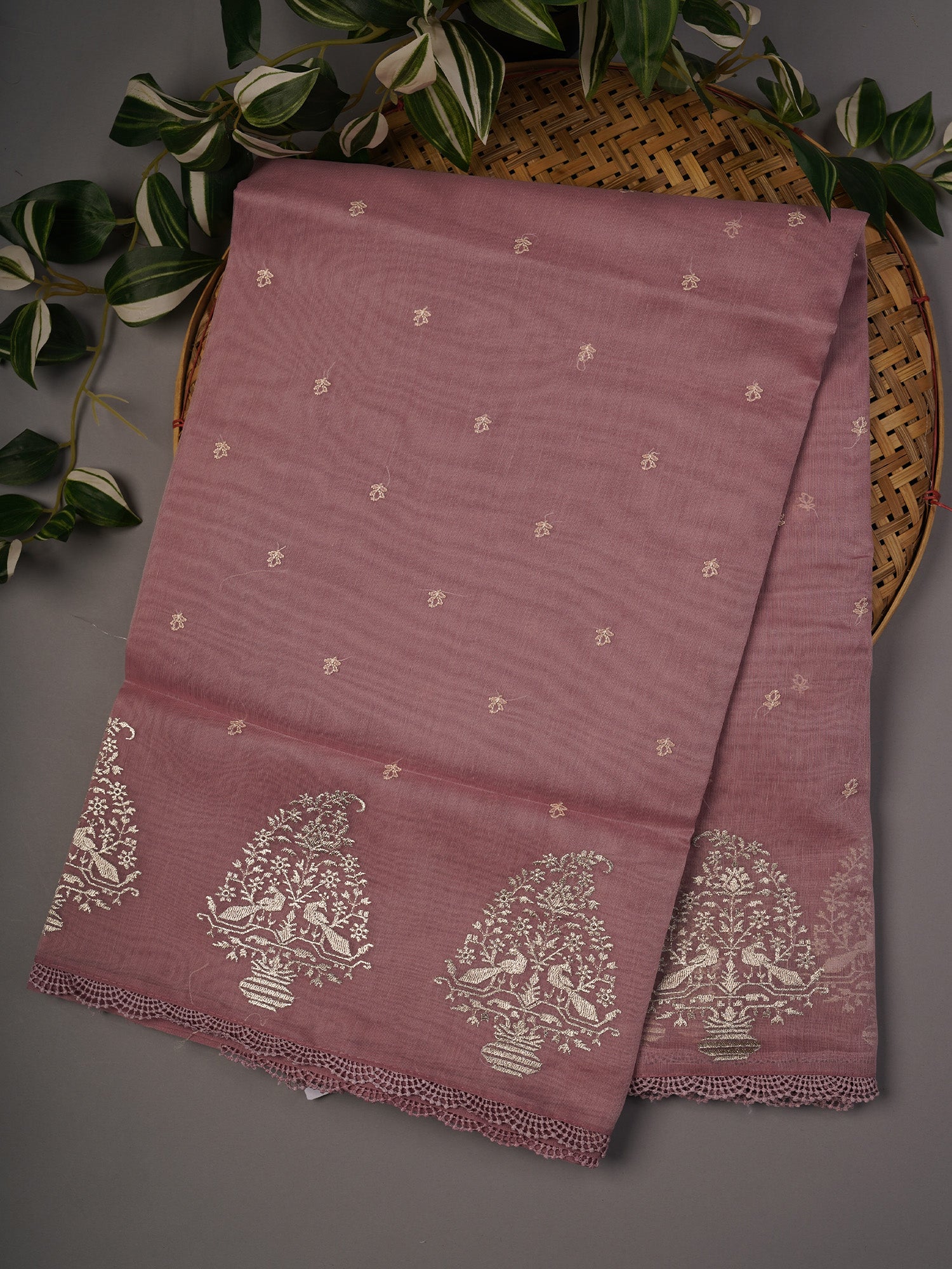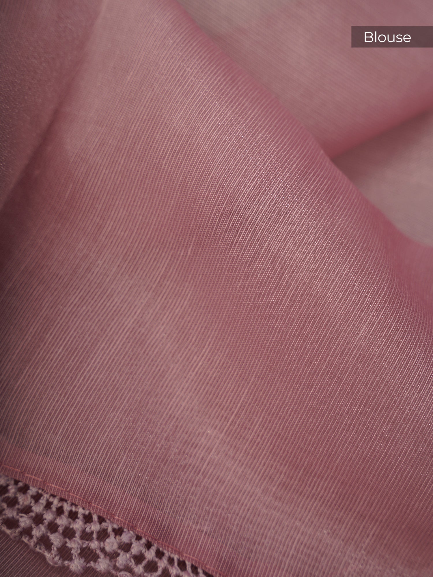 Tissue Linen Lace Border Embroidery Buttis - Light Pink This exquisite saree combines the delicate elegance of tissue linen with intricate lace border detailing and embroidered buttis scattered throughout. The soft light pink hue offers a sophisticated, versatile option suitable for both festive occasions and formal gatherings. The lightweight tissue linen fabric ensures comfort during extended wear, while the ornate lace borders and embroidered motifs add refined craftsmanship. The buttis provide visual depth and traditional appeal, making this piece a timeless addition to any saree collection. Perfect for those who appreciate understated luxury with meticulous attention to detail.