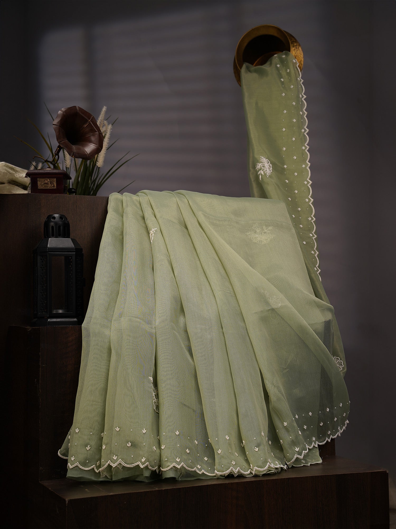 Tissue Linen Lace Border Embroidery Buttis - Green Elevate your ethnic wardrobe with this sophisticated tissue linen saree, expertly crafted with delicate lace borders and intricate butti embroidery. The lightweight tissue linen fabric drapes beautifully while maintaining its structure, making it ideal for both casual gatherings and formal occasions. The verdant green hue complements all skin tones, while the ornate lace detailing and scattered buttis add refined elegance without overwhelming the design. Perfect for those who appreciate traditional craftsmanship with contemporary sensibility, this saree seamlessly transitions from day to evening wear.
