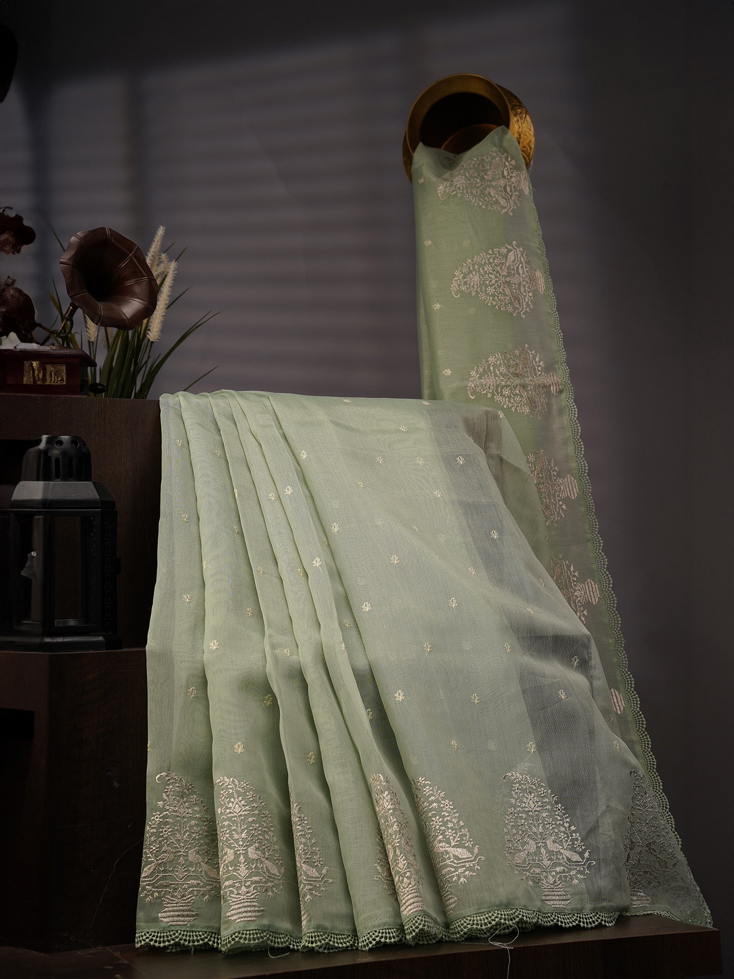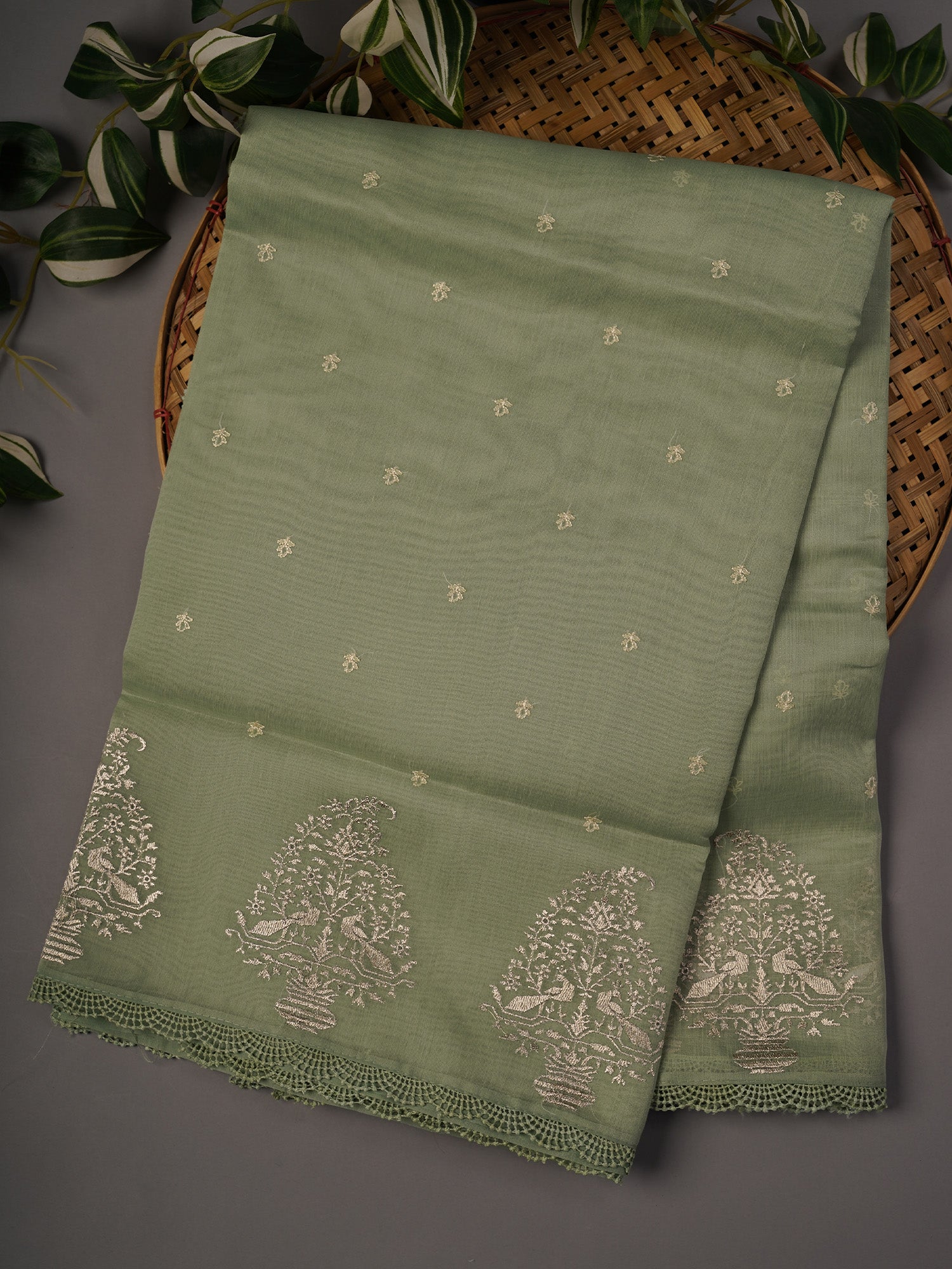 Tissue Linen Lace Border Embroidery Buttis - Tan combines traditional craftsmanship with contemporary elegance. This sophisticated saree features a lightweight tissue linen base in a warm tan shade, complemented by intricate lace borders and delicate butti embroidery throughout. The fine linen fabric ensures breathability and comfort, making it ideal for both casual and semi-formal occasions. The detailed embroidery work showcases skilled artisanship, while the neutral tan tone offers versatility for various styling options. Perfect for those who appreciate refined textures and understated luxury in their ethnic wardrobe.