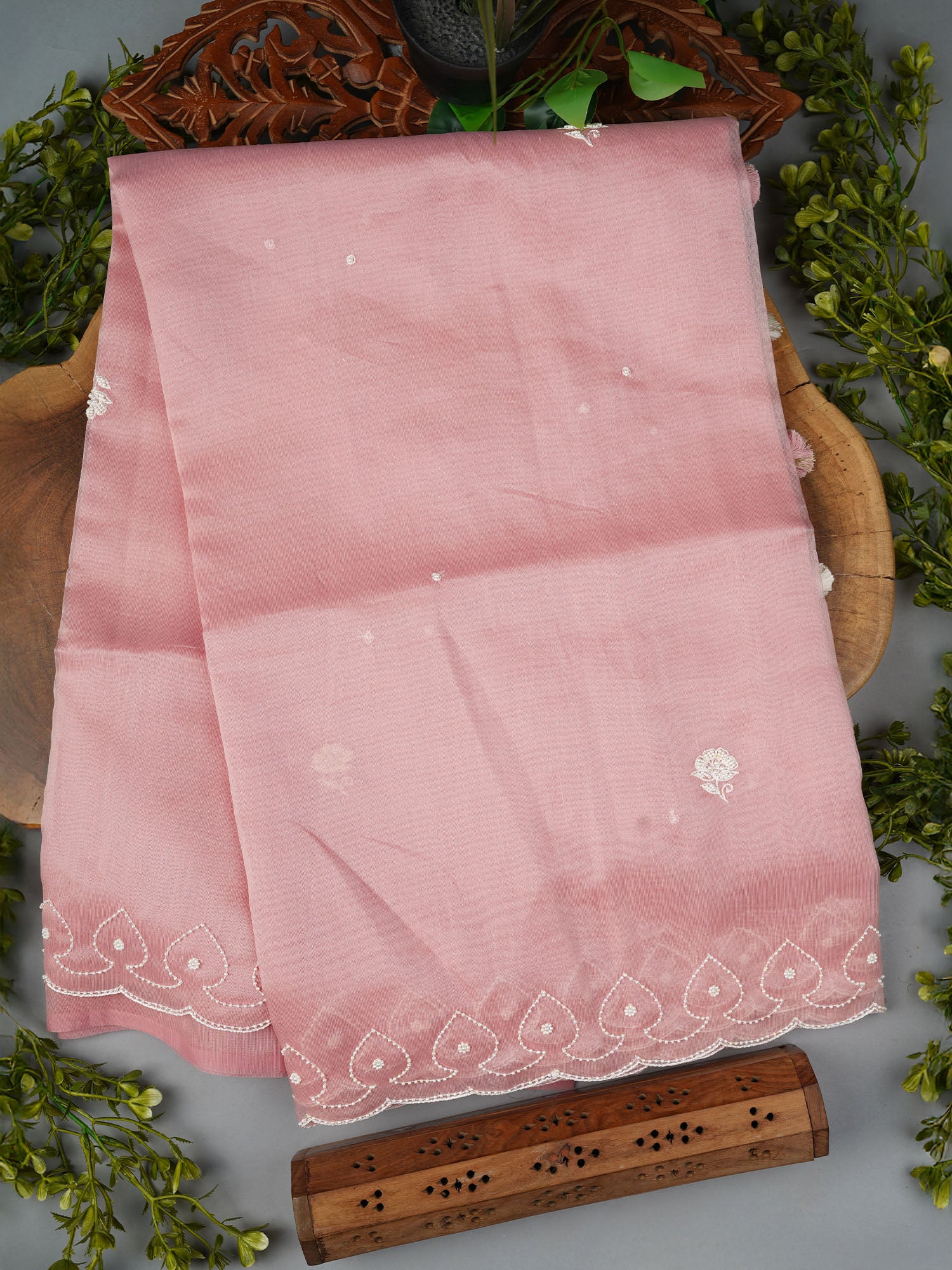Tissue Linen Saree and Scallop Border and Peral Work -Baby Pink