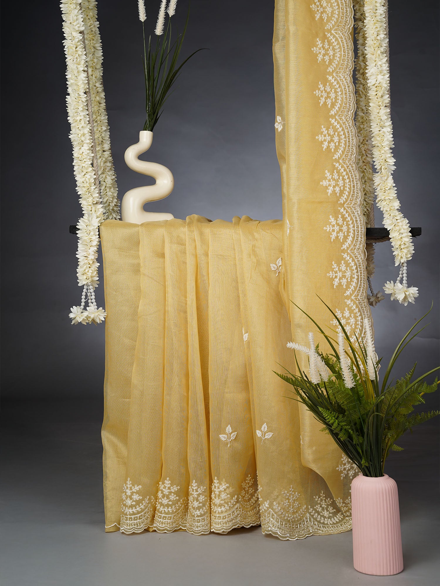 Tissue Linen Saree and Scallop Border and Peral Work -Tan