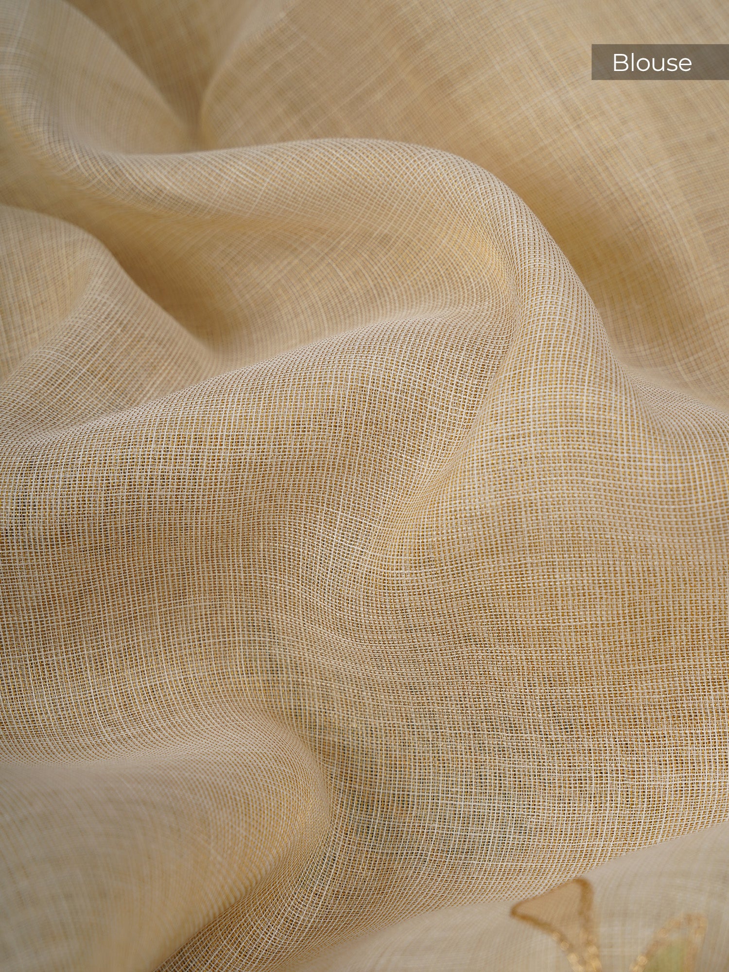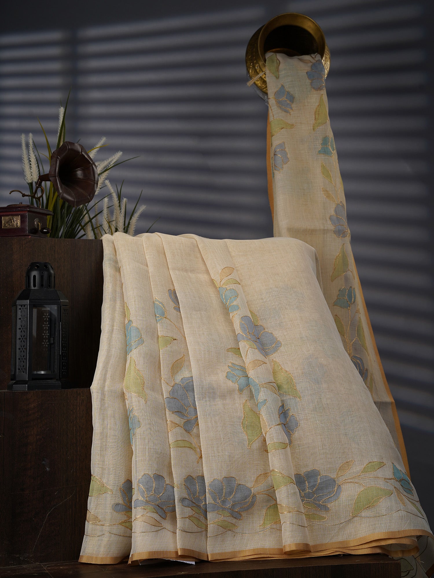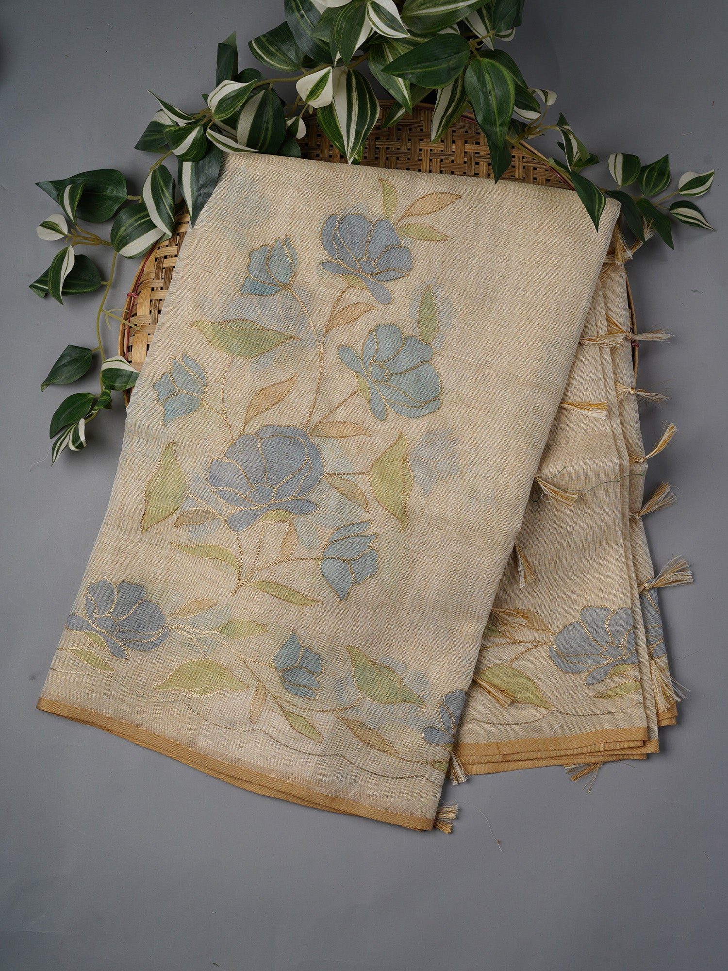 Tissue Linen Saree With Floral Print And Ari Work - Beige & Sky Blue