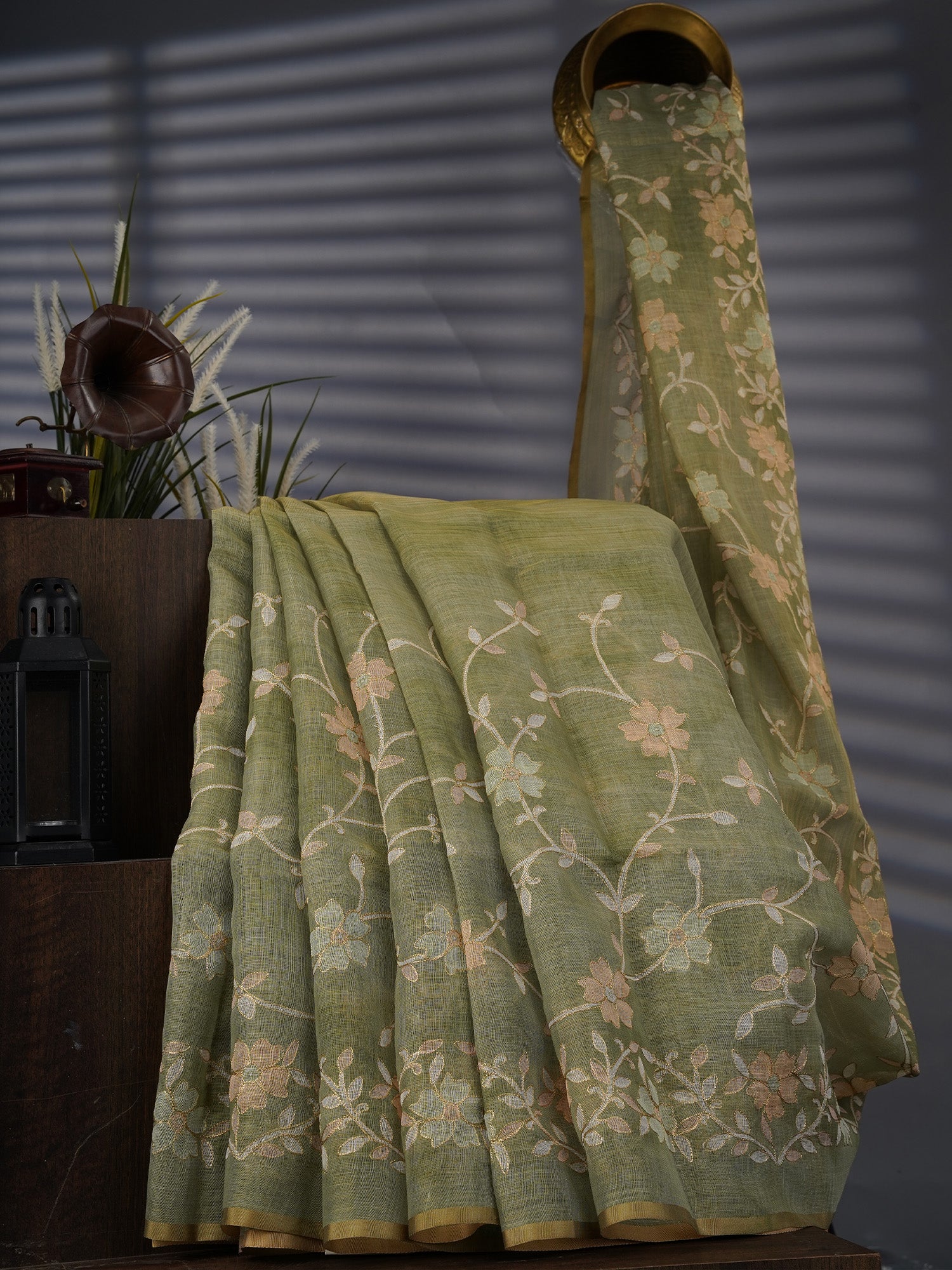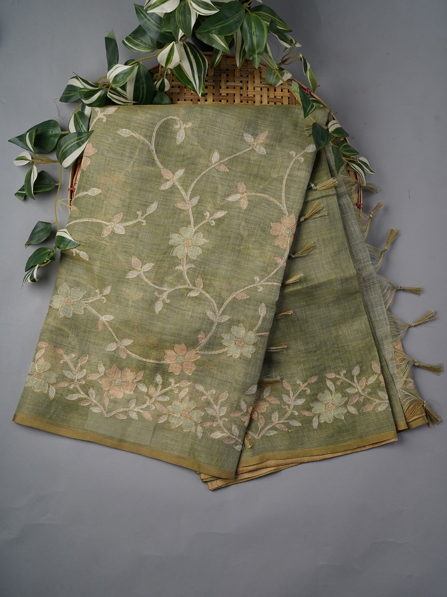 Drape yourself in effortless elegance with this stunning tissue linen saree featuring delicate floral prints and intricate ari embroidery work. The soft, breathable linen fabric keeps you cool and comfortable, while the vibrant green hue adds a fresh, natural charm to your wardrobe. Perfect for festive occasions, casual gatherings, or everyday wear, this saree beautifully blends traditional craftsmanship with contemporary style. The detailed ari work elevates the design, making it a versatile piece that transitions seamlessly from day to evening. Celebrate your unique style with this timeless treasure.