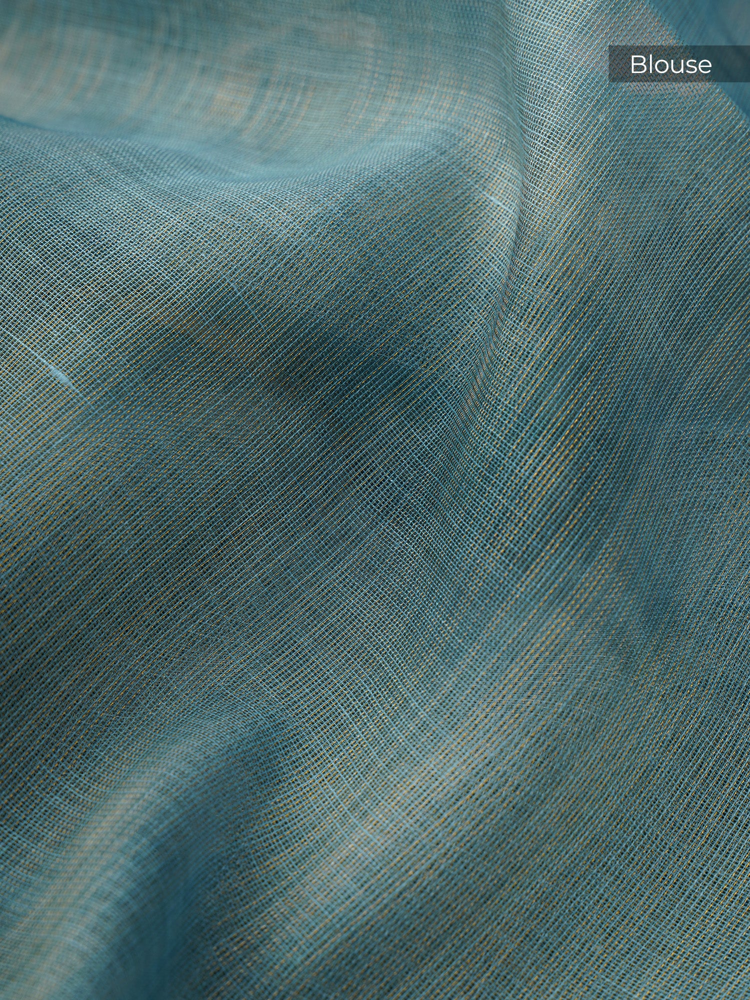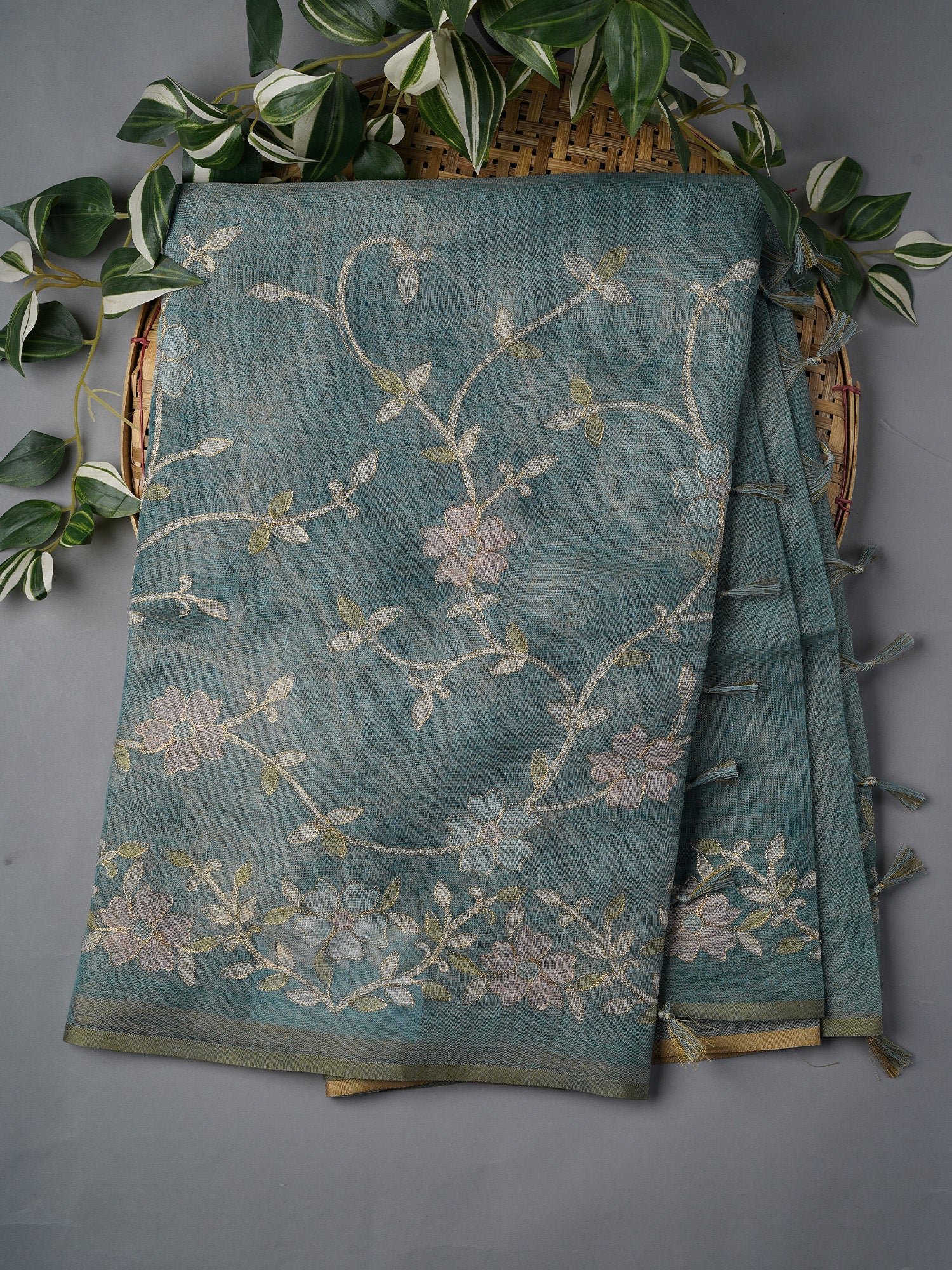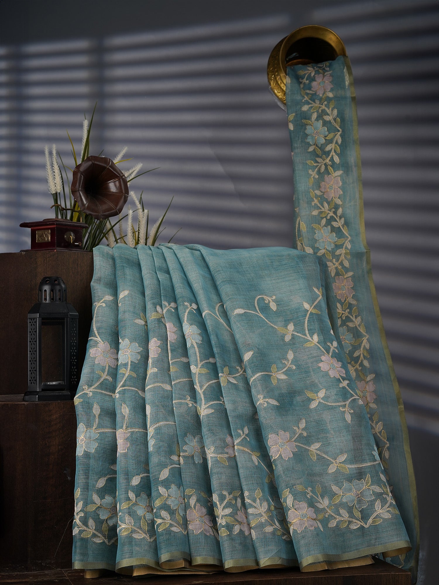 Drape yourself in breezy elegance with this stunning tissue linen saree that's perfect for those moments when you want to look effortlessly chic. The soft mint blue backdrop creates a serene canvas for delicate floral prints, while intricate ari embroidery adds just the right touch of sparkle and sophistication. Lightweight and breathable, this saree is your go-to for weddings, festivals, or any occasion where comfort meets style. Embrace the perfect blend of traditional craftsmanship and contemporary flair.