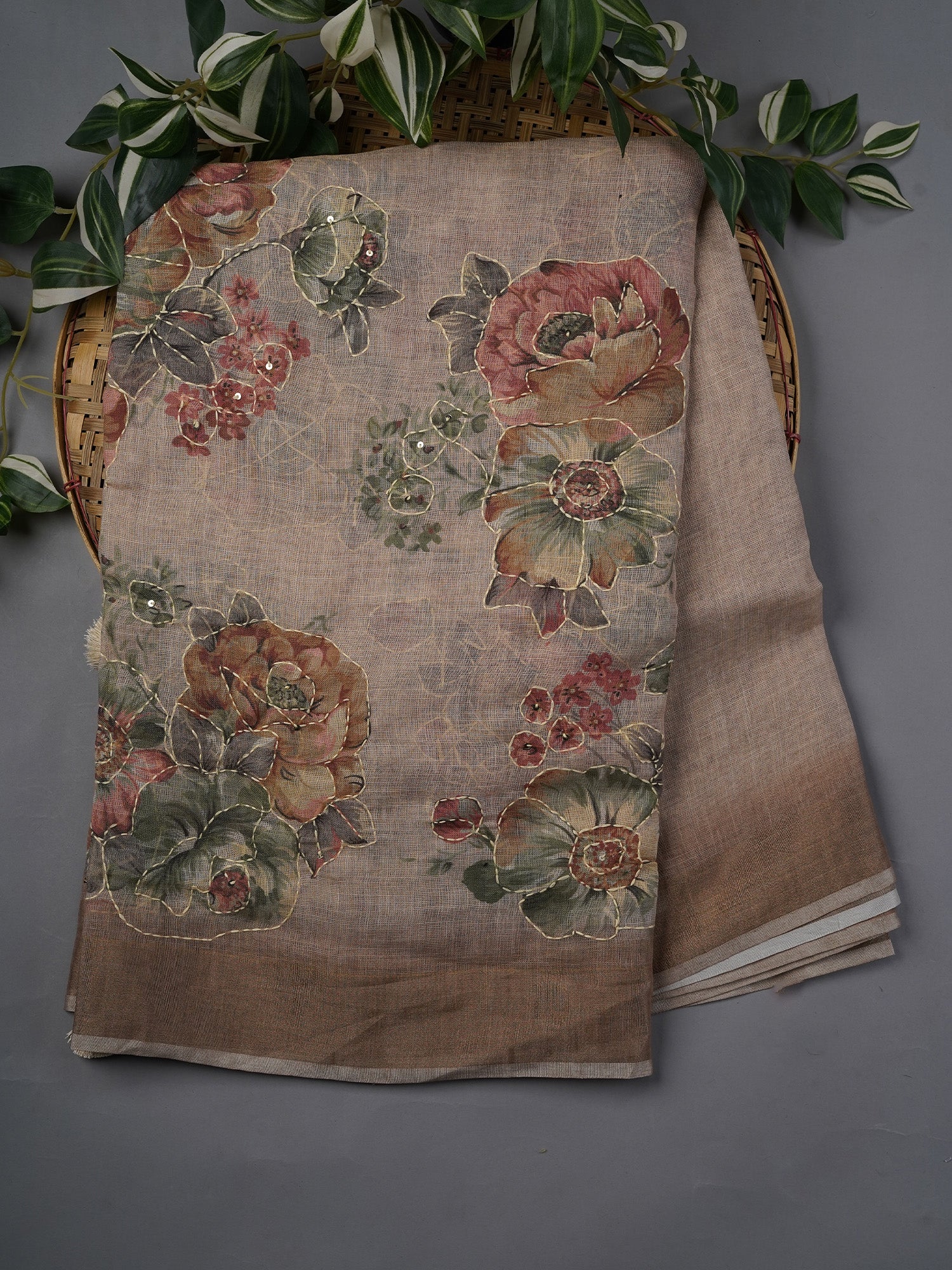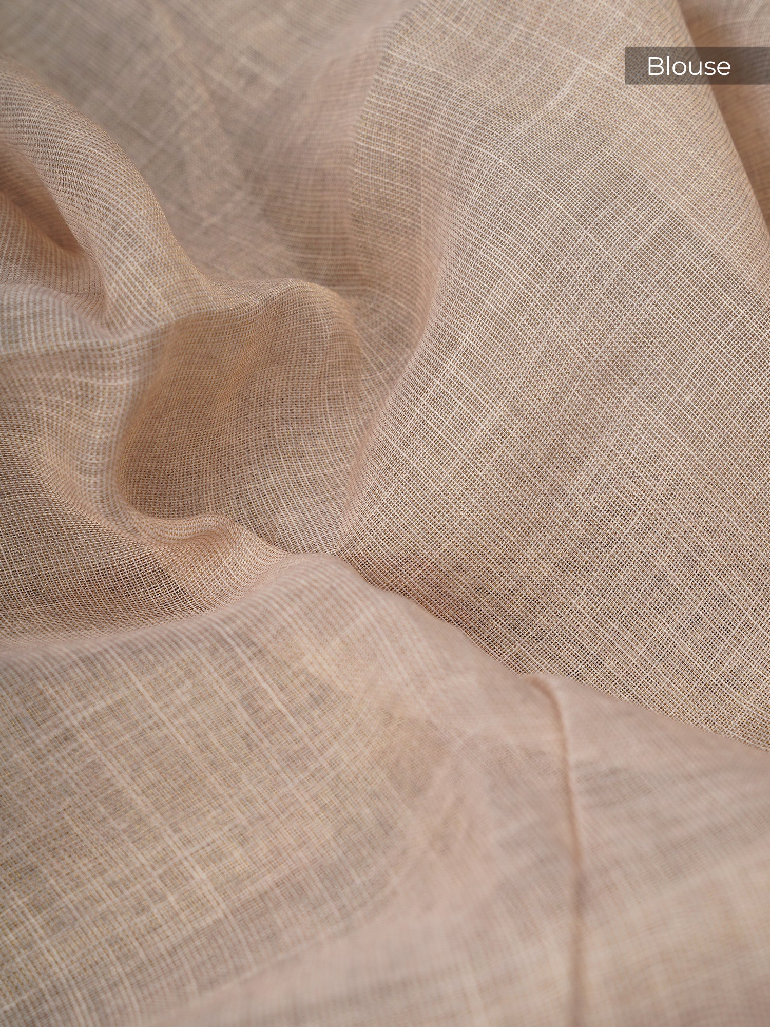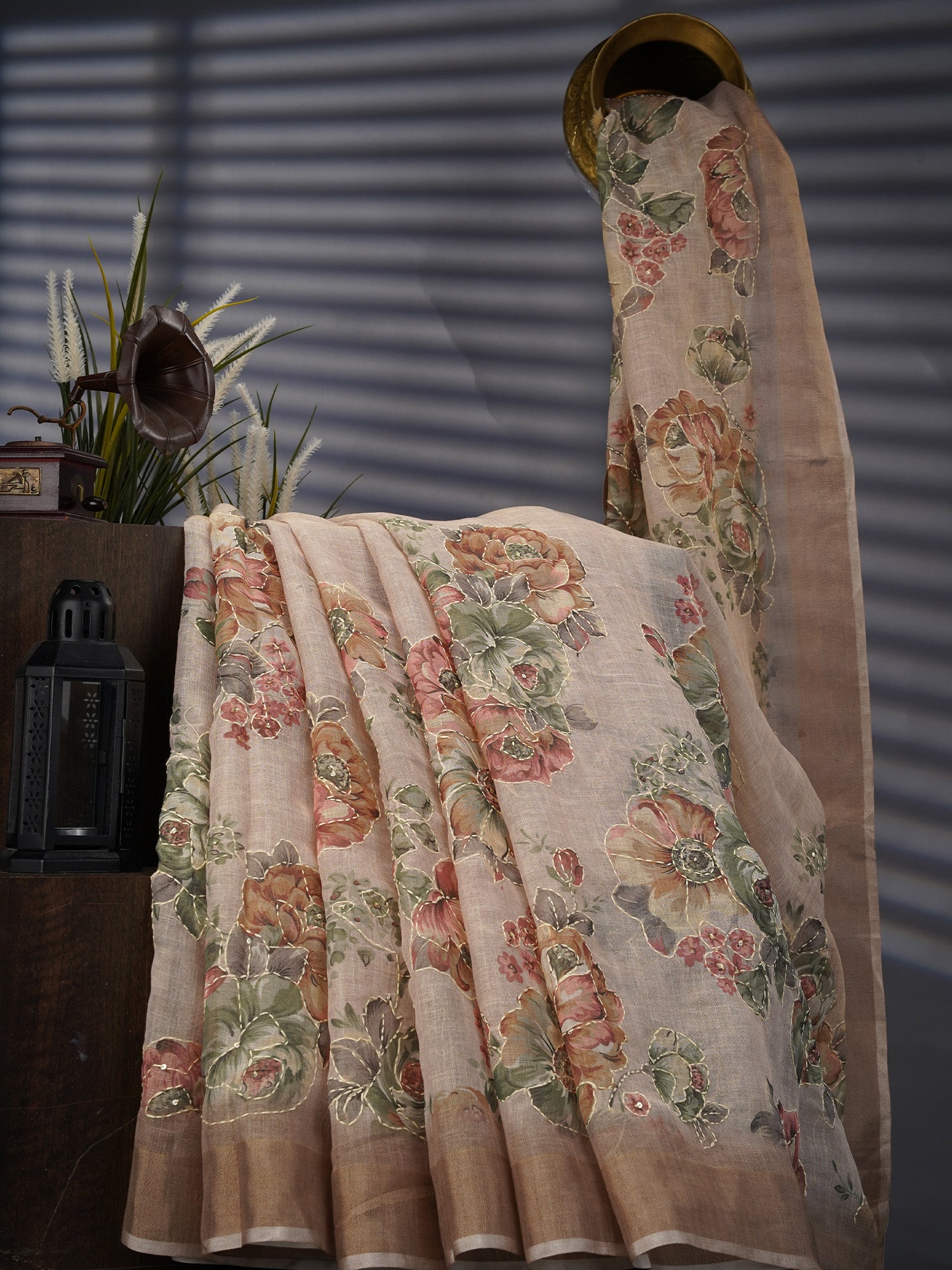 Draped in soft sophistication, this Tissue Linen saree in a serene Beige shade is a masterpiece of delicate beauty and timeless artistry. Its gentle floral print blooms gracefully across the shimmering fabric, creating a look that is both refreshing and refined. The subtle texture of tissue linen adds a natural glow, allowing the saree to drape with effortless elegance.