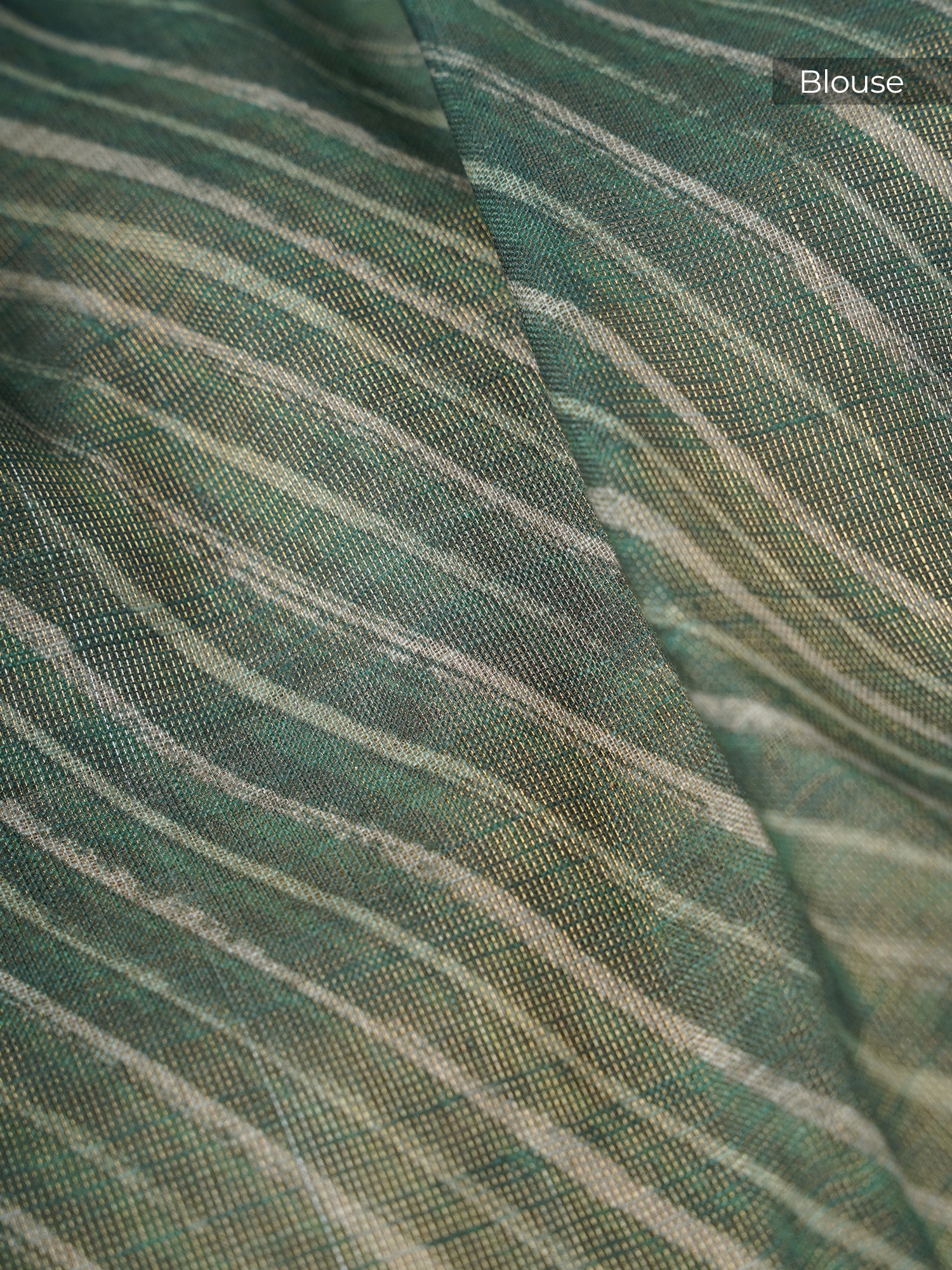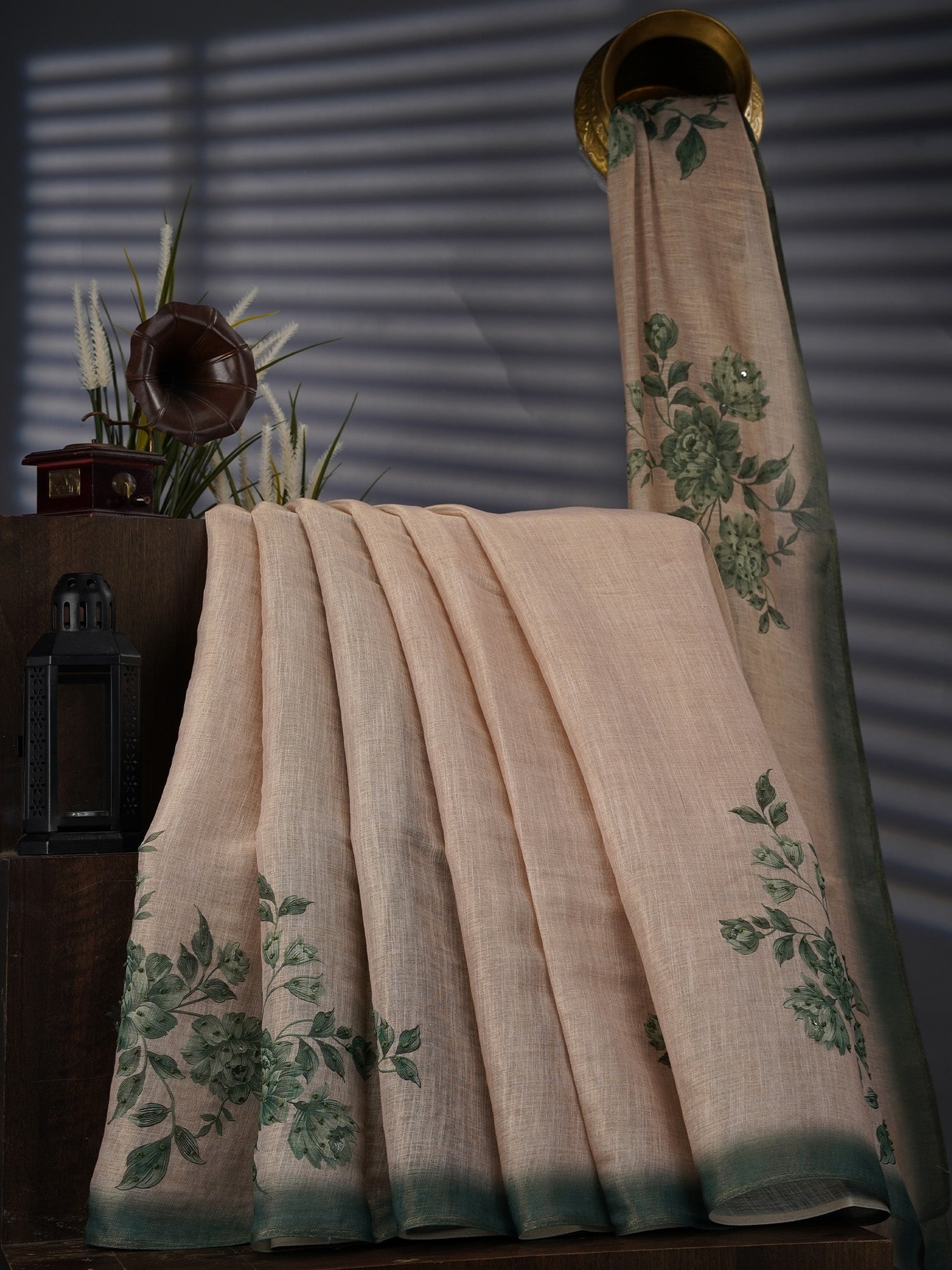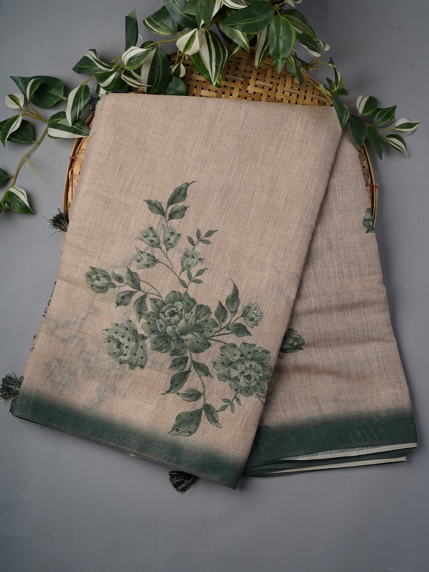 Tissue Linen Saree With Floral Print & Knot Work - Beige & Green