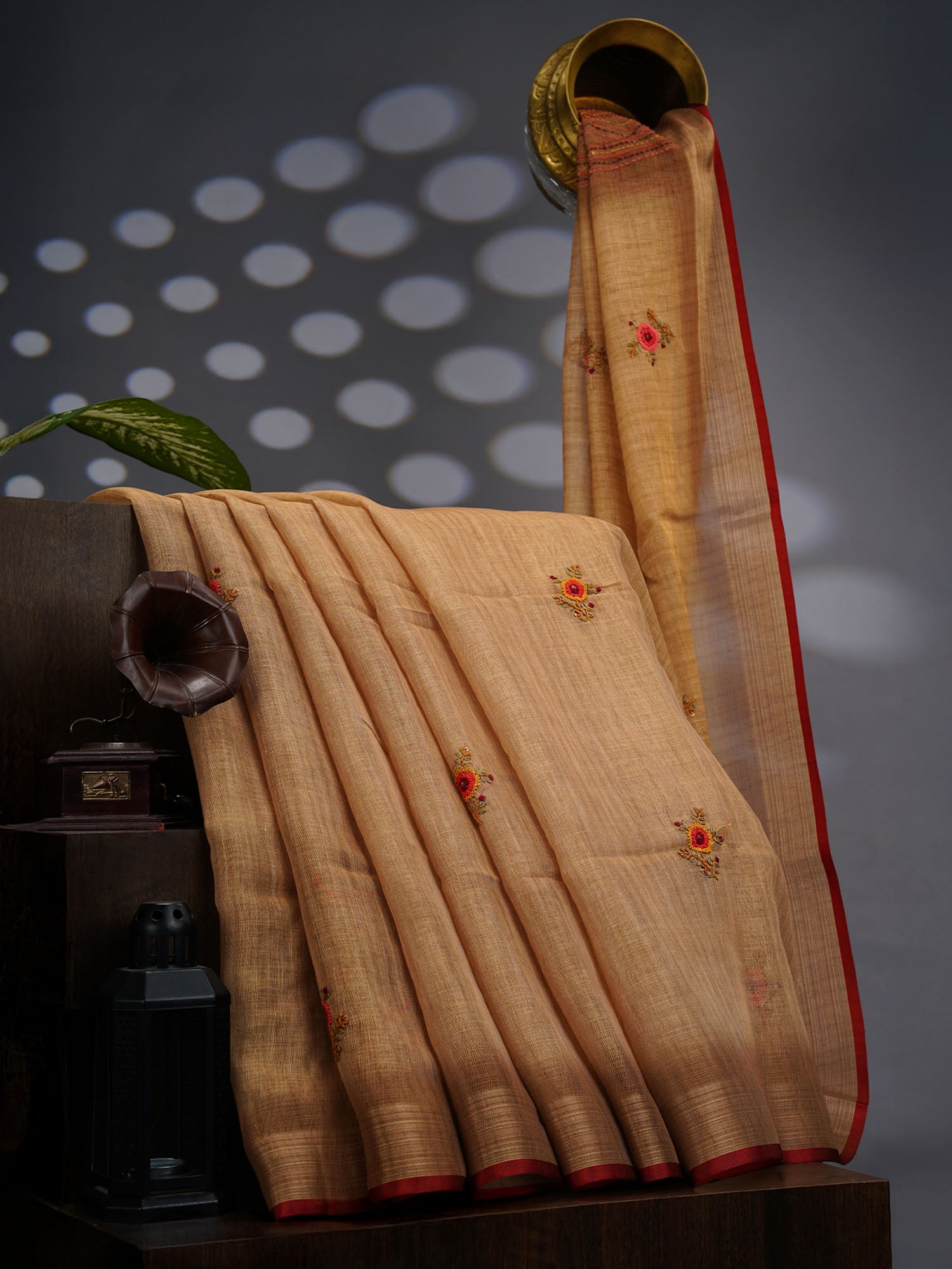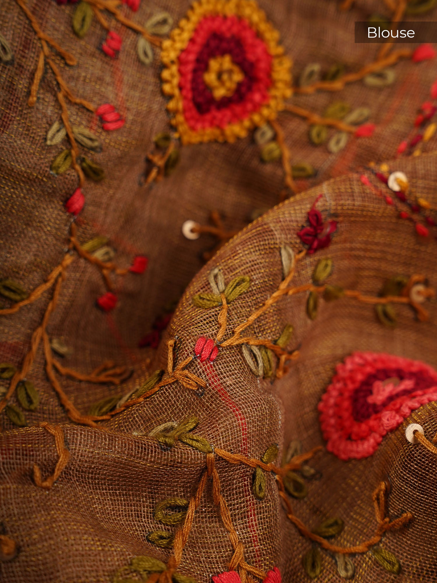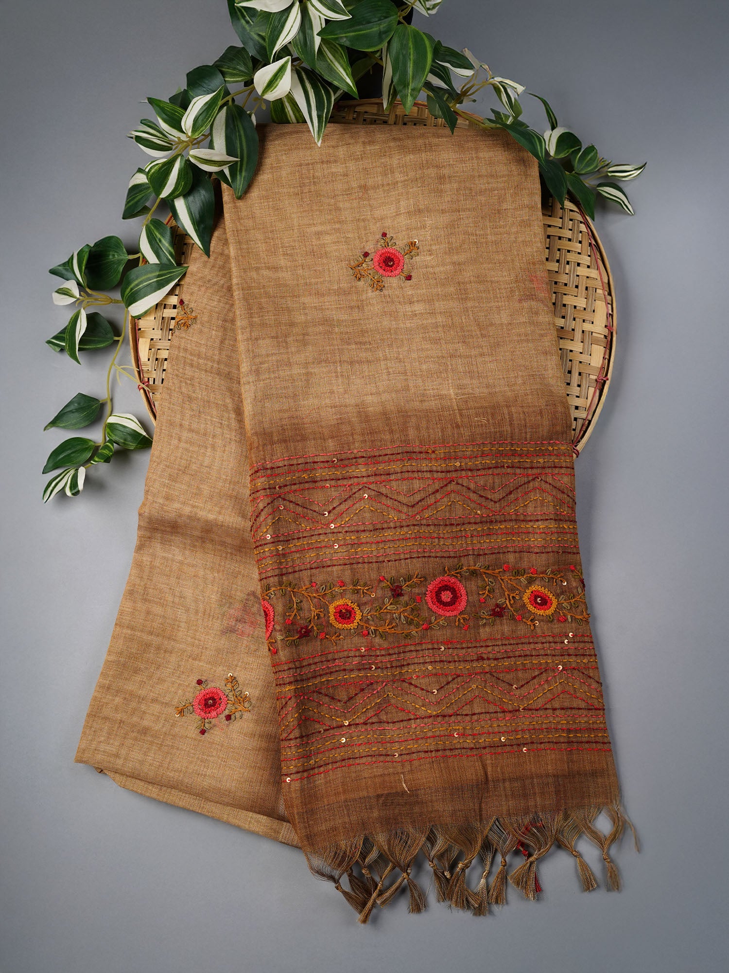 Drape yourself in understated elegance with this menthi green tissue linen saree, where traditional kantha embroidery meets contemporary charm. The delicate hand-stitched kantha work adds texture and soul to the lightweight fabric, perfect for those warm days when you want comfort without compromising on style. The striking contrast border frames the saree beautifully, creating visual interest that works for both casual gatherings and semi-formal occasions. Tissue linen's breathable nature keeps you cool while its subtle sheen catches the light just right. A modern twist on timeless craftsmanship that celebrates the art of slow fashion.