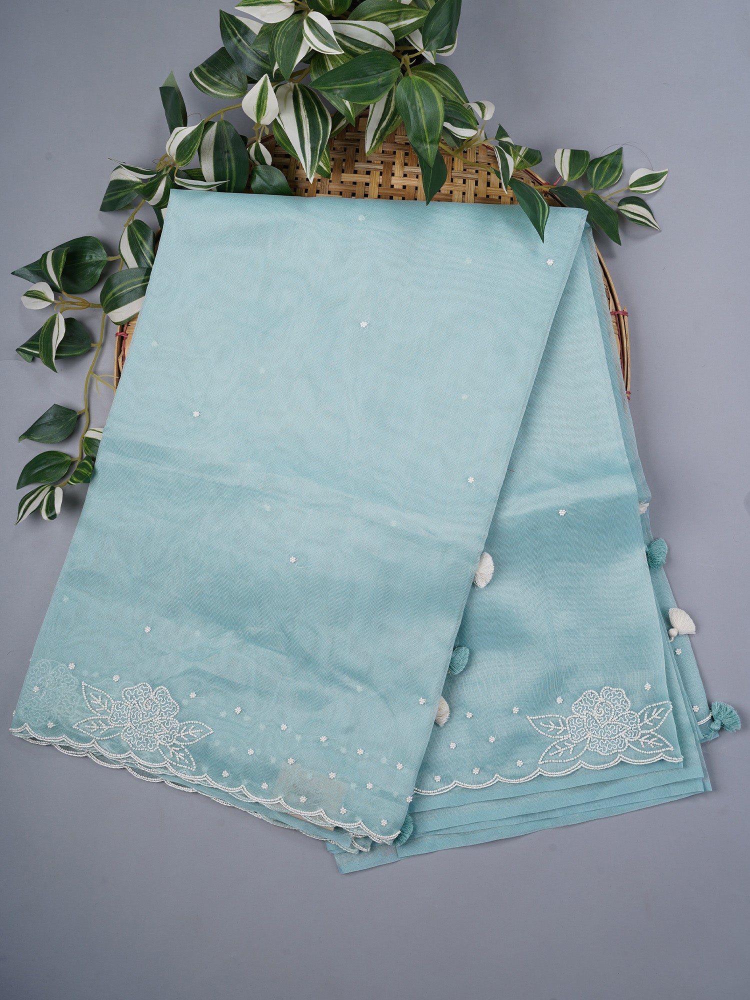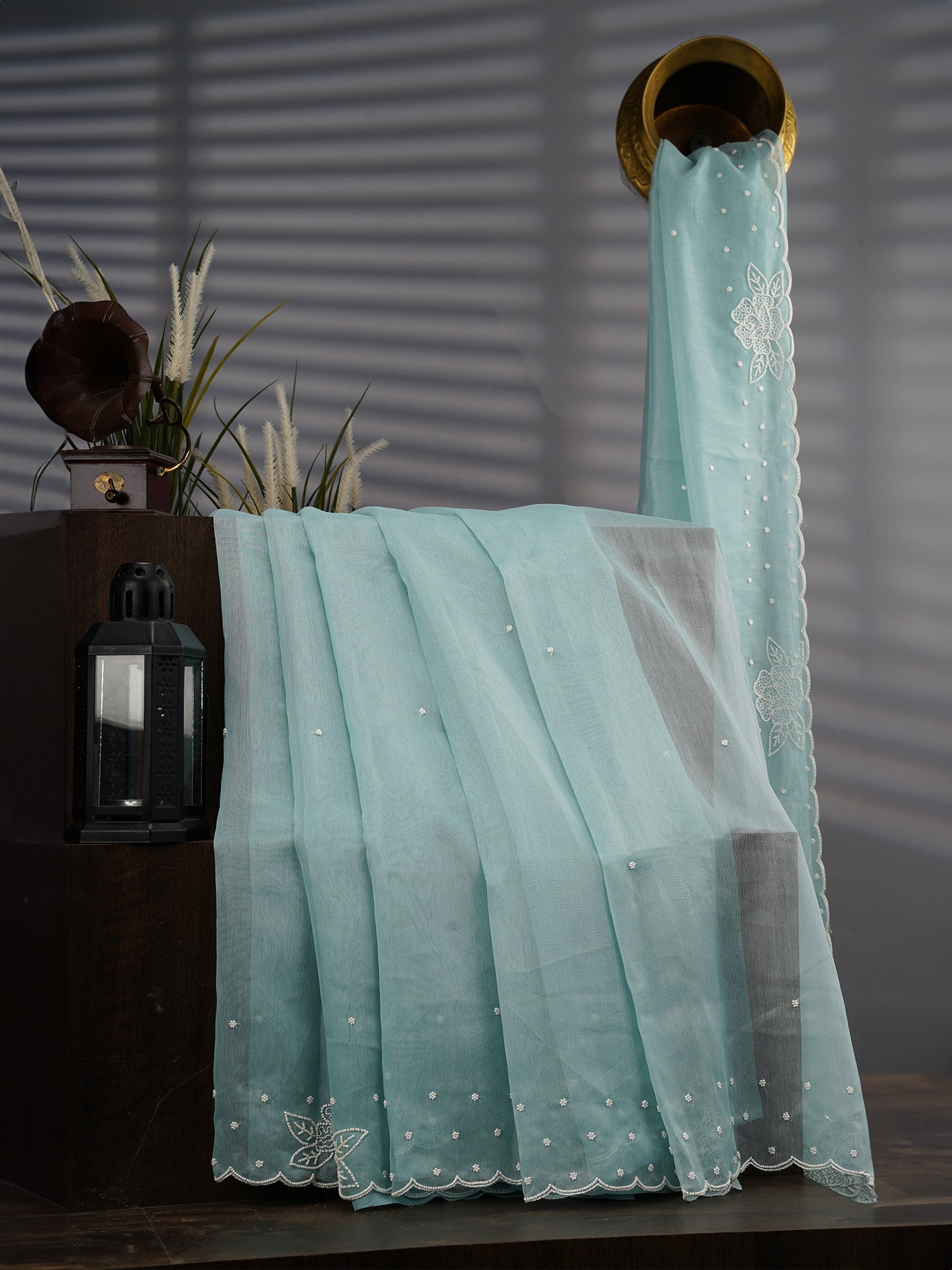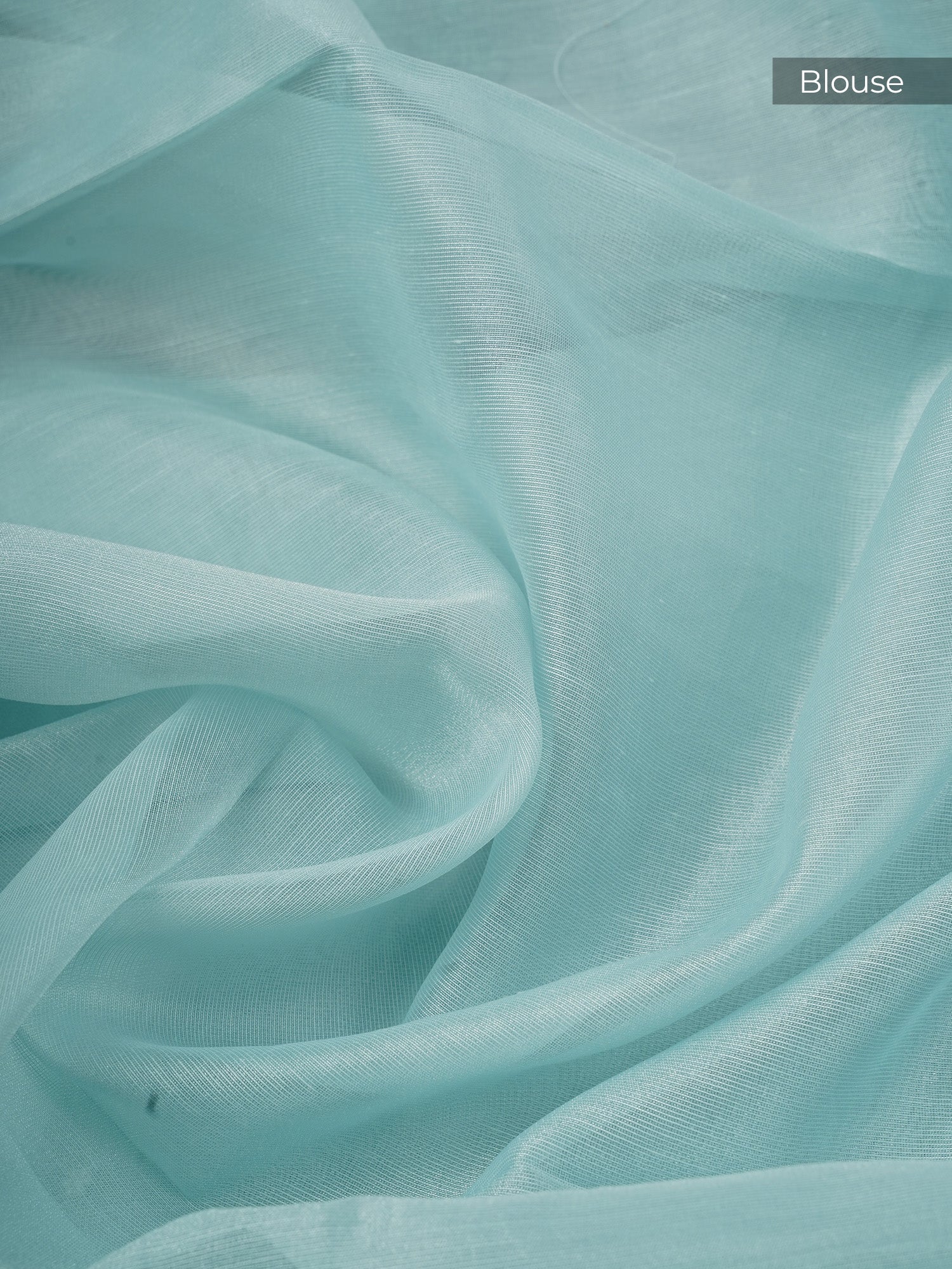 Drape yourself in ethereal elegance with this stunning tissue linen saree that whispers sophistication. The delicate scallop border adorned with intricate pearl work adds a touch of timeless glamour, while the soft mint blue hue brings a refreshing, contemporary twist to traditional wear. Perfect for celebrations, weddings, or whenever you want to turn heads with understated luxury. The lightweight tissue linen ensures comfort without compromising on style, making this saree your go-to choice for making a graceful statement.