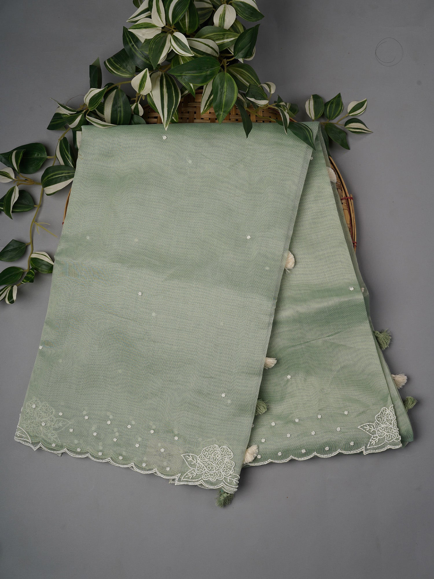 Drape yourself in mint magic with this tissue linen saree that's equal parts elegance and whimsy. The delicate scallop border...