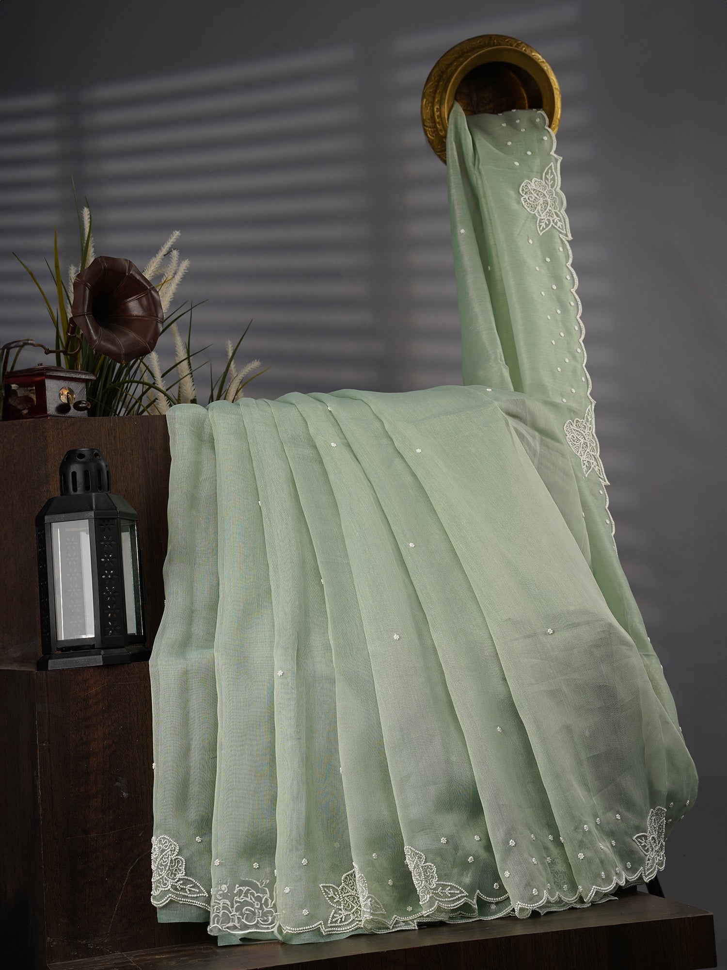 Tissue Linen Saree With Scallop Border With Pearl Work - Mint Green