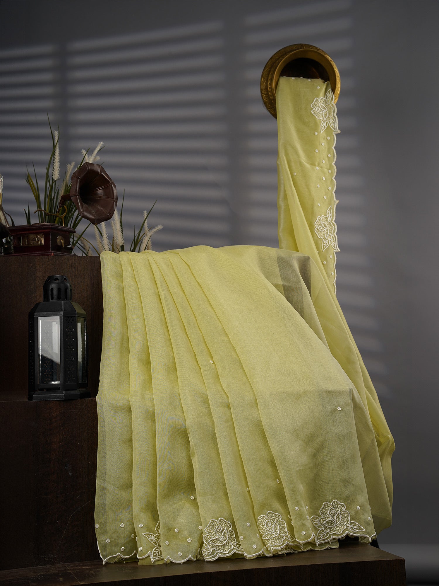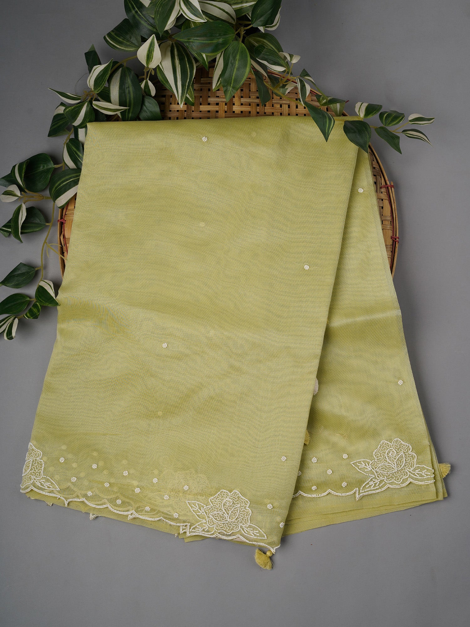 Tissue Linen Saree With Scallop Border With Pearl Work - P Green