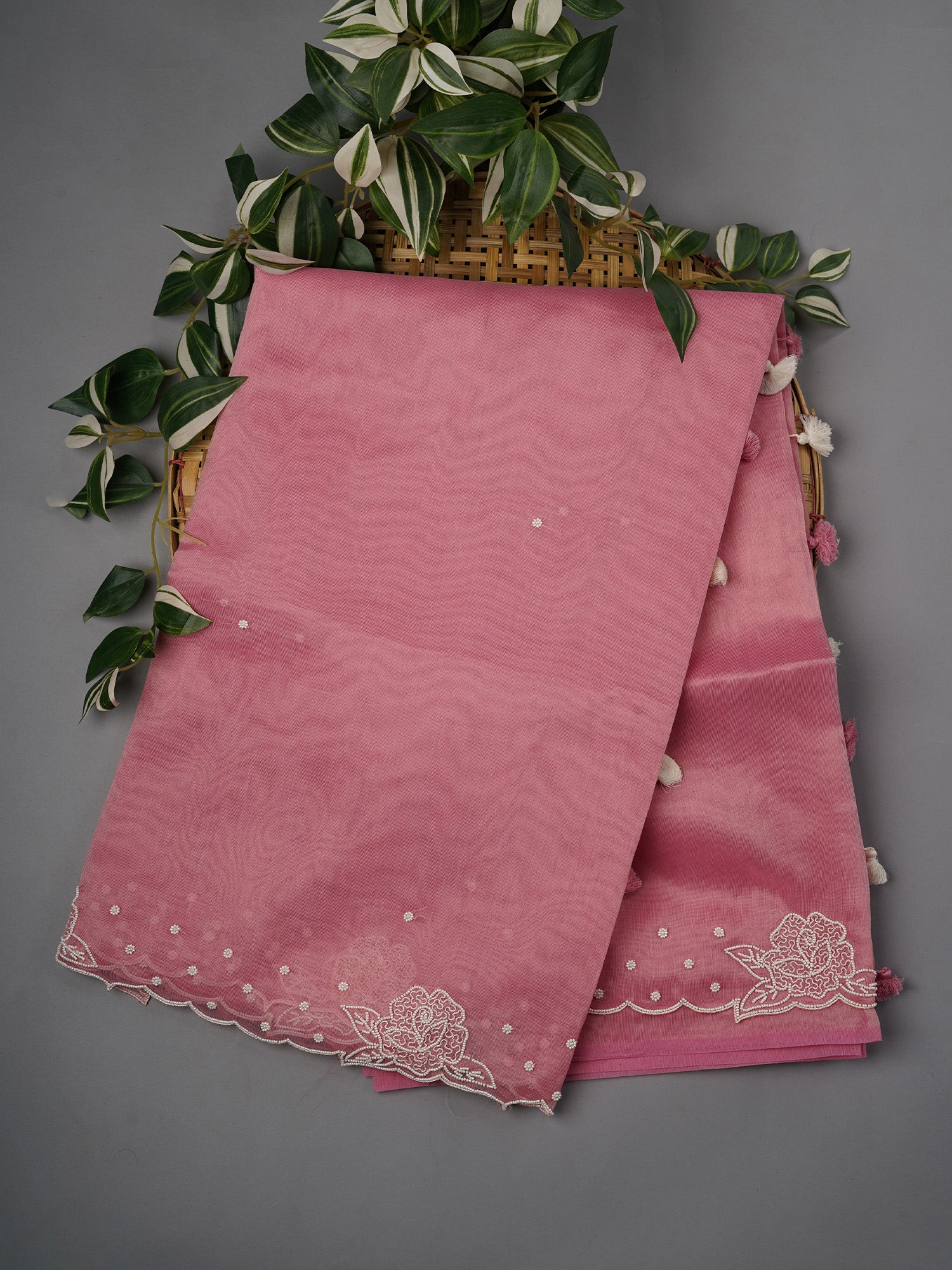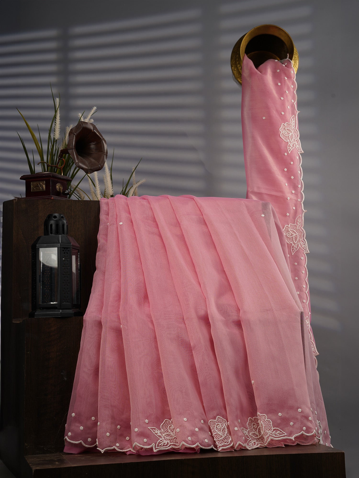 Tissue Linen Saree With Scallop Border With Pearl Work - Pink