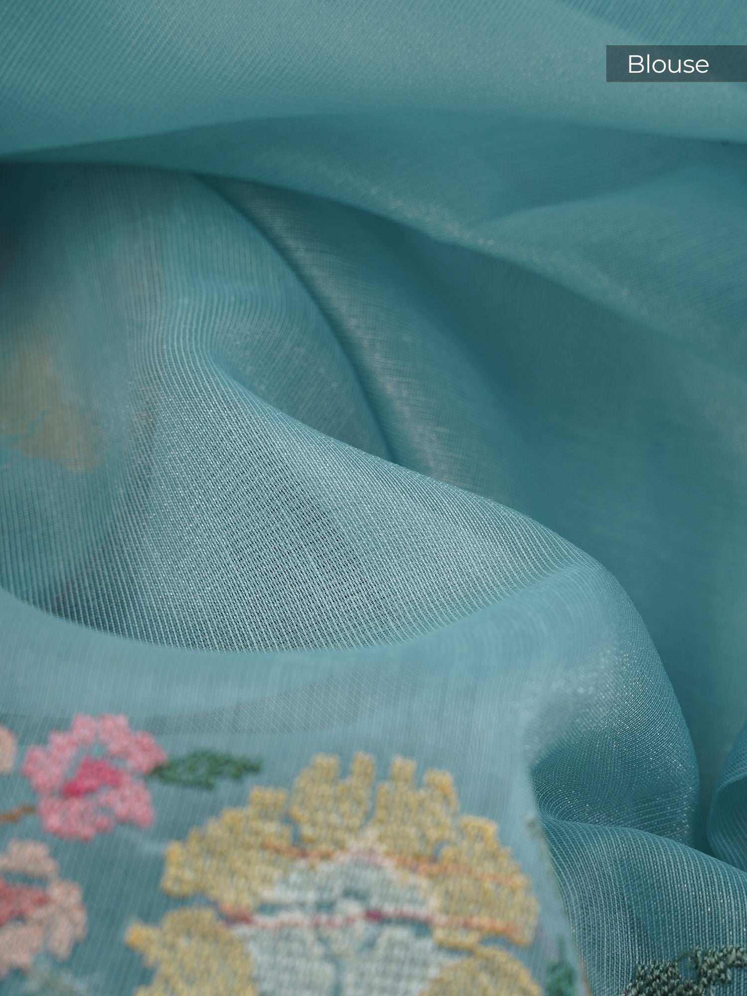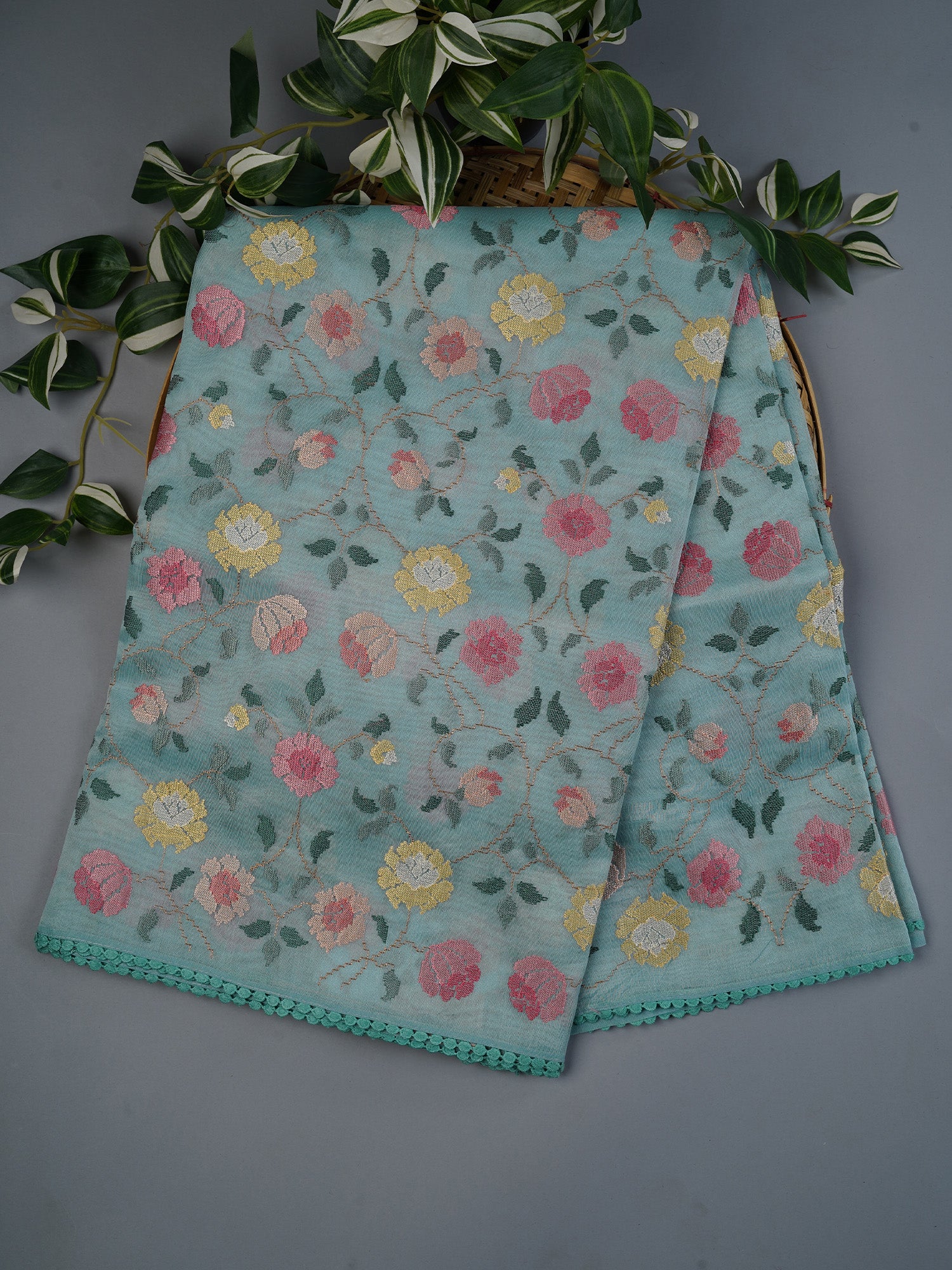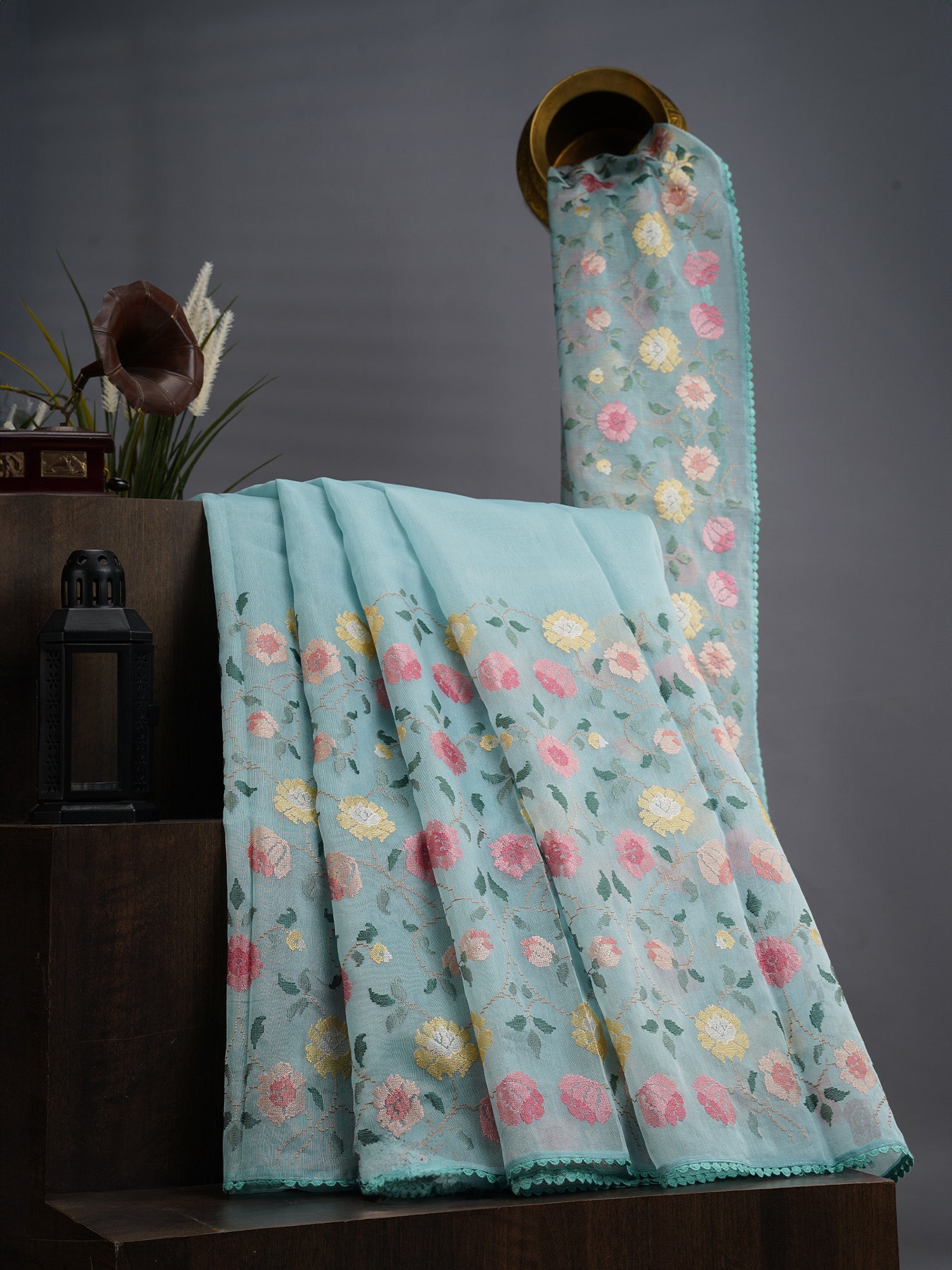 Tissue Linen Saree With Thread Embroidery with Lace Border - Light Blue