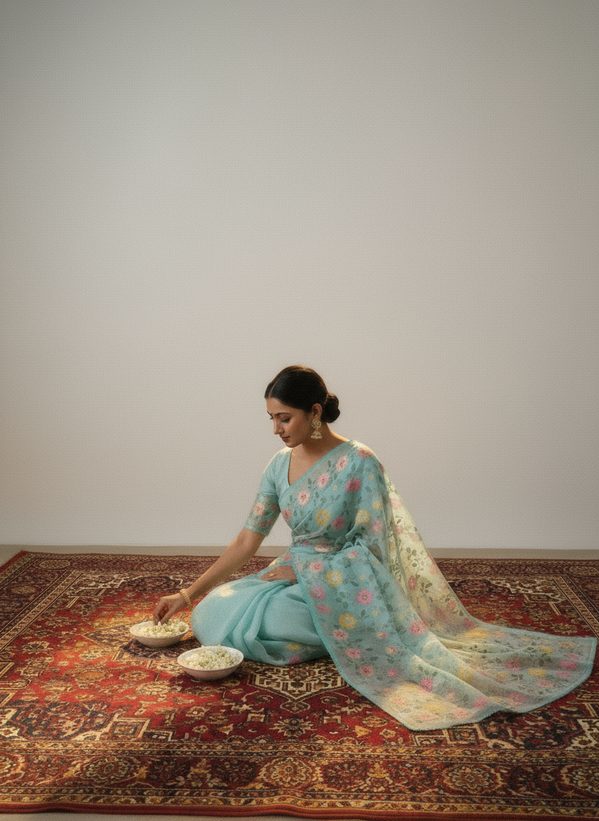 Drape yourself in ethereal elegance with this stunning tissue linen saree that whispers sophistication. The delicate light blue hue creates...