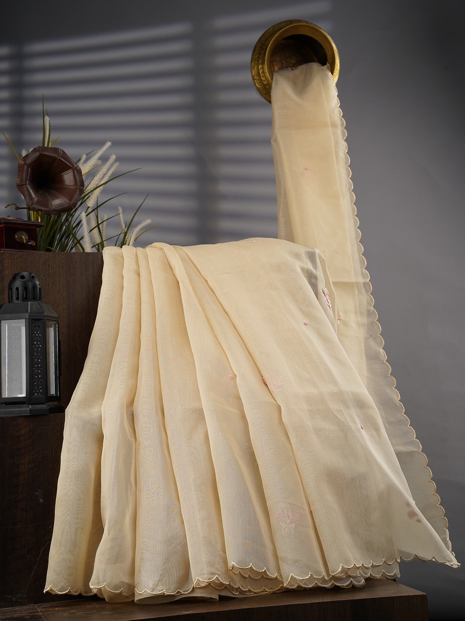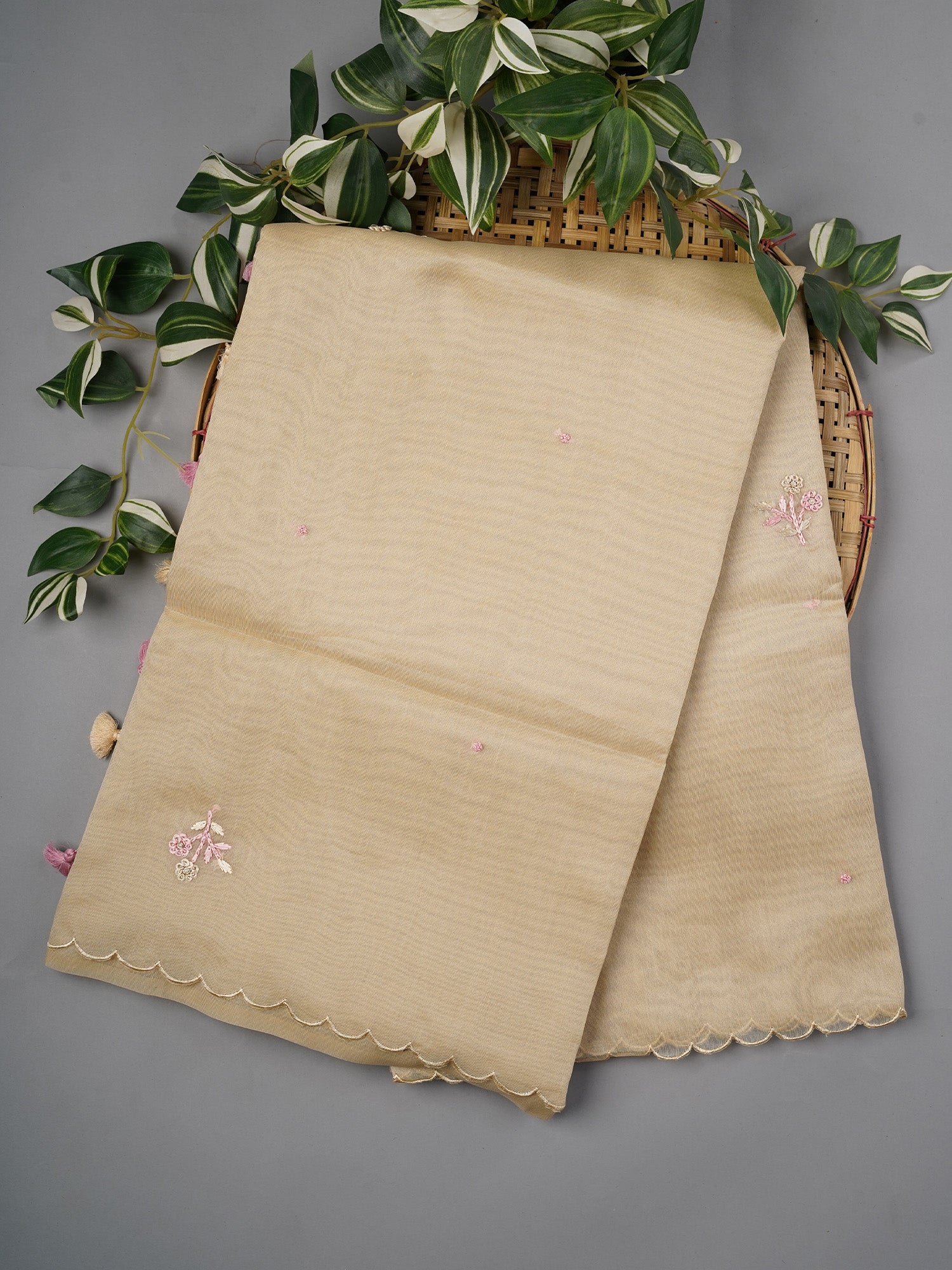 Elevate your ethnic wardrobe with this stunning tissue linen saree that's equal parts elegance and charm. The delicate thread knot work butties add intricate texture and visual interest, while the scalloped border frames the piece with refined detail. Crafted in a versatile beige tone, it's the perfect canvas for your personal style—whether you're heading to a celebration or making a statement at everyday gatherings. Lightweight and breathable, this saree promises comfort without compromising on sophistication. A timeless piece that deserves a spot in every saree lover's collection.