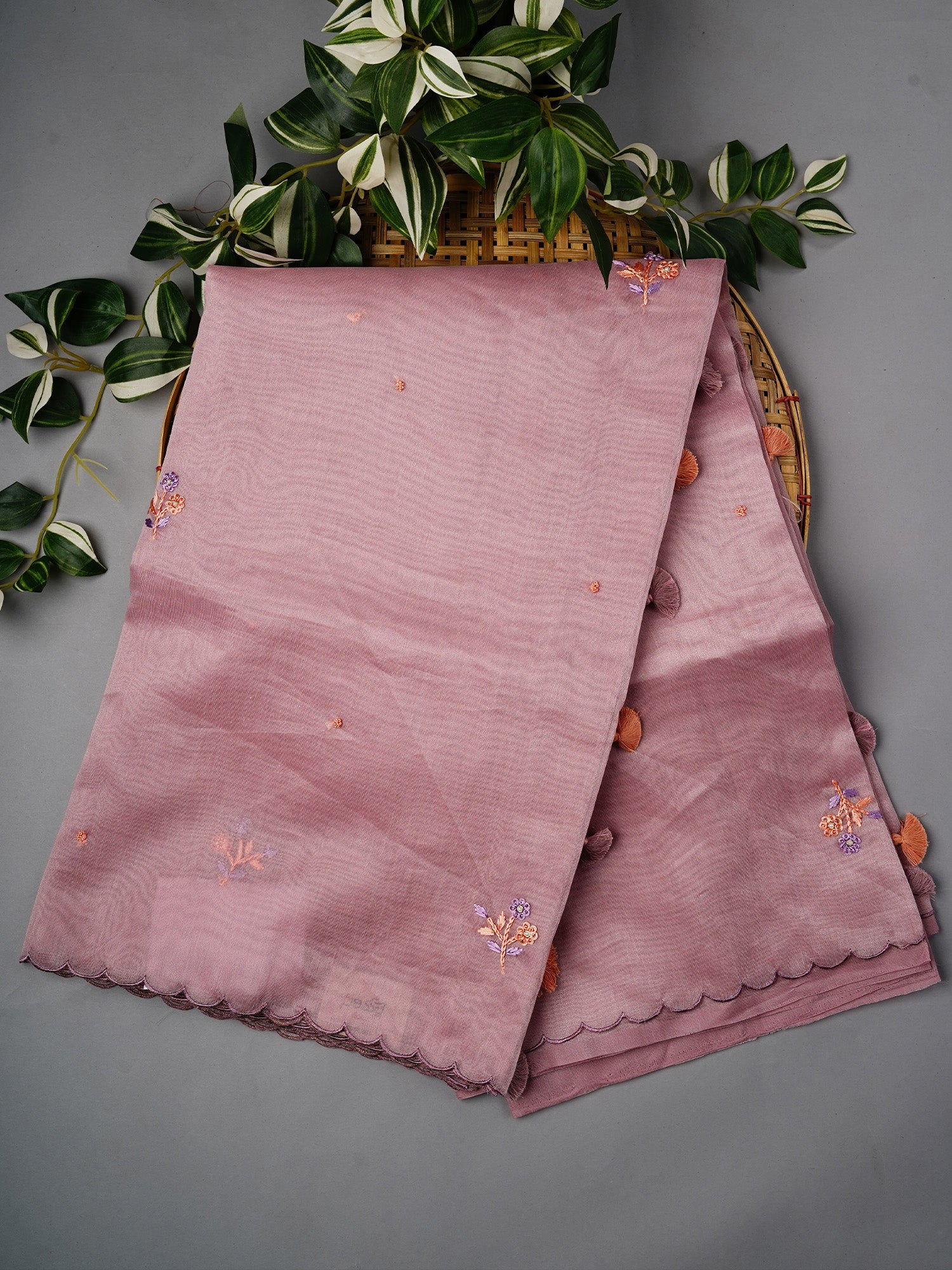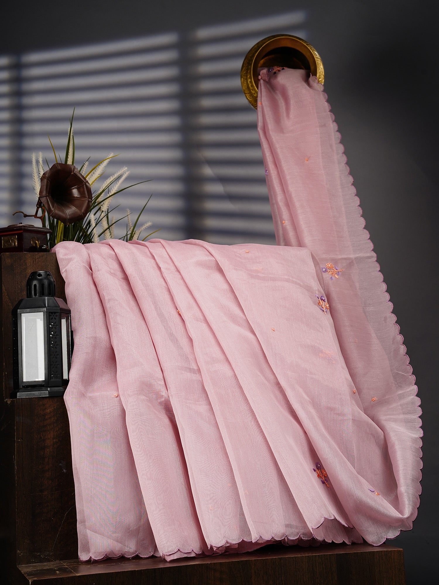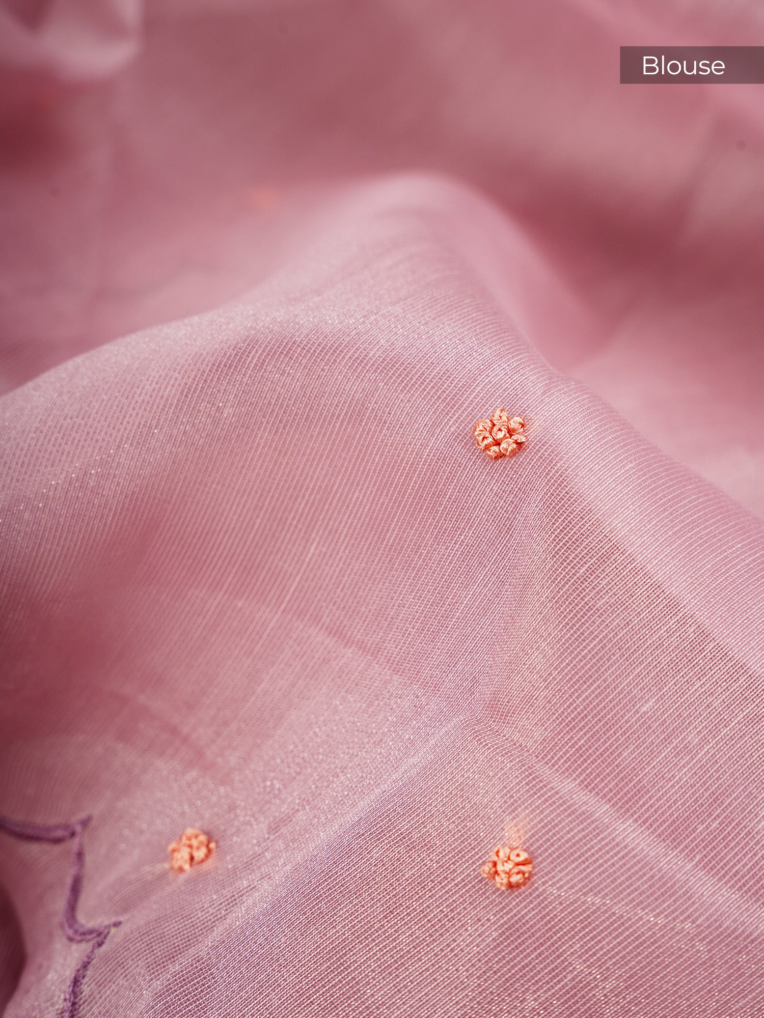 Tissue Linen Saree With Thread Knot Work Butties With Scallop Border - Light Lavender