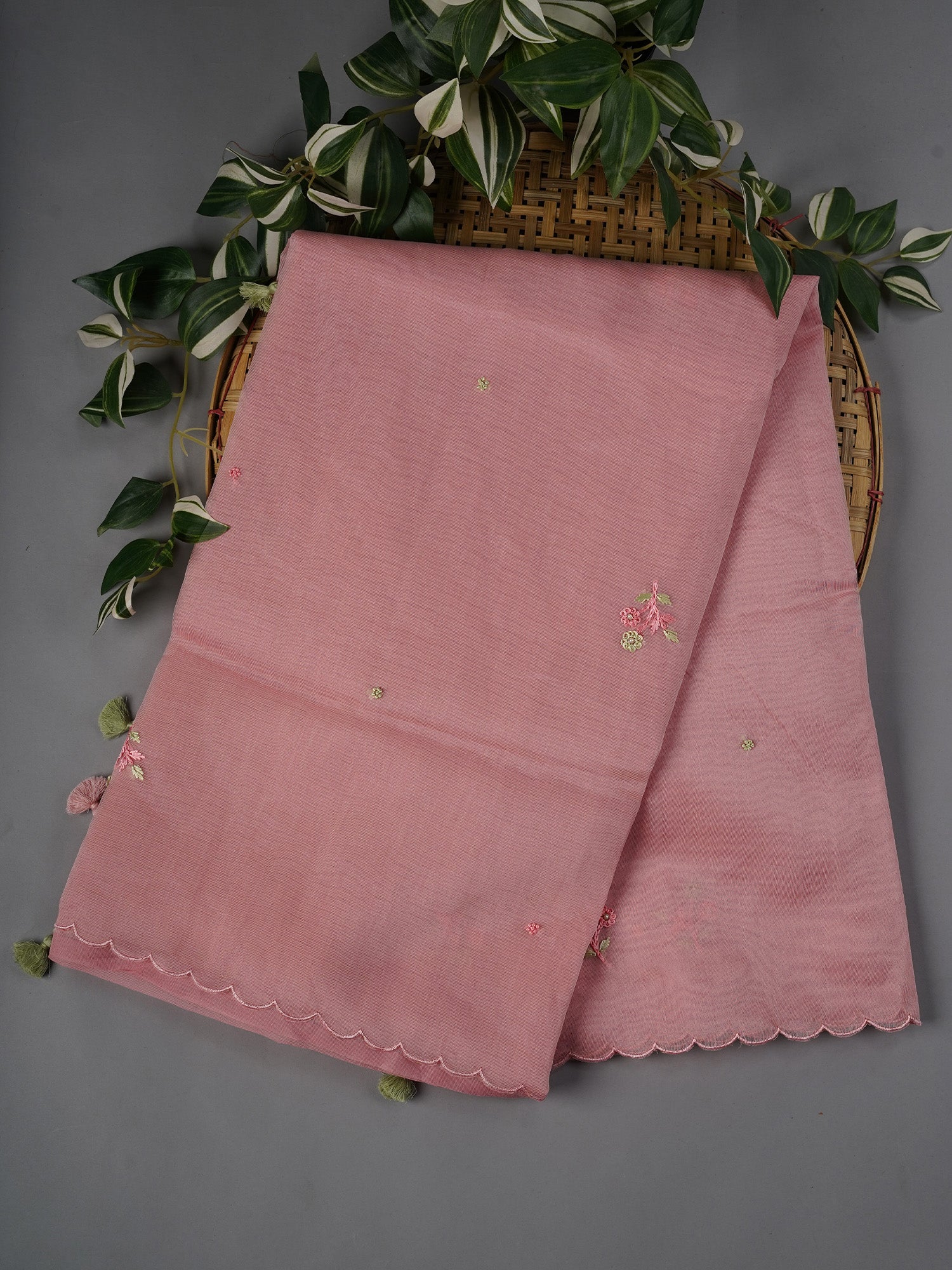 Tissue Linen Saree With Thread Knot Work Butties With Scallop Border - Light Pink
