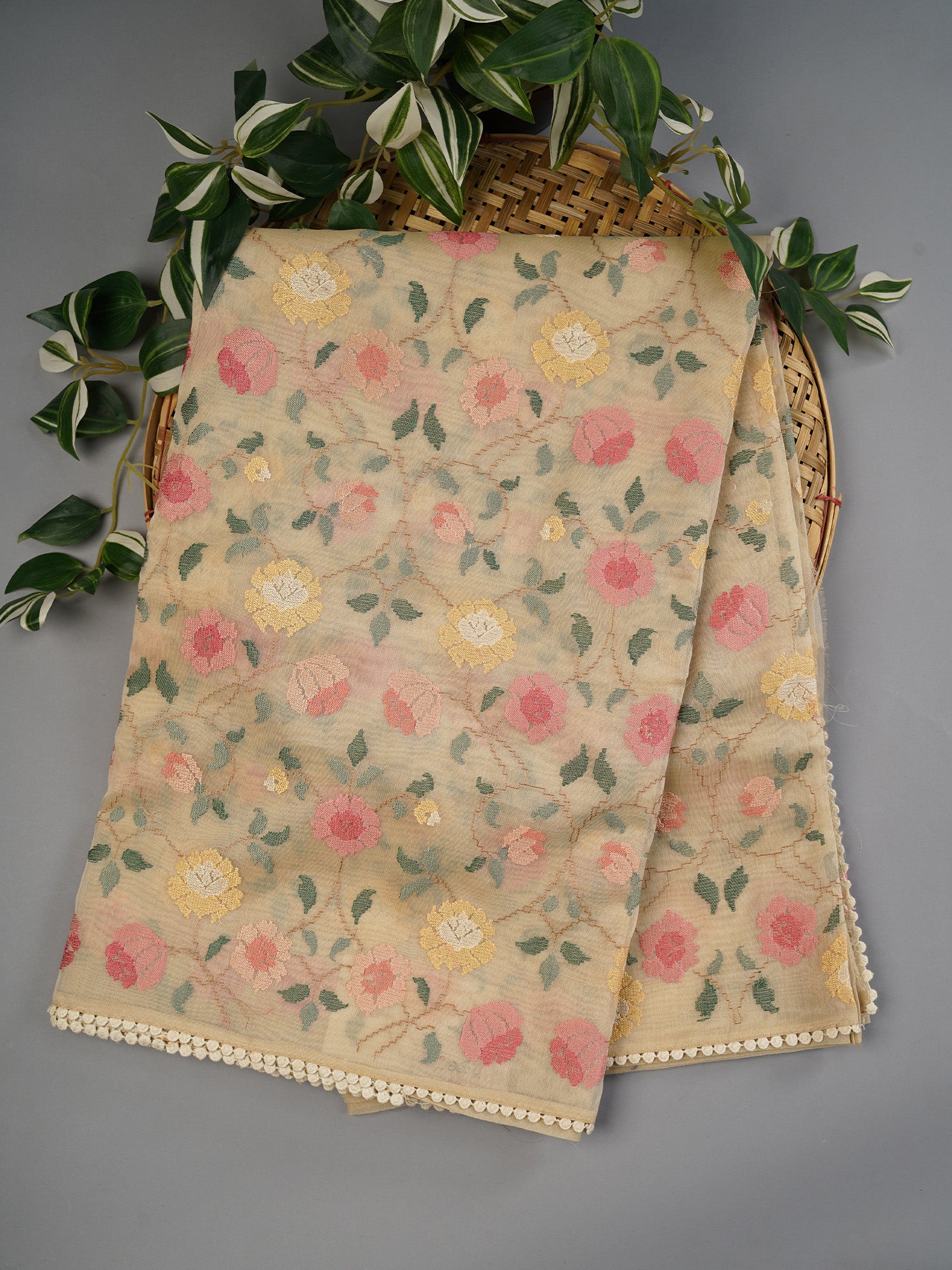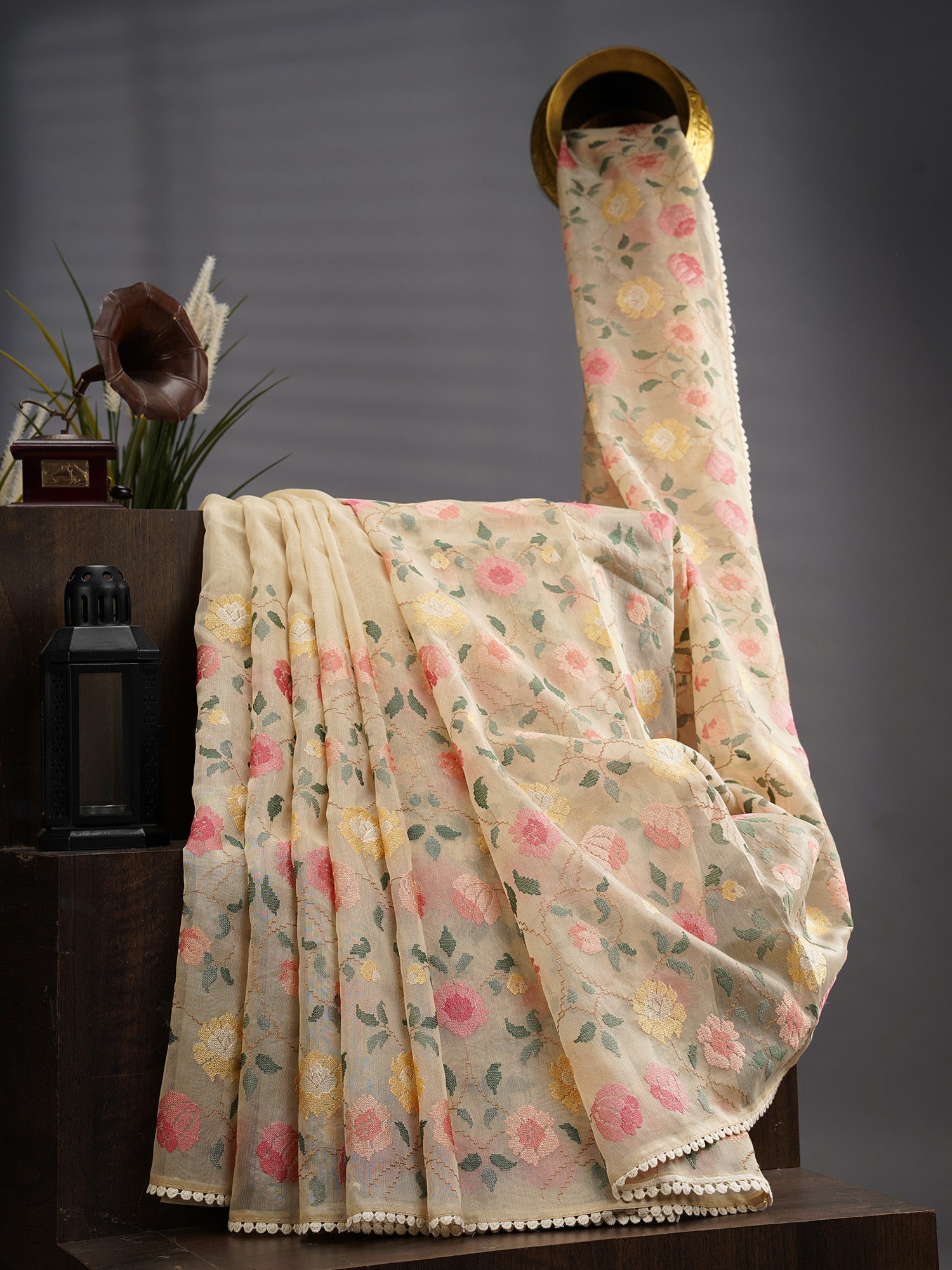 Drape yourself in elegance with this stunning tissue linen saree that's as light as a whisper! Featuring delicate thread embroidery that catches the eye and a gorgeous lace border that adds just the right amount of glamour, this beige beauty is perfect for those who love understated sophistication with a playful twist. The breathable linen fabric keeps you cool and comfortable all day long, while the intricate embroidery details make you feel like the star of any occasion. Whether it's a casual gathering or a special celebration, this saree effortlessly blends comfort with timeless charm.